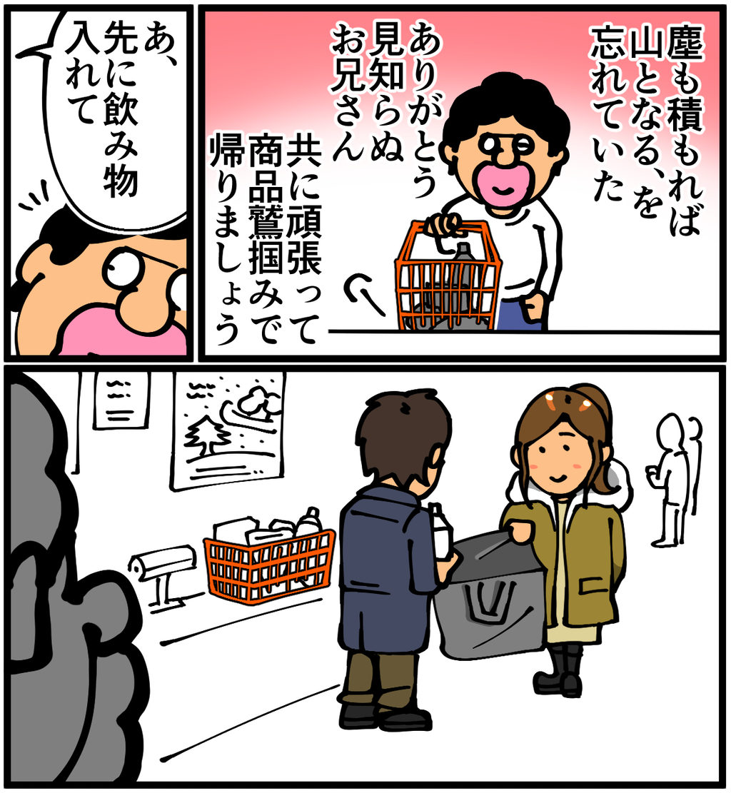 第614話「袋要りません」 2020年12月24日 家賃3万円の6帖アパートでカツカツな生活を送る男の漫画ブログです。金が底を尽きてくたばるようなことがなければ毎日更新します。素敵なイブでした。●お知らせ●あつ森プレイ日記更新しました。こっちの世界ではクリスマスを満喫してます。●Twitterやってます。●登録していただくと更新通知がLINEで届きます↓ 「絵日記」カテゴリの最新記事 < 前の記事次の記事 > コメント コメント一覧 (61) 1. スズメ 2020年12月24日 22:44 ワイルド過ぎます先生 0 taikutsu_ken がしました 22. 退屈健 2020年12月25日 23:05 >>1 イブなのでワイルドにいきました!笑 0 taikutsu_ken がしました 2. トナカイ 2020年12月24日 22:44 同じようなコト、やってます😆 0 taikutsu_ken がしました 23. 退屈健 2020年12月25日 23:06 >>2 おおお、同志(?)でしたか! 0 taikutsu_ken がしました 3. 迷走さん 2020年12月24日 22:46 先生カッコよすぎます 0 taikutsu_ken がしました 24. 退屈健 2020年12月25日 23:06 >>3 ありがとうございます!笑 0 taikutsu_ken がしました 4. わかにゃん 2020年12月24日 22:47 そんな日もありますよ👍 0 taikutsu_ken がしました 25. 退屈健 2020年12月25日 23:07 >>4 そんな日もありますね! 0 taikutsu_ken がしました 5. 梨 2020年12月24日 22:47 元気出ました 0 taikutsu_ken がしました 26. 退屈健 2020年12月25日 23:07 >>5 本当ですか、それはなによりです!笑 0 taikutsu_ken がしました 6. sage 2020年12月24日 22:52 最後のコマすき 0 taikutsu_ken がしました 27. 退屈健 2020年12月25日 23:07 >>6 ありがとうございます!笑 0 taikutsu_ken がしました 7. mou 2020年12月24日 22:53 手にしたブロッコリーが心なしかツリーに見えます メリークリスマス 0 taikutsu_ken がしました 28. 退屈健 2020年12月25日 23:08 >>7 手持ちツリーと考えたらアリですね!笑 0 taikutsu_ken がしました 8. な 2020年12月24日 22:59 エコバッグ…買いましょ…… 0 taikutsu_ken がしました 29. 退屈健 2020年12月25日 23:08 >>8 買うべきですね…! 0 taikutsu_ken がしました 9. A 2020年12月24日 23:06 ワイルド先生メリクリです 買い物袋有料化、来年には滅んでいますように 0 taikutsu_ken がしました 30. 退屈健 2020年12月25日 23:08 >>9 メリクリです!また無料化してほしいですね…! 0 taikutsu_ken がしました 10. ペドロ 2020年12月24日 23:24 今日はイルミネーションのネタになると思ってました。 数百円のエコバッグで、袋100枚とか買えちゃいますからね。 ゴミ袋としても使うなら、買ってた方がお得なのでは? 0 taikutsu_ken がしました 31. 退屈健 2020年12月25日 23:10 >>10 イルミネーションは結局全然見られませんでした…! 確かにそう考えるとお得かもですね! 0 taikutsu_ken がしました 61. 小手毬 2021年12月15日 20:51 >>10 そうです! 結局、ゴミ袋は別に買うんですから!!(笑) 0 taikutsu_ken がしました 11. なめこ 2020年12月24日 23:29 職質されませんでしたか?😱 0 taikutsu_ken がしました 32. 退屈健 2020年12月25日 23:10 >>11 すれ違わなかったのでセーフでした! 0 taikutsu_ken がしました 12. 2020年12月25日 00:06 エコバッグ買うより袋をその都度買った方が絶対環境にも経済的にも良いと思います🤚 0 taikutsu_ken がしました 33. 退屈健 2020年12月25日 23:11 >>12 今後も買い続けると思います!笑 0 taikutsu_ken がしました 13. 多忙 2020年12月25日 02:35 ブロッコリーの持ち方が松明みたいです!笑 0 taikutsu_ken がしました 34. 退屈健 2020年12月25日 23:11 >>13 松明感ありますね!笑 0 taikutsu_ken がしました 14. 鳥土竜 2020年12月25日 03:08 10分の1素パスタ浮きましたね! 0 taikutsu_ken がしました 35. 退屈健 2020年12月25日 23:11 >>14 10回繰り返してようやく1素パスタと考えると微妙ですね!笑 0 taikutsu_ken がしました 15. とくめい 2020年12月25日 05:16 「袋、いりません」のドヤ顔好き 0 taikutsu_ken がしました 36. 退屈健 2020年12月25日 23:12 >>15 渾身のどや顔でした!笑 0 taikutsu_ken がしました 16. ななし 2020年12月25日 05:36 白T1枚で寒くないですか?(そこ? 0 taikutsu_ken がしました 37. 退屈健 2020年12月25日 23:12 >>16 指先が寒いです!(末端冷え性) 0 taikutsu_ken がしました 17. みり子 2020年12月25日 05:43 鍵、開けられました?ww 0 taikutsu_ken がしました 38. 退屈健 2020年12月25日 23:12 >>17 手間取りました!笑 0 taikutsu_ken がしました 18. くまさん 2020年12月25日 07:28 メリクリです。先生に、『あ、先にコーヒー入れて』ってエコバッグ差し出してくれる人が現れますように。 0 taikutsu_ken がしました 39. 退屈健 2020年12月25日 23:13 >>18 メリクリです~!そんな人に出会えるよう頑張ります!笑 0 taikutsu_ken がしました 19. ななし 2020年12月25日 09:04 先生……なんでそんなにポンコツなんですか……(褒めてる) 0 taikutsu_ken がしました 40. 退屈健 2020年12月25日 23:14 >>19 生粋のポンコツです!笑 0 taikutsu_ken がしました 20. 名無し丸 2020年12月25日 10:09 悲しすぎないか? 0 taikutsu_ken がしました 41. 退屈健 2020年12月25日 23:14 >>20 悲しみでした!笑 0 taikutsu_ken がしました 21. むむむ 2020年12月25日 22:10 悲しすぎるw 私は普通にビニール袋貰います エコバッグ持ってくのがめんどくさい🙄 (てゆーか忘れる) 0 taikutsu_ken がしました 42. 退屈健 2020年12月25