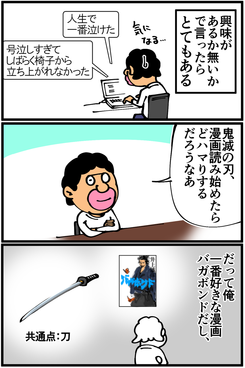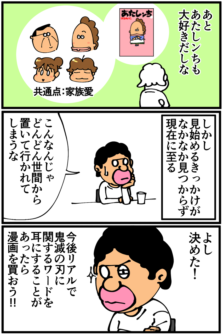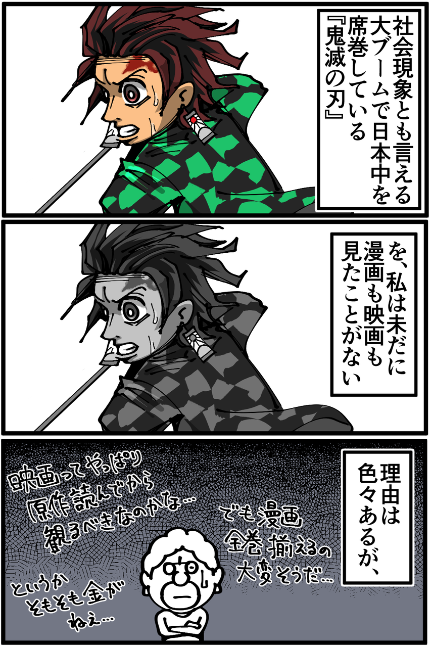 第643話「流行に乗りたい」 2021年01月27日 家賃3万円の6帖アパートでカツカツな生活を送る男の漫画ブログです。金が底を尽きてくたばるようなことがなければ毎日更新します。家を出てから約1分という早さ。普通の道路を歩いていてこんなにハッキリと耳にするとは思ってませんでした。観察してると炭治郎役を名乗り出た少年が他の子を追いかけているように見えたんですが、原作の炭治郎って誰かを追いかけ回す感じなんでしょうか。Mediassort一同にあたしンち検定を出題した時の話↓ ●Twitterやってます。●登録していただくと更新通知がLINEで届きます↓ 「絵日記」カテゴリの最新記事 < 前の記事次の記事 > コメント コメント一覧 (64) 1. Nutty 2021年01月27日 21:33 ワイはアニメ観たけど全くハマりませんでした〜 観ないと損するよ!っとか言うてくる人いまはキメハラって言うらしいですよ😂 0 taikutsu_ken がしました 34. 退屈健 2021年01月28日 20:49 >>1 おおお、そんなハラスメントが…!俺は流されやすいタイプなのでコロッと「なるほど観てみるか!」となってしまいそうです!笑 0 taikutsu_ken がしました 2. なめこ 2021年01月27日 21:36 何かすごい焦ってる炭治郎(笑) 画力はさすが‼️ 0 taikutsu_ken がしました 35. 退屈健 2021年01月28日 20:49 >>2 謎に焦ってますね!笑 ありがとうございます! 0 taikutsu_ken がしました 3. 大学生 2021年01月27日 21:37 自分もアニメは観ましたが漫画映画は観てないです!!安心してください(?) 0 taikutsu_ken がしました 36. 退屈健 2021年01月28日 20:50 >>3 そうなんですね!安心しました!笑 0 taikutsu_ken がしました 4. さつまりこ 2021年01月27日 21:39 あたしンちめちゃりんこ面白いですよね🎶 0 taikutsu_ken がしました 37. 退屈健 2021年01月28日 20:50 >>4 あたしンちは面白すぎますね~! 0 taikutsu_ken がしました 5. なめたけ 2021年01月27日 21:41 「というかそもそも金がねぇ…」 めっちゃ分かりますw 私も結局金がないんで気にはなるけど読んでない感じですわ。 0 taikutsu_ken がしました 38. 退屈健 2021年01月28日 20:50 >>5 金と本棚があったら買ってました!笑 0 taikutsu_ken がしました 6. きつめのヤバい 2021年01月27日 21:47 オイラはまりました オッサンなのに(笑) 既存のアニメシリーズなら無料で観ることができるかも 柔らかに「オヌヌメ」です😉 0 taikutsu_ken がしました 39. 退屈健 2021年01月28日 20:51 >>6 えっ、無料で!それは是非観てみたいですね~! 0 taikutsu_ken がしました 7. パクじ 2021年01月27日 21:57 私もめっちゃハマった口です😁 映画をいきなり観ても大丈夫ですよ~❗️ 私は6回観に行って、毎回号泣しました😂 0 taikutsu_ken がしました 40. 退屈健 2021年01月28日 20:52 >>7 原作観なくても大丈夫なんですね! 6回行かれて毎回号泣!それは凄い! 0 taikutsu_ken がしました 8. JIM 2021年01月27日 22:04 人って爆発的ブームに乗り遅れると無理になる場合が多いです。 本当は素で見たら感動して楽しいのに 他人に感動するよ、楽しいよ、って言われてから観ると 勝手に作品を過大評価しすぎてから観ることになるので、 大した事ないって感じる訳ですね。ちなみに自分も鬼滅観てないっすけど 今更観ても適正な評価ができないんで、観ないと思います。 みんな評価してるもんは面白いっては分かってます。 0 taikutsu_ken がしました 41. 退屈健 2021年01月28日 20:53 >>8 確かに、期待値のハードルはこれ以上無いレベルで上がりきってしまっている感はありますね! もし観る機会がきたらフラットな目線で観られるように頑張って気持ちを抑えようと思います…!笑 0 taikutsu_ken がしました 9. スズメ 2021年01月27日 22:08 王道少年漫画で面白かったです。 あえて原作をチェックせずに映画を観て、レポート記事を書くとかいかがでしょう?w 0 taikutsu_ken がしました 42. 退屈健 2021年01月28日 20:54 >>9 原作観ずに映画から観るのもアリかもですね~! 0 taikutsu_ken がしました 10. 2021年01月27日 22:11 先生あたしンチの絵めちゃめちゃそっくり!うま! 0 taikutsu_ken がしました 43. 退屈健 2021年01月28日 20:54 >>10 本当ですか!ありがとうございます!! 0 taikutsu_ken がしました 11. 米粉餅 2021年01月27日 22:14 「“退屈だからスラムダンクの漫画をダラダラ描いてみた”って漫画が面白いよ!」って言われて、気乗りせず読んだら死ぬほど面白かったという僕のような例もあります。 0 taikutsu_ken がしました 44. 退屈健 2021年01月28日 20:55 >>11 懐かしい…!笑 読んでいただけて嬉しい限りです、ありがとうございます! 0 taikutsu_ken がしました 12. ふーみー 2021年01月27日 22:29 私も、漫画もアニメも観たことないです。 退屈先生のブログが書籍化されて、アニメになって映画になったら観に行きます❗️ 印税で鬼滅の刃を買ってください(笑) 0 taikutsu_ken がしました 18. なめこ 2021年01月27日 23:06 >>12 ドラマの聖☆おにいさんみたいな感じになるのでしょうか。 0 taikutsu_ken がしました 45. 退屈健 2021年01月28日 20:55 >>12 映画化されたら「冴えないオッサンがアパートでダラダラ過ごしていたとさ」の数秒でエンドロールが流れますね!笑 0 taikutsu_ken がしました