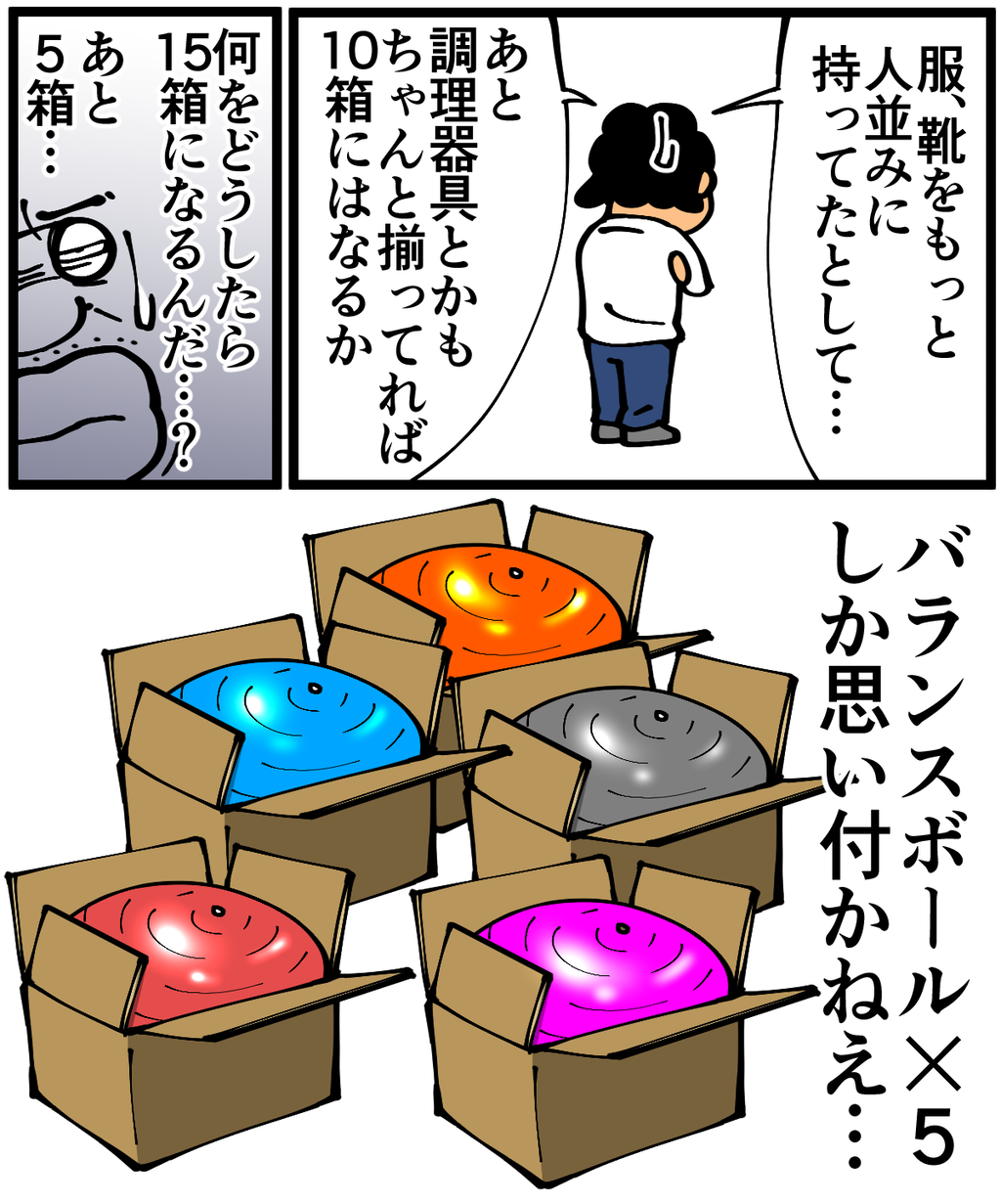 第690話「引っ越しに使うダンボールの数」 2021年03月19日 安アパートでカツカツな生活を送る男の漫画ブログです。金が底を尽きてくたばるようなことがなければ毎日更新します。少ないなら少ないで別にいいのかもしれないけど、あまりにも平均を下回ってると不安になりますね。皆さん何をそんなにたくさん持ってるんだ!というかバランスボールはダンボールに詰めないか。●Twitterやってます。●登録していただくと更新通知がLINEで届きます↓ 「絵日記」カテゴリの最新記事 < 前の記事次の記事 > コメント コメント一覧 (48) 1. マーシー 2021年03月19日 20:32 家宅捜索に入った警察は 押収するものが何もなくても 空の段ボールを持って出てくるそうです。 そうしてみてはいかがでしょうか笑 0 taikutsu_ken がしました 24. 退屈健 2021年03月20日 22:34 >>1 そうなんですか!見栄を張って空のダンボールを20箱くらい用意しておけばよかったかもですね!(迷惑) 0 taikutsu_ken がしました 2. ひまわり 2021年03月19日 20:38 最近はミニマリストの方も多くいらっしゃいますからね。必要最低限の持ち物で暮らせているのは却って『おしゃれ』だと思われますよ。 0 taikutsu_ken がしました 25. 退屈健 2021年03月20日 22:34 >>2 ところが俺の場合は単なる「買う金が無い」という問題ゆえの物の少なさなのでオシャレとは程遠く…!笑 0 taikutsu_ken がしました 3. ななひ 2021年03月19日 20:43 こんな少ない荷物だけでも生きていけるマウントを取りながら生きていきましょ!! バランスボールは素で運んだ方がシュールで面白いと思いますよ() 0 taikutsu_ken がしました 26. 退屈健 2021年03月20日 22:35 >>3 確かに、あのまま素で運ぶのは面白い画になるかもですね!笑 0 taikutsu_ken がしました 4. なめこ 2021年03月19日 20:53 夜逃げしやすいと思えば……。 0 taikutsu_ken がしました 27. 退屈健 2021年03月20日 22:35 >>4 まさかの夜逃げ前提!笑 0 taikutsu_ken がしました 5. ふう 2021年03月19日 20:54 残念ですがこのブログの読者のほとんどが「え、5箱もあるんだ」と思うことでしょう 0 taikutsu_ken がしました 28. 退屈健 2021年03月20日 22:36 >>5 正直、俺も「結構な数いったな!」と満足してしまいました!笑 0 taikutsu_ken がしました 6. うんち 2021年03月19日 20:55 いずれ一人暮らしする時のこと考えると、まずダンボールが頭をよぎります…笑 0 taikutsu_ken がしました 29. 退屈健 2021年03月20日 22:36 >>6 ダンボールは何にでも使える便利グッズです!笑 0 taikutsu_ken がしました 7. 退屈な名無しさん 2021年03月19日 20:58 放浪人か転勤の多い人の荷物の数 0 taikutsu_ken がしました 30. 退屈健 2021年03月20日 22:36 >>7 ある意味俺も放浪人なのかもしれません…!笑 0 taikutsu_ken がしました 8. 米粉餅 2021年03月19日 20:59 今流行りのキャンプには、ブッシュクラフトという分野があるそうです。 持ち物を極力減らし、そこいらへんに在る物でキャンプするスタイルです。 それなら「大きくジャンル分けすれば同じこと」だと言い張……説明できるんじゃないでしょうか。 0 taikutsu_ken がしました 31. 退屈健 2021年03月20日 22:38 >>8 おおお、そんなものがあるんですか! 「いやいや、ブッシュクラフト風の生活だから」と言い張ると一気にオシャレに聞こえて良いですね!笑 0 taikutsu_ken がしました 9. ぱいぱい 2021年03月19日 21:02 バランスボールは詰めないというか、膨らまして移動させないです笑 0 taikutsu_ken がしました 32. 退屈健 2021年03月20日 22:38 >>9 なるほど、空気は抜くんですね!笑 0 taikutsu_ken がしました 10. まー 2021年03月19日 21:35 あつ森の中の人より少なそう!笑 0 taikutsu_ken がしました 33. 退屈健 2021年03月20日 22:38 >>10 あつ森の方が150倍くらい物を多く持ってます!笑 0 taikutsu_ken がしました 11. うーろん 2021年03月19日 21:47 いいことだと思います。 5,6回以上は単身引越してますが、なぜか多くなって自分でもびっくりします。 捨てられないCDや本、着るかもしれない服、いつか使うかもしれないよく分からない書類etc……。 捨てる決断力が弱いんだと思ってます。使えないわけじゃないし……もしもの時のタメに……みたいな、先送りグセですね……😞 0 taikutsu_ken がしました 34. 退屈健 2021年03月20日 22:40 >>11 着ていない服とかでも「この先いつか着るかも」と思うとなかなか捨てられないですよね…! 物自体は少ないですが、俺も先送り癖があってなかなか断捨離に踏み切れません;; 0 taikutsu_ken がしました 12. えむちゃ 2021年03月19日 22:13 単身の時40箱位でした。ほとんど本ですね。 引っ越し業者の方に申し訳なくしてたら、単身で120箱の例もあったようで、度肝を抜かれました。 0 taikutsu_ken がしました 35. 退屈健 2021年03月20日 22:40 >>12 えええ、それは凄い!120箱となると家も相当の広さになりそうですね…! 0 taikutsu_ken がしました 13. たちばな 2021年03月19日 22:42 最後のバランスボール×5箱、どうぶつの森に出てきそうです! 0 taikutsu_ken がしました 36. 退屈健 2021年03月20日 22:40 >>13 どうぶつの森のバランスボール、可愛くて好きです! 0 taikutsu_ken がしました 14. プンバ 2021年03