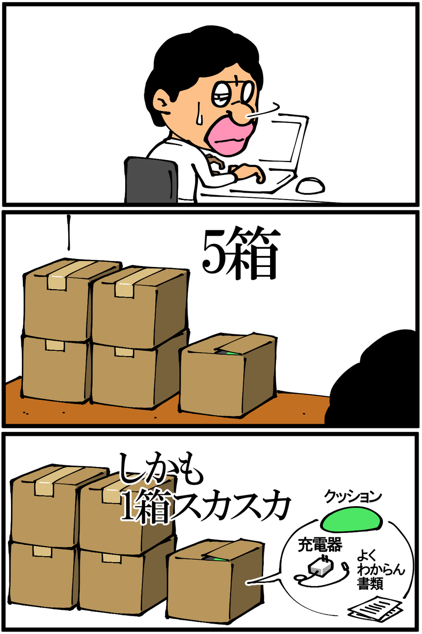 引っ越し業者の方に申し訳なくしてたら、単身で120箱の例もあったようで、度肝を抜かれました。