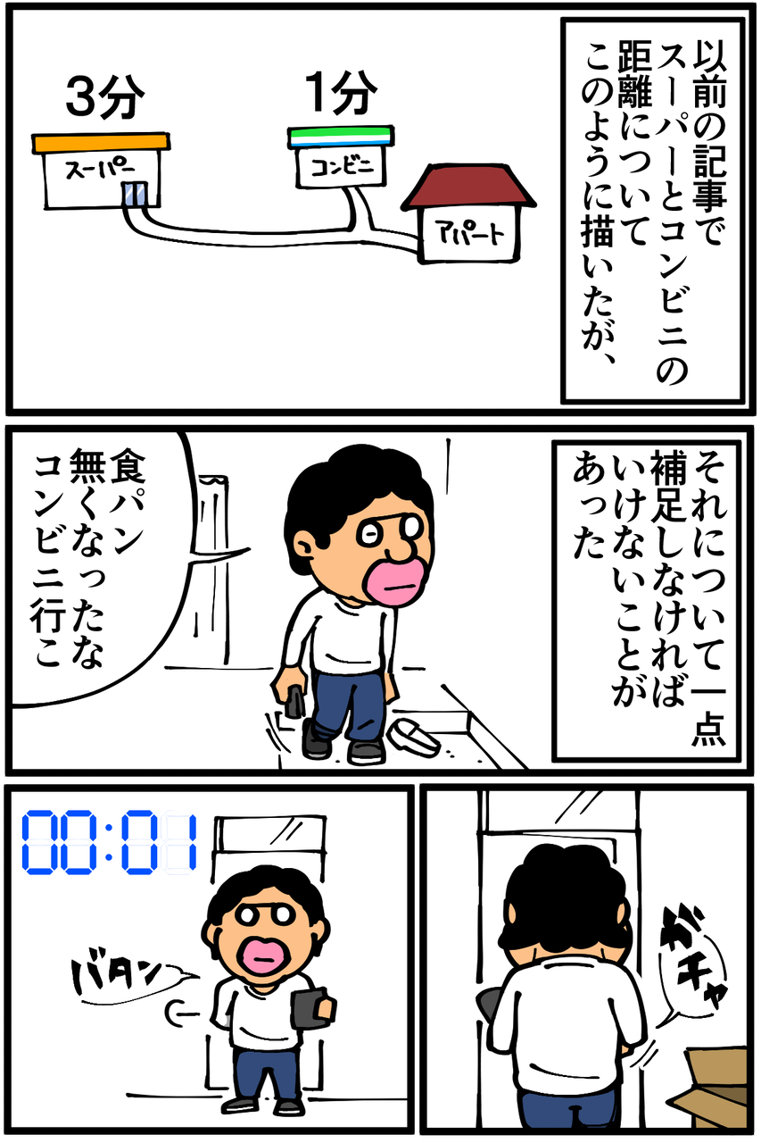 省略してましたが、正しくは「赤信号に引っかからなければコンビニまで約1分・スーパーまで約3分」でした。