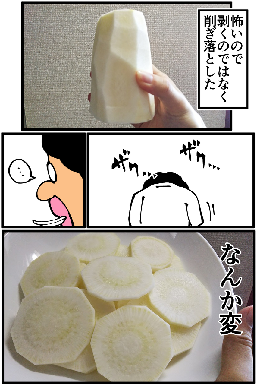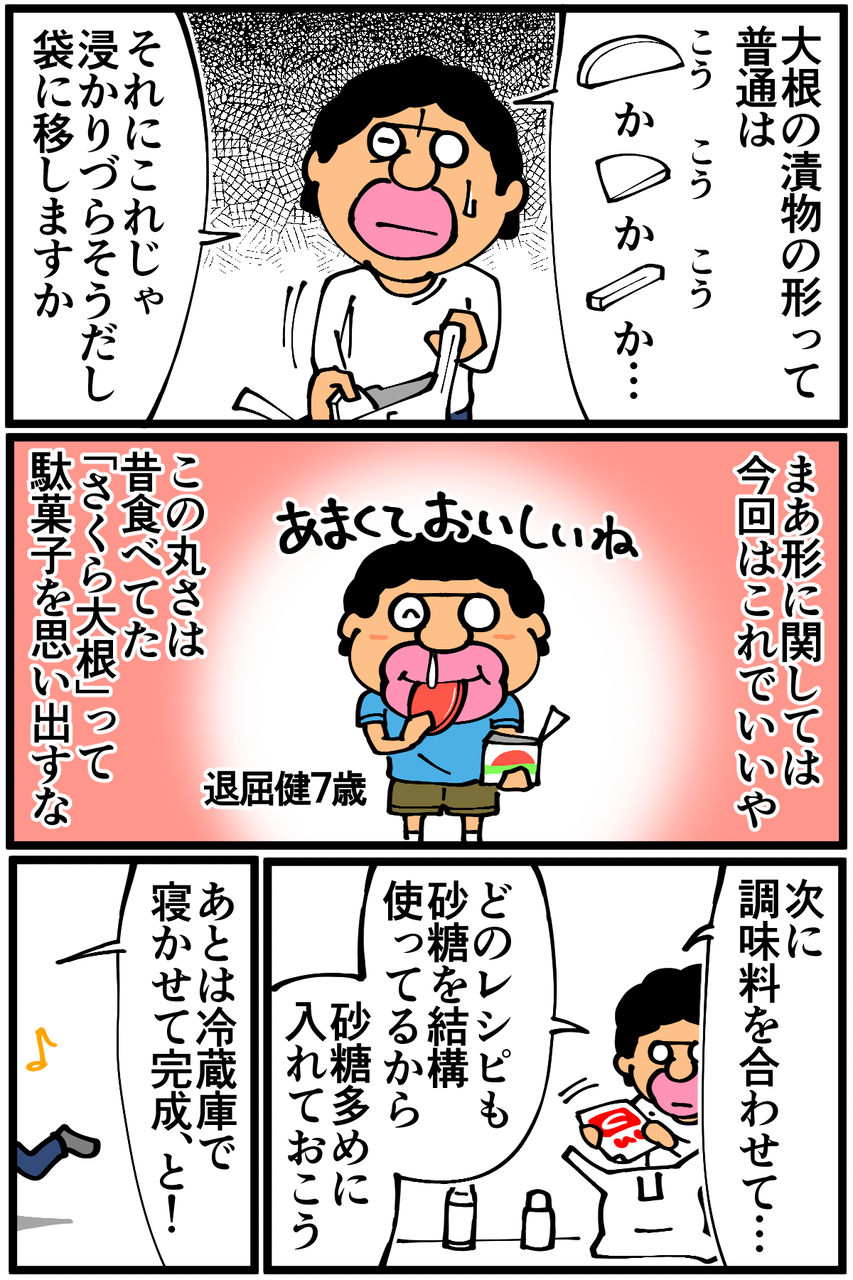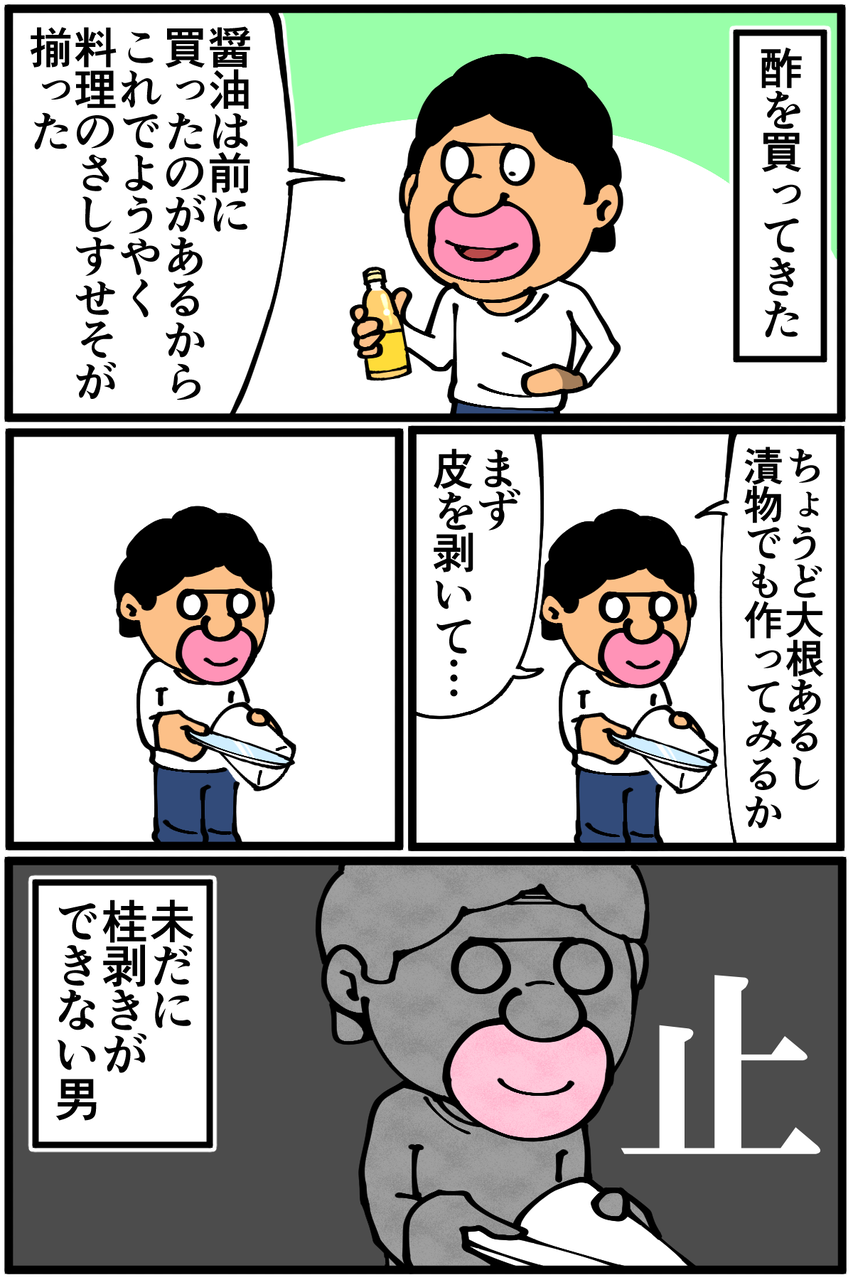 第716話「大根の漬物を作る」 2021年04月18日 安アパートでカツカツな生活を送る男の漫画ブログです。金が底を尽きてくたばるようなことがなければ毎日更新します。特売につられて寿司酢を買っていたのを忘れてました。塩と砂糖が含まれている酢に塩と砂糖を混ぜてしまった。前に作った大根のスープ↓この時も皮は削ぎ落としてます。●Twitterやってます。●登録していただくと更新通知がLINEで届きます↓ 「絵日記」カテゴリの最新記事 「料理」カテゴリの最新記事 < 前の記事次の記事 > コメント コメント一覧 (54) 1. 漬物 2021年04月18日 22:22 サラッとコンビニの袋で漬けてません? 0 taikutsu_ken がしました 27. 退屈健 2021年04月20日 22:56 >>1 中を洗えば多分大丈夫かな理論でコンビニ袋使ってしまいました…!笑 0 taikutsu_ken がしました 2. ぱいぱい 2021年04月18日 22:24 桂剥きは短く切ってから剥くとやりやすいですよ! 0 taikutsu_ken がしました 28. 退屈健 2021年04月20日 22:57 >>2 なるほど!!次は切ってから挑戦してみます! 0 taikutsu_ken がしました 3. スズメ 2021年04月18日 22:24 美味しかったのならグッジョブです! 0 taikutsu_ken がしました 29. 退屈健 2021年04月20日 22:57 >>3 美味しかったです~! 0 taikutsu_ken がしました 4. めい 2021年04月18日 22:24 美味しければOKです♪ 0 taikutsu_ken がしました 30. 退屈健 2021年04月20日 22:57 >>4 美味しければすべてヨシですね!笑 0 taikutsu_ken がしました 5. なめこ 2021年04月18日 22:32 幸せのハードルが低い方が幸せのかもしれない(--;) 0 taikutsu_ken がしました 31. 退屈健 2021年04月20日 22:58 >>5 普通の日常が既に幸せです!笑 0 taikutsu_ken がしました 6. カルロス 2021年04月18日 22:32 ピーラー買いましょう。色々と捗りますよ♪ 0 taikutsu_ken がしました 33. 退屈健 2021年04月20日 22:59 >>6 確かに…!皮むきでザクッといってしまう前にピーラー買おうと思います! 0 taikutsu_ken がしました 7. ふう 2021年04月18日 22:39 不格好かもしれませんが明らかに料理の体を成していてかるく感動しました 0 taikutsu_ken がしました 34. 退屈健 2021年04月20日 23:00 >>7 次はもう少し綺麗な見た目に仕上げたいところです!笑 0 taikutsu_ken がしました 8. モルカー 2021年04月18日 22:45 なんか想像していたより手が綺麗www 0 taikutsu_ken がしました 35. 退屈健 2021年04月20日 23:00 >>8 本当ですか、ありがとうございます! 0 taikutsu_ken がしました 9. 暇ロボ 2021年04月18日 22:45 むしろ皮向かなくても、漬物できますよ! 0 taikutsu_ken がしました 36. 退屈健 2021年04月20日 23:00 >>9 えっ、そうだったんですか!! 0 taikutsu_ken がしました 10. どゅくしゅあじゅぼっ! 2021年04月18日 22:47 大根は最初薪割りみたいに縦で切った後に薄く切るといいですよ! 0 taikutsu_ken がしました 37. 退屈健 2021年04月20日 23:00 >>10 なるほど~!最初に縦で切るのがコツでしたか!! 0 taikutsu_ken がしました 11. プンバ 2021年04月18日 22:49 うん、ピーラー買いましょう。おでん等、厚く皮を剥く時以外は根菜類はピーラーで皮むきしてます。めちゃ楽ですよー。 でも必ずまな板に食材を置いてむいて下さいね。 お酢で漬けると漬物よりもピクルス寄りの甘酢づけみたいな味なのかな? 0 taikutsu_ken がしました 26. ぱいぱい 2021年04月20日 19:26 >>11 面取りもピーラーで楽々ですもんね! 0 taikutsu_ken がしました 38. 退屈健 2021年04月20日 23:01 >>11 ピーラーで剥く時ってまな板に置くものだったんですね…!恥ずかしながら初耳でした!貴重な情報ありがとうございます、危ないところでした…!笑 0 taikutsu_ken がしました 12. ななひ 2021年04月18日 23:02 え!先生でも大根の皮はむいてしまうんですね!なんか嬉しいです(?) 子供のころでも顔は変わらないの愛おしいですね🥰 0 taikutsu_ken がしました 39. 退屈健 2021年04月20日 23:02 >>12 皮があると浸からないかなと思って今回は剥きました!が、やっぱり皮はそのまま食べてしまいました…笑 0 taikutsu_ken がしました 13. 2021年04月18日 23:07 甘くて美味しいならヨシ! 0 taikutsu_ken がしました 40. 退屈健 2021年04月20日 23:02 >>13 甘くて美味しいのは幸せそのものなのでヨシ! 0 taikutsu_ken がしました 14. ひまわり 2021年04月18日 23:08 結果的に美味しくできたのなら、それで良かったんですよ。 すし酢はけっこう使えますよ。 酢飯はもちろん簡単にできるし、きゅうりの輪切りと一緒にポリ袋に入れて20分位寝かせればとても美味しい漬け物ができます。 0 taikutsu_ken がしました 41. 退屈健 2021年04月20日 23:03 >>14 キュウリにも合いそうですね~!20分でできる漬物、最高過ぎますね! 0 taikutsu_ken がしました 15. かるかん 2021年04月18日 23:46 よく見ると皮食べてます? 咀嚼音が無いから‥違いますかね? 怪我したら危ないですのでピーラー買いましょう!(皮ごと食べる退屈先生には本当に必要かどうかは分かりませんが) 百均にもピーラー売ってますので笑 0 taikutsu_ken がしました 42. 退屈健 2021年04月20日 23:03 >>15 お察しの通り、皮は削ぎ落とした後にそのまま食べました!笑 ピーラーは俺みたいな人間には必須アイテムですね…! 0 taikutsu_ken がしました 16. 小手毬 2021年04月19日 00:24 沢