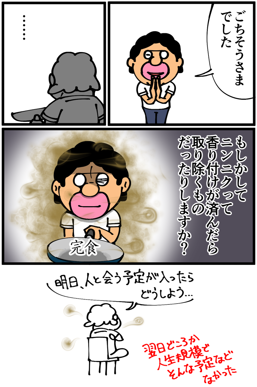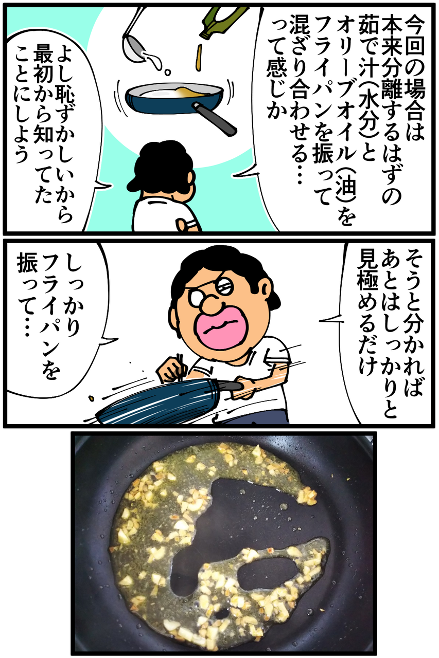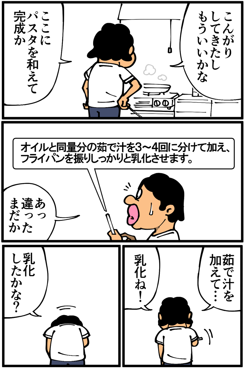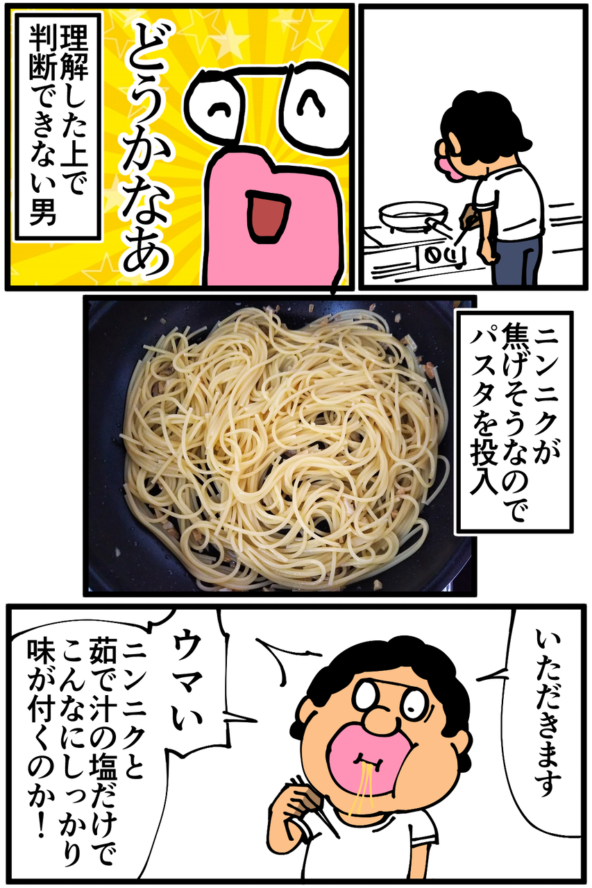 第745話「ペペロンチーノを作りたかった男・後編」 2021年05月23日 安アパートでカツカツな生活を送る男の漫画ブログです。金が底を尽きてくたばるようなことがなければ毎日更新します。前回の記事の続きです。食べる/食べない以外の概念が無かったので当然のようにニンニクも全部食べてしまった。3片分の一気食いは結構パンチがあって最高でした。唐辛子を買ったら今度こそペペロンチーノに挑戦してみようと思います。次の記事↓ オシャレなパスタを買った時の話↓●Twitterやってます。●登録していただくと更新通知がLINEで届きます↓ 「絵日記」カテゴリの最新記事 「料理」カテゴリの最新記事 < 前の記事次の記事 > コメント コメント一覧 (38) 1. スズメ 2021年05月23日 22:42 ニンニクはマシマシで食べるものですよ!! 0 taikutsu_ken がしました 20. 退屈健 2021年05月24日 23:29 >>1 マシマシで食べるの最高ですね!笑 0 taikutsu_ken がしました 2. あやめ 2021年05月23日 22:42 食べますよ、ニンニクは香りづけでもあり、具でもある。 0 taikutsu_ken がしました 21. 退屈健 2021年05月24日 23:29 >>2 こんな美味しいものを香り付けで済ませてしまうのはもったいないですよね…!笑 0 taikutsu_ken がしました 3. なめこ 2021年05月23日 22:47 それこそピンクペッパー入れたら良かったのでは。 0 taikutsu_ken がしました 22. 退屈健 2021年05月24日 23:30 >>3 あっ!確かにここで出番でしたね…!笑 0 taikutsu_ken がしました 4. よしお 2021年05月23日 22:55 味に飽きてきたらコンソメやレモン汁なんか入れると美味しいですよ 0 taikutsu_ken がしました 23. 退屈健 2021年05月24日 23:30 >>4 それ美味しそうですね~!いつか試してみたい…! 0 taikutsu_ken がしました 5. あおきんぐ 2021年05月23日 23:19 今回はペペロンチーノのではなくニンニク入り素パスタってことですかねw 0 taikutsu_ken がしました 24. 退屈健 2021年05月24日 23:31 >>5 味も思いっきりニンニク入り素パスタって感じでした!笑 0 taikutsu_ken がしました 6. みり子 2021年05月23日 23:31 パスタ 乳化で画像検索したら、乳化した状態がどんなのかすぐわかりますよwでも普通に美味しそうです🤤 0 taikutsu_ken がしました 25. 退屈健 2021年05月24日 23:32 >>6 見てみました!俺のはだいぶ白濁感もとろみも足りてなかったんですね…!笑 0 taikutsu_ken がしました 7. マッスルおやじ 2021年05月23日 23:31 フライパンを傾けて汁がトロ〜となってたら乳化してますよ! 0 taikutsu_ken がしました 26. 退屈健 2021年05月24日 23:32 >>7 なるほど~!だいぶシャバシャバだったので乳化失敗だったようです!笑 0 taikutsu_ken がしました 8. 鳥土竜 2021年05月24日 00:15 にんにく系は翌日が気になりますよねw 0 taikutsu_ken がしました 27. 退屈健 2021年05月24日 23:32 >>8 翌日、かなり凶悪な臭いを放っていたと思われます!笑 0 taikutsu_ken がしました 9. ぷょこ 2021年05月24日 00:25 美味しそう!ヾ(●´∇`●)ノ オリーブオイル&ニンニク熱してオイルにニンニクの匂いついてきたら、焼いたパンに塗って(染み込ませて)食べてもバカ美味いですよ🤤🤤 因みに唐辛子は輪切りになってるタイプが百均やスーパーに売ってるので、それを買うのがオススメです。 長いままの唐辛子を自ら輪切りにして手を洗う前に目を擦ったら「マーーーーーーー!」てなります← 0 taikutsu_ken がしました 28. 退屈健 2021年05月24日 23:34 >>9 パンに染み込ませるの美味しそうですね~!無限に食べられそうです! 唐辛子を触って目に触れてしまうミス怖いですね!!以前に一度やりかけたのでトラウマです…!笑 0 taikutsu_ken がしました 10. ぱいぱい 2021年05月24日 03:31 スライスしたにんにくでフライドガーリックにして、そのオイルでパスタと和えて最後にフライドガーリックをトッピングするのめっちゃうまいんですよ…! 0 taikutsu_ken がしました 29. 退屈健 2021年05月24日 23:35 >>10 そのトッピングは間違いなく美味しいですね!! 0 taikutsu_ken がしました 11. 安定型カットマン 2021年05月24日 04:57 僕はがっつりニンニク食べました! もったいなかったので笑 ペペロンチーノというよりは 塩焼きそばになってしまいましたねぇ… 0 taikutsu_ken がしました 30. 退屈健 2021年05月24日 23:35 >>11 確かに、見た目も完全に塩焼きそばですね!笑 0 taikutsu_ken がしました 12. パスタ山本 2021年05月24日 05:54 冷凍うどんでやってみてほしい 0 taikutsu_ken がしました 31. 退屈健 2021年05月24日 23:35 >>12 うどんで作ると食べ応え抜群で最高に美味しそうです! 0 taikutsu_ken がしました 13. たま 2021年05月24日 07:14 香り付けのにんにくは食べられますよ🙋 これに、ウインナー(もしくは魚肉ソーセージ)としめじを入れたらメチャウマでオススメですよ✨💪 0 taikutsu_ken がしました 32. 退屈健 2021年05月24日 23:36 >>13 そのトッピング最高ですね!密かなキノコブームなので試してみたい…! 0 taikutsu_ken がしました 14. うーろん 2021年05月24日 10:01 料理によってはオイルに香りを移した時点で取り除く場合もあるみたいですね! 焦げすぎでなければ食べて大丈夫ですね😊 今皆マスクしてるので、量を気にせずにんにく多めに使っ