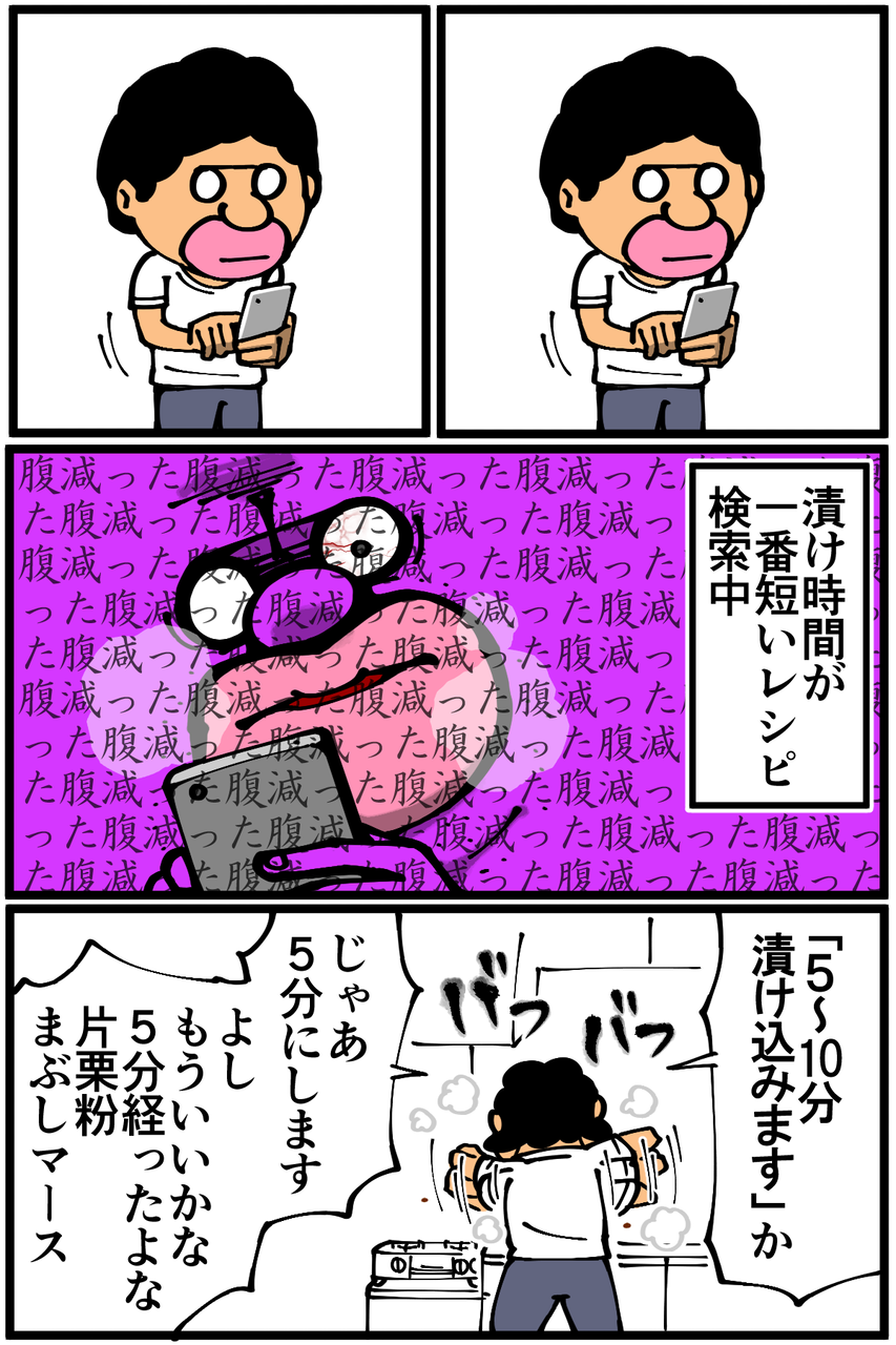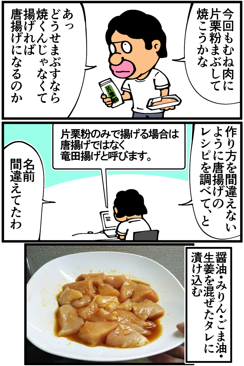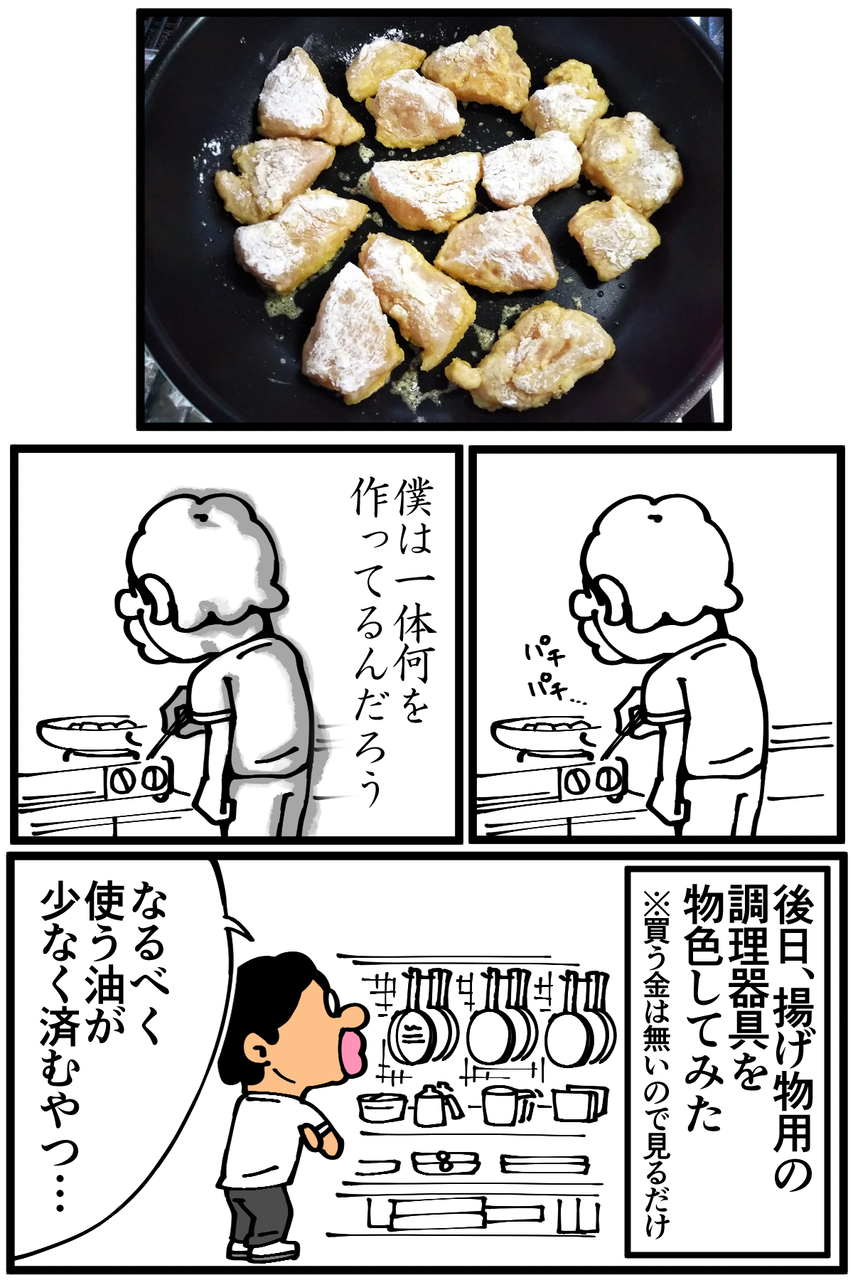 第752話「竜田揚げが作りたかった男」 2021年06月01日 安アパートでカツカツな生活を送る男の漫画ブログです。金が底を尽きてくたばるようなことがなければ毎日更新します。素直にオイルポットを買うか、精神に負担をかけずドバドバ使えるようメチャクチャ安い油でも買うべきでしょうか。自分でも謎なんですが何故かオリーブオイル(と最近買ったごま油)しか持っていないので、もったいなくて大量に使えません。油が完全に枯渇して揚げ焼きにすらなりませんでしたが、名称不明の謎料理は美味しくできました。表面の白いコナコナ感はちょっと竜田揚げっぽい気がする。次の記事↓ 前に作ったむね肉料理↓よく考えたら味付け以外今回と同じだった。●Twitterやってます。●登録していただくと更新通知がLINEで届きます↓ 「絵日記」カテゴリの最新記事 「料理」カテゴリの最新記事 < 前の記事次の記事 > コメント コメント一覧 (53) 1. かぶとむし 2021年06月01日 22:40 揚げる(焼く) 0 taikutsu_ken がしました 28. 退屈健 2021年06月03日 23:51 >>1 竜田焼きになりました!笑 0 taikutsu_ken がしました 2. 赤身マグロ 2021年06月01日 22:42 竜田揚げは別に粉々してないですよ笑 0 taikutsu_ken がしました 29. 退屈健 2021年06月03日 23:53 >>2 あれっ、じゃあそれも失敗だったのかもですね…!笑 0 taikutsu_ken がしました 3. Nnnn 2021年06月01日 22:43 焼き鳥肉の片栗粉まぶし 0 taikutsu_ken がしました 30. 退屈健 2021年06月03日 23:53 >>3 竜田揚げへの道のりは遠い…!笑 0 taikutsu_ken がしました 4. あらなみ 2021年06月01日 22:46 竜田揚げと名乗る焼いた肉 0 taikutsu_ken がしました 31. 退屈健 2021年06月03日 23:55 >>4 竜田揚げ(自称) 0 taikutsu_ken がしました 5. なめこ 2021年06月01日 22:49 まあ。 分かるけれども……(^^; 0 taikutsu_ken がしました 32. 退屈健 2021年06月03日 23:55 >>5 竜田揚げへの道のりは遠い…!笑 0 taikutsu_ken がしました 6. 筋肉おじさん 2021年06月01日 22:51 片面ギリギリ浸かるくらいの油でもひっくり返しながらやれば揚がりますよ 0 taikutsu_ken がしました 33. 退屈健 2021年06月03日 23:56 >>6 なるほど、片面ずつ揚げる感じですか! 0 taikutsu_ken がしました 7. momo 2021年06月01日 22:52 コレステロールゼロで1リットル200円の油はいかがでしょう…wスーパーでよく見かけます 0 taikutsu_ken がしました 34. 退屈健 2021年06月03日 23:56 >>7 1リットル200円!それは安いですね…!! 0 taikutsu_ken がしました 8. 元ブール職人 2021年06月01日 22:53 胸肉でも皮はついてるかと思いますが、思い切ってもも肉を使って、皮目を下にして揚げ焼きのようにすると、皮からも油が出てくるので、先生が使われてる油くらいでも唐揚げっぽく揚がりますよ♪ 『油1センチ 唐揚げ』みたいに調べたら多分出てきます〜!ちなみに調べたら油5ミリバージョンのレシピも出てきましたよ(^^) 0 taikutsu_ken がしました 35. 退屈健 2021年06月03日 23:57 >>8 なるほど、皮からの油で揚げ焼きに!それは美味しそうですね! 5ミリでも作れるとは…! 0 taikutsu_ken がしました 9. dd 2021年06月01日 22:56 オイルポットは一度使用した油を濾して保存する容器なので揚げ物用の鍋ではないですよ☺️ 0 taikutsu_ken がしました 36. 退屈健 2021年06月03日 23:59 >>9 オイルポット、油ケチり性な俺に必要な物かもしれません…!笑 0 taikutsu_ken がしました 10. dattepyon 2021年06月01日 23:01 やるー♪ 0 taikutsu_ken がしました 37. 退屈健 2021年06月04日 00:00 >>10 あるあるでしたか!笑 0 taikutsu_ken がしました 11. ねずみ 2021年06月01日 23:33 油は次の日に残しておいても大丈夫ですよ! 0 taikutsu_ken がしました 38. 退屈健 2021年06月04日 00:00 >>11 おお、そうなんですか! 0 taikutsu_ken がしました 12. みりん♥️ 2021年06月01日 23:40 うーんいっそのことノンフライヤーを買ってはどうですか? そしたらせっかく買ったガスコンロは使わないからもったいないですよね💦 サラダ油、安い所ではキャノーラ油でも1リットル198円くらいで買えますし、揚げ油を一回で捨てるのがもったいなかったら、やっぱりフィルター付きのオイルポットがオススメかなぁ。 ウチのオイルポットのフィルターは活性炭系のだったかな?めっちゃ汚れた油もフィルターで濾すとビックリするくらい綺麗になります。一つのフィルターで10回くらい濾せます。 ただねぇそのフィルターが私的にはお高く感じるんですよねぇ~。 0 taikutsu_ken がしました 39. 退屈健 2021年06月04日 00:01 >>12 おおー!そんな高性能オイルポットがあるんですか! いつか手に入れたいところです!! 0 taikutsu_ken がしました 13. 2021年06月01日 23:41 これはこれでおいしそう 0 taikutsu_ken がしました 40. 退屈健 2021年06月04日 00:01 >>13 本当ですか、ありがとうございます! 0 taikutsu_ken がしました 14. みり子 2021年06月02日 00:57 そもそも、油ドバドバ使うにしても、使った油を処理するもの(固めるテンプルとか)はお持ちなのでしょうか…w 毎日料理をするならオイルポットをオススメするんですが、そうじゃないなら油を傷めてしまうしなぁ…いっそのこと、揚げ物は『買う物』と割り切る方が経済的かもしれま