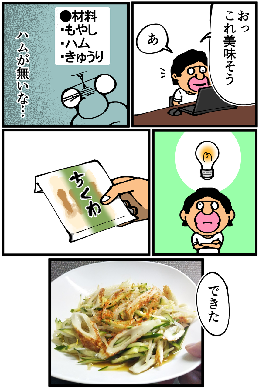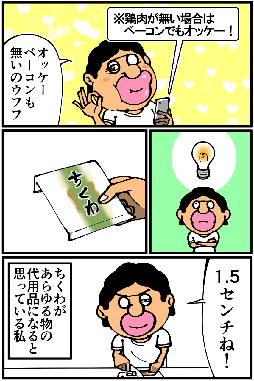第766話「万能ピンチヒッター」 2021年06月17日 安アパートでカツカツな生活を送る男の漫画ブログです。金が底を尽きてくたばるようなことがなければ毎日更新します。いけねーか次の記事↓ 前にちくわがマイブームだった時の話↓●Twitterやってます。●登録していただくと更新通知がLINEで届きます↓ 「絵日記」カテゴリの最新記事 < 前の記事次の記事 > コメント コメント一覧 (46) 1. そこらへんの石ころよりの砂利 2021年06月17日 22:24 もやしかと思ったら…進化してますね! 0 taikutsu_ken がしました 25. 退屈健 2021年06月20日 10:48 >>1 もやしも相変わらずうちの万能選手です!笑 0 taikutsu_ken がしました 2. 安定型カットマン 2021年06月17日 22:27 ピンチヒッターがもはやスタメンじゃないですか笑 0 taikutsu_ken がしました 26. 退屈健 2021年06月20日 10:50 >>2 事実上のスタメン(エース)です!笑 0 taikutsu_ken がしました 3. なめこ 2021年06月17日 22:35 吹いたら何とか……(無理か) 0 taikutsu_ken がしました 27. 退屈健 2021年06月20日 10:50 >>3 空洞を利用したいですね…! 0 taikutsu_ken がしました 4. あらなみ 2021年06月17日 22:37 あたしンちのお母さんみたいだなぁ 0 taikutsu_ken がしました 28. 退屈健 2021年06月20日 10:50 >>4 あたしンちでもちくわ出てきてましたね!笑 0 taikutsu_ken がしました 5. あおの 2021年06月17日 22:38 泡立て器の代用は、箸でやれます。(根性が必要な場合あり) 0 taikutsu_ken がしました 29. 退屈健 2021年06月20日 10:51 >>5 根性でどうにかします!笑 0 taikutsu_ken がしました 6. ぺんぺん 2021年06月17日 22:42 そのうち全部代用品で調理する先生の姿が浮かびます笑 0 taikutsu_ken がしました 30. 退屈健 2021年06月20日 10:51 >>6 ちくわのちくわ添えをちくわで食べる感じになりそうです!笑 0 taikutsu_ken がしました 7. mou 2021年06月17日 22:42 賞味期限の強い味方、ウインナーもおすすめです 細かく輪切りにすればオムライスの鶏肉代わりになりますよ 0 taikutsu_ken がしました 31. 退屈健 2021年06月20日 10:56 >>7 ウインナー良いですね~! 最近買ってなかったので久しぶりに今度買おうと思います! 0 taikutsu_ken がしました 8. 後継者 2021年06月17日 22:43 3食素パスタ、もやしだった頃の先生を返してよ!!!!!!!!!!!!!!!!!!!!!(先生の食生活が改善されており大変嬉しく思っております) 0 taikutsu_ken がしました 32. 退屈健 2021年06月20日 10:56 >>8 進歩しました!!!!!!!(素パスタともやしを食べる頻度は正直変わっておりません…!笑) 0 taikutsu_ken がしました 9. ☆ゆーき☆ 2021年06月17日 22:47 是非『かもめちくわ』(商品名)を食べて貰いたい🎵 0 taikutsu_ken がしました 33. 退屈健 2021年06月20日 11:02 >>9 かもめちくわ!今度最寄りのスーパーに無いか探してみます! 0 taikutsu_ken がしました 10. ねこやしき 2021年06月17日 22:51 はんぺんもおすすめです。ひき肉の代わりに便利です。カサ増しにも使えます。 0 taikutsu_ken がしました 34. 退屈健 2021年06月20日 11:03 >>10 なるほど、はんぺん!!挽き肉の代わりになるとは…! 0 taikutsu_ken がしました 11. 鳥土竜 2021年06月17日 23:19 ちくわは頑張ってもストローが限界かと… 0 taikutsu_ken がしました 35. 退屈健 2021年06月20日 11:03 >>11 食べられる極太ストローとして重宝しますね!笑 0 taikutsu_ken がしました 12. かときち 2021年06月17日 23:20 ちくわの先に切れ目を入れたらイケるかも⁉︎😆 0 taikutsu_ken がしました 36. 退屈健 2021年06月20日 11:03 >>12 先端を細かく切ればいい感じに泡立てられそうですね!笑 0 taikutsu_ken がしました 13. みり子 2021年06月17日 23:41 ところでオムライスの写真は??? 0 taikutsu_ken がしました 37. 退屈健 2021年06月20日 11:04 >>13 大失敗ではないものの綺麗でもなかったので写真を撮らずにそのまま食べてしまいました…!笑 0 taikutsu_ken がしました 14. 名無し 2021年06月18日 00:11 100均にありますよー 0 taikutsu_ken がしました 38. 退屈健 2021年06月20日 11:05 >>14 今度100均に行った時に買おうと思います!これでついにメレンゲが作れるかも…!笑 0 taikutsu_ken がしました 15. みりん♥️ 2021年06月18日 01:25 魚肉ソーセージも安くて保存もきくのでオススメ。 でもまずは、今ある材料を入力してからレシピを検索する事からオススメします。 健さんいつも逆な気がするので。(あっ、でもブログのネタになってるから良いのか?) 0 taikutsu_ken がしました 16. ななし 2021年06月18日 03:40 >>15 今ある材料で検索したら3件くらいしかヒットしないのかもしれない… 0 taikutsu_ken がしました 22. みりん♥️ 2021年06月18日 21:23 >>16 たしかに!! 0 taikutsu_ken がしました 39. 退屈健 2021年06月20日 11:05 >>15 魚肉ソーセージいいですね~! 確かに、いつも順番が逆ですね…!笑 0 taikutsu_ken がしました 17. 🏳️🌈🗿🏳️🌈 2021年06月18日 06:04 かきまぜるよりも、口に咥えてブクブクした方がいいんじゃないでしょうか 0 taikutsu_ken がしました 40. 退屈健 2021年06月20日 11:06 >>17 俺がやるとあまりに汚い絵面になりそうです!笑 0 taikutsu_ken がしました 18. 以下、名無し 2021年06月18日 09:01 オムライスの文字を見て、昔投稿された「退屈だから人生を振り返ってみた」で オムライス