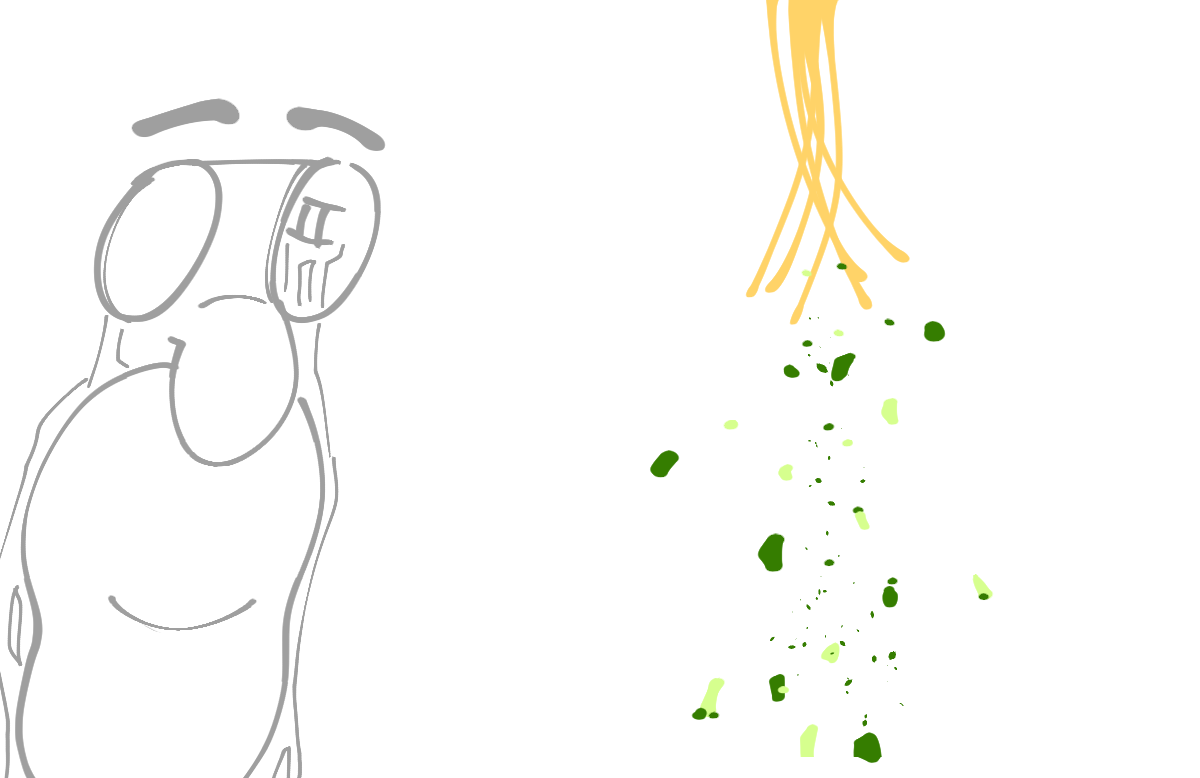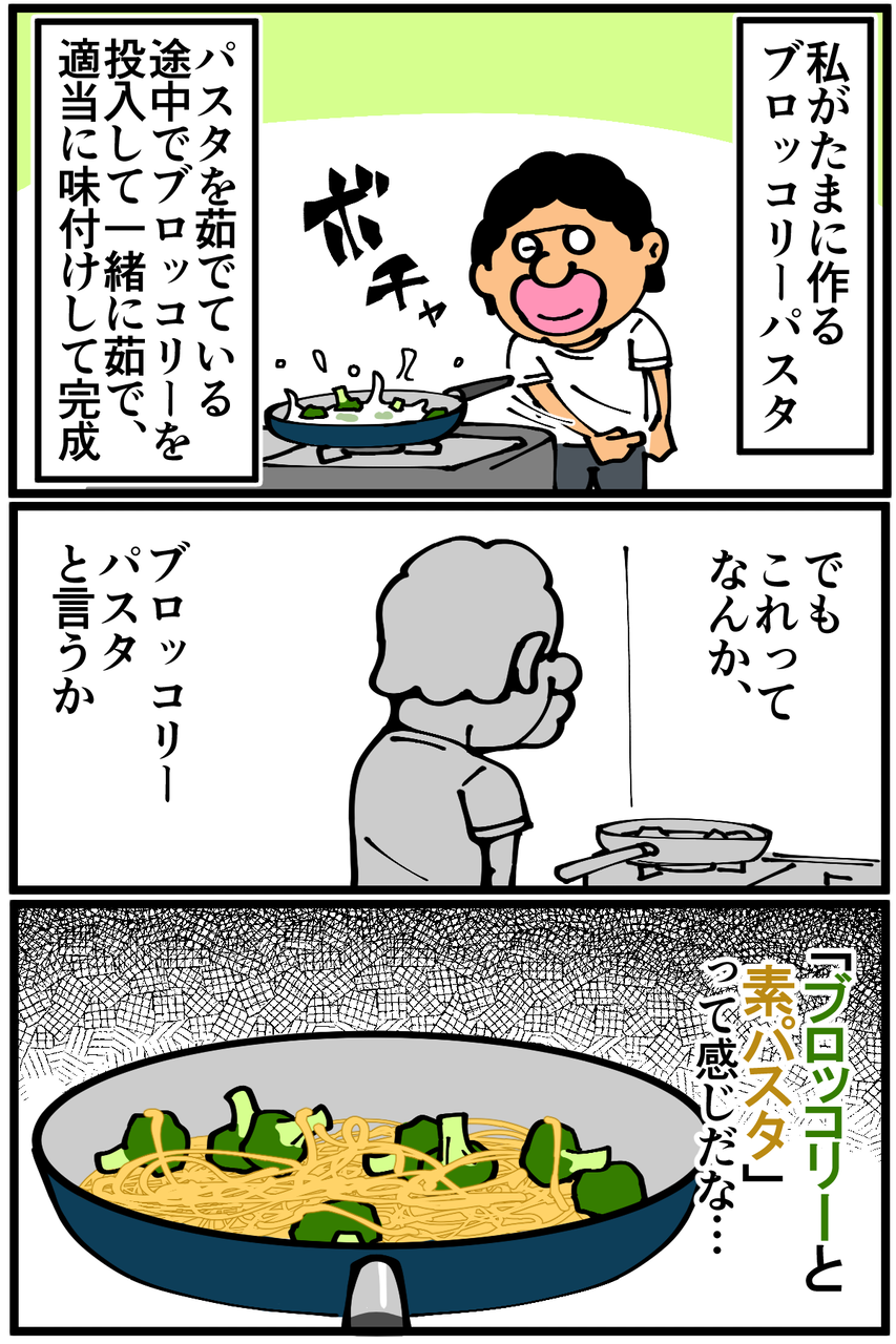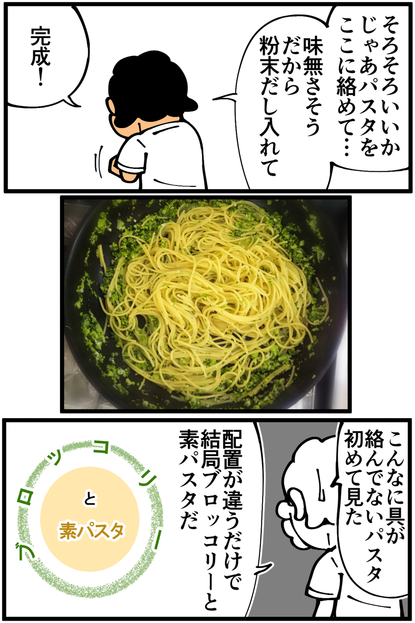 パスタを食べ終えた後にスプーンで粉々のブロッコリーをすくって食べるという謎の食事になりました。