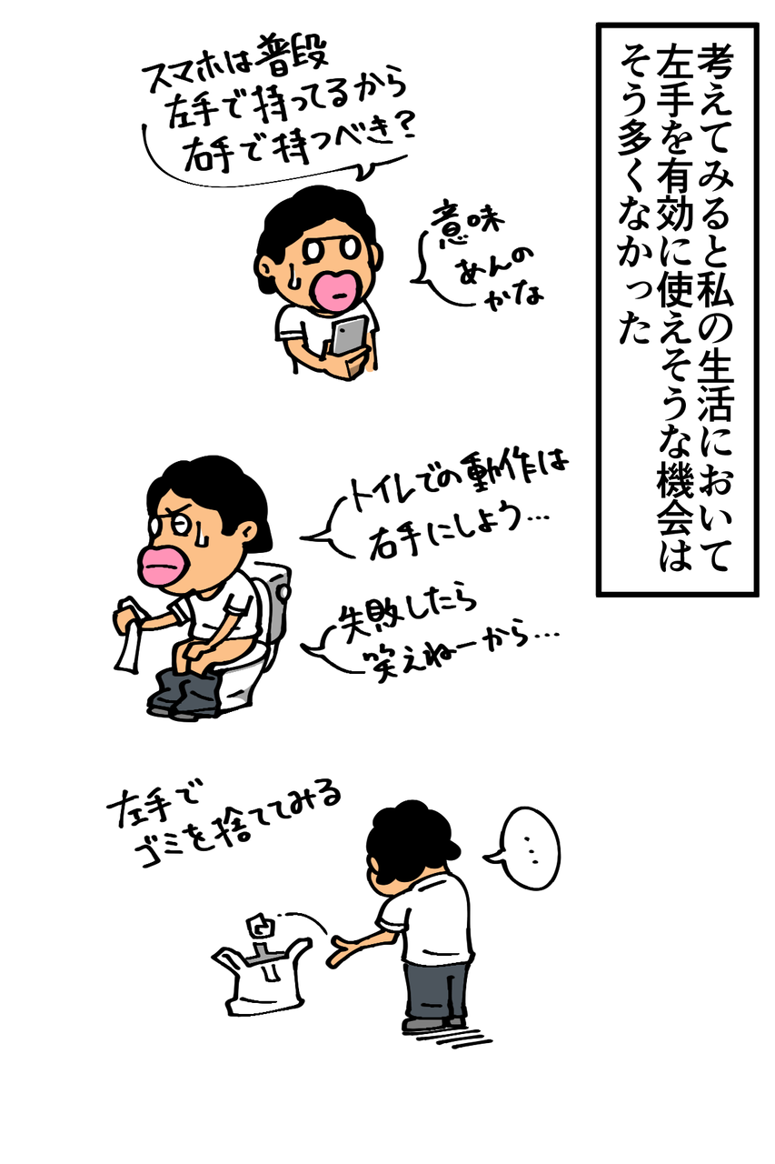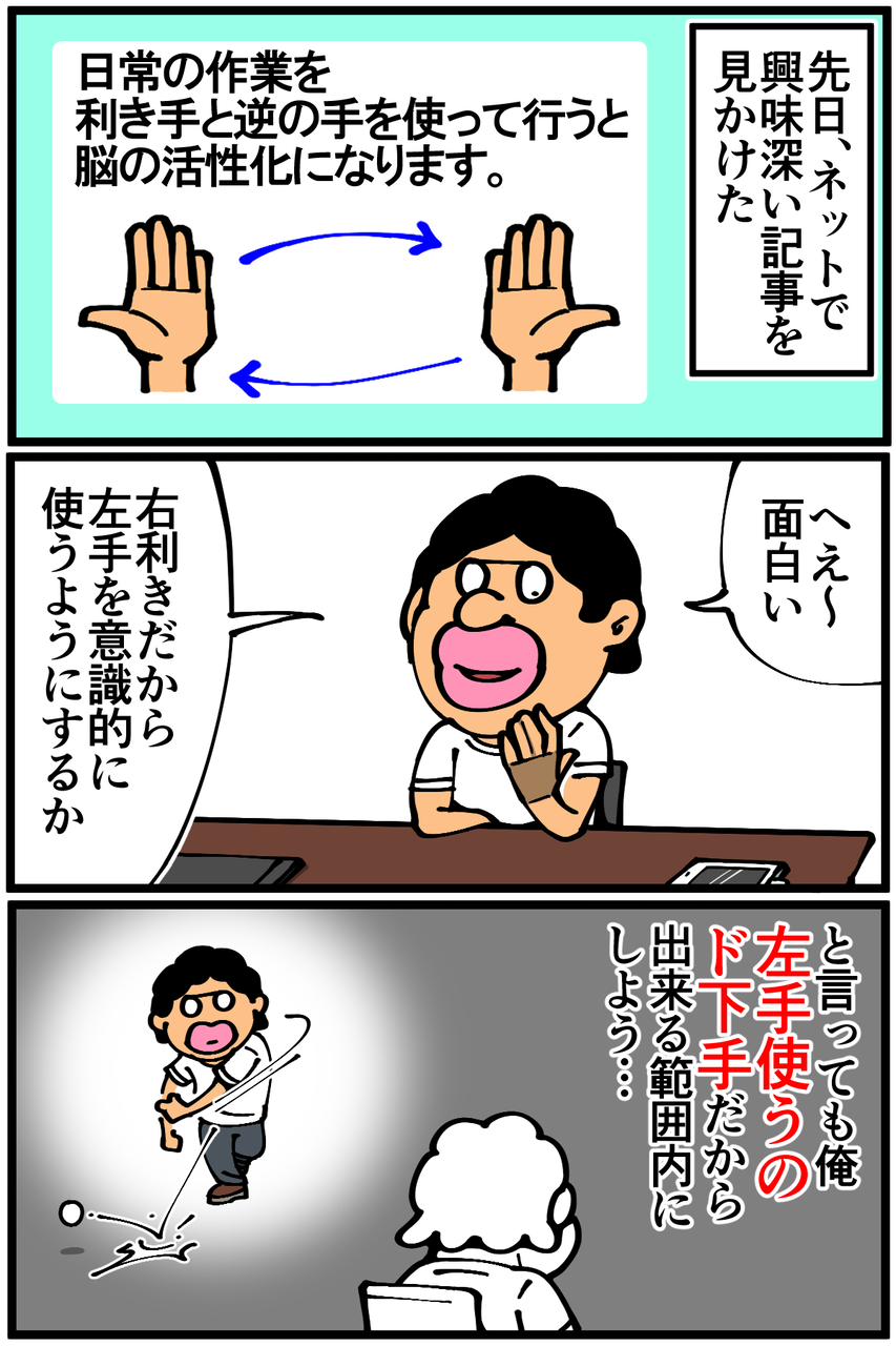 第769話「利き手と逆の手を使う」 2021年06月20日 安アパートでカツカツな生活を送る男の漫画ブログです。金が底を尽きてくたばるようなことがなければ毎日更新します。左手で描くと、ただ描いているだけなのに指が攣りそうになりますね。というか左手だと色の選択すらままならないのでやっぱりやめます。次の記事↓ なかなか完治しない左肩の古傷について↓●Twitterやってます。●登録していただくと更新通知がLINEで届きます↓ 「絵日記」カテゴリの最新記事 < 前の記事次の記事 > コメント コメント一覧 (28) 1. しのびのもの 2021年06月20日 22:25 スタンプ新作作ってください!左手で笑 0 taikutsu_ken がしました 15. 退屈健 2021年06月23日 23:12 >>1 ヨレヨレスタンプ、それはそれでいいかもしれないですね!笑 0 taikutsu_ken がしました 2. 安定型カットマン 2021年06月20日 22:25 両利きとかカッコいいですけどね笑 パソコン見ながら歯を磨きたいので 最近左手で歯みがきの練習してます! 0 taikutsu_ken がしました 16. 退屈健 2021年06月23日 23:13 >>2 なるほど~!左手で磨けると色々利点がありそうですね! 0 taikutsu_ken がしました 3. 🏳️🌈🗿🏳️🌈 2021年06月20日 22:35 (右利きの場合)左手で右の耳掃除をすると超ゾクゾクしません? 0 taikutsu_ken がしました 17. 退屈健 2021年06月23日 23:13 >>3 そうなんですか!今度やって新たな扉を開こうと思います!笑 0 taikutsu_ken がしました 4. ぱいぱい 2021年06月20日 22:35 左手で素パスタを食うくらいがちょうどいいのかもしれませんね笑 0 taikutsu_ken がしました 18. 退屈健 2021年06月23日 23:14 >>4 手掴みパスタは新境地ですね!笑 0 taikutsu_ken がしました 5. なめこ 2021年06月20日 22:36 退屈蜃気楼。 0 taikutsu_ken がしました 19. 退屈健 2021年06月23日 23:14 >>5 そのままユラリと消えようと思います! 0 taikutsu_ken がしました 6. あらなみ 2021年06月20日 22:45 両利きは活性化できないんですね 可哀想 0 taikutsu_ken がしました 20. 退屈健 2021年06月23日 23:15 >>6 なるほど、考えてみると確かに…!もしくは日常生活でずっと活性化しているのかもですね!笑 0 taikutsu_ken がしました 7. プイ 2021年06月20日 23:31 歯磨き 主に左手で、とか! 0 taikutsu_ken がしました 21. 退屈健 2021年06月23日 23:15 >>7 歯磨きで練習はいいかもしれないですね~! 0 taikutsu_ken がしました 8. 米粉餅 2021年06月21日 01:51 いつもと逆の手の指毛を剃って爪にマニキュアを塗れば結構使えます(意味深)。 0 taikutsu_ken がしました 22. 退屈健 2021年06月23日 23:16 >>8 なるほど!それをチラッと見切れさせてセルフ匂わせ写真を作ろうと思います!笑 0 taikutsu_ken がしました 9. ゆきちお 2021年06月21日 03:51 靴を履く時もいつもとは反対の足から履くとか、歯磨きは左手でとかありますね。 それ以外は思い浮かばない不思議〜^_^ 0 taikutsu_ken がしました 23. 退屈健 2021年06月23日 23:16 >>9 考えてみると案外思い付かないですよね!笑 靴の順番、盲点でした!! 0 taikutsu_ken がしました 10. ぺんぺん 2021年06月21日 06:24 左手で色んなキャラクター描いてみたとかどうでしょう笑 0 taikutsu_ken がしました 24. 退屈健 2021年06月23日 23:16 >>10 挑戦してみたいですね!笑 0 taikutsu_ken がしました 11. ななひ 2021年06月21日 07:06 左手で書いた絵も味があっていいですね!!今度から左手でいきますか!🥰 0 taikutsu_ken がしました 25. 退屈健 2021年06月23日 23:17 >>11 いつか全コマ左手でいけるようにしたいところです!笑 0 taikutsu_ken がしました 12. gohan 2021年06月21日 15:03 ハサミなど刃物、文字を書く、箸はどうしても利き手以外ダメですが フォーク、スプーン、マウス操作、歯磨きは反対の手でもできますよ。 0 taikutsu_ken がしました 26. 退屈健 2021年06月23日 23:18 >>12 なるほど、マウス操作も…!確かにそれはいい練習になりますね! 0 taikutsu_ken がしました 13. 以下、名無し 2021年06月22日 11:00 3枚目の絵はどう見てもボールを叩きつけているようにしか・・・w 0 taikutsu_ken がしました 27. 退屈健 2021年06月23日 23:18 >>13 遠投しようとした結果目の前に…笑 0 taikutsu_ken がしました 14. カフェオレ 2021年06月23日 21:30 リハビリかな???? 0 taikutsu_ken がしました 28. 退屈健 2021年06月23日 23:19 >>14 脳のリハビリです!笑 0 taikutsu_ken がしました コメントフォーム 名前 コメント 記事の評価 リセット リセット 顔 星 情報を記憶 コメントを投稿する