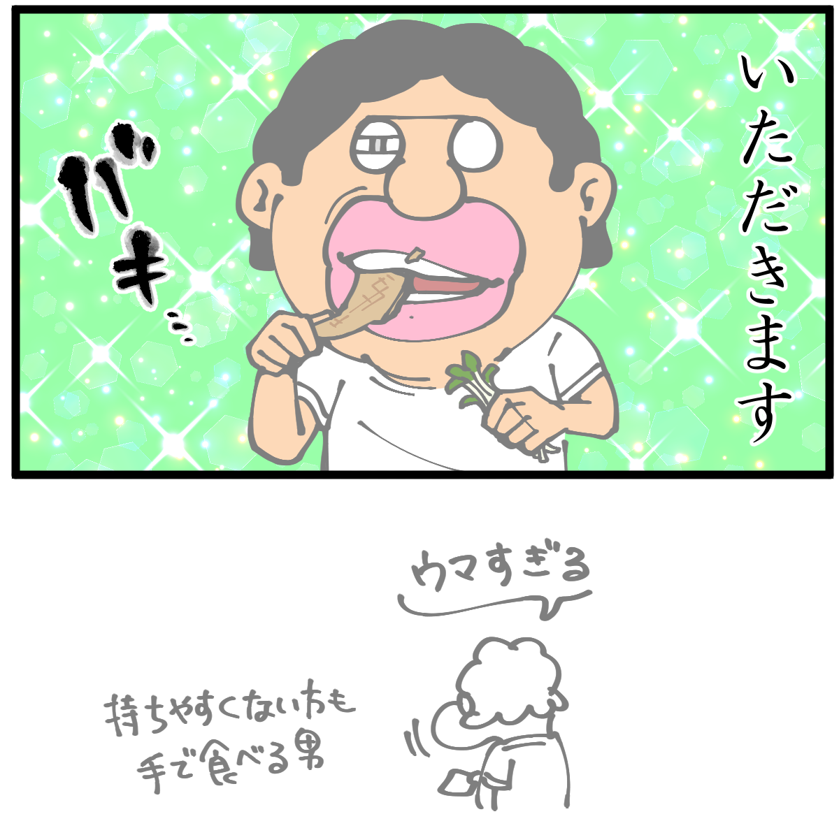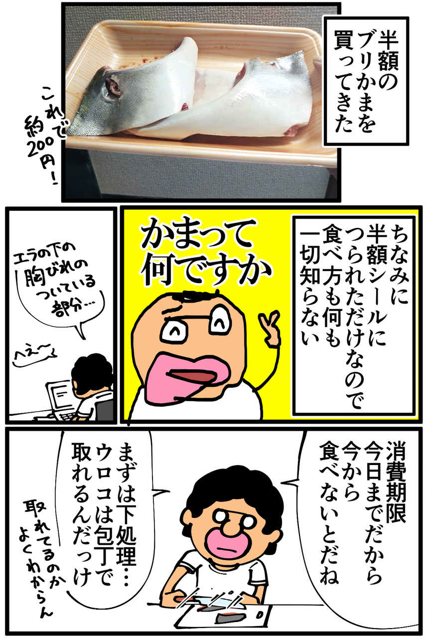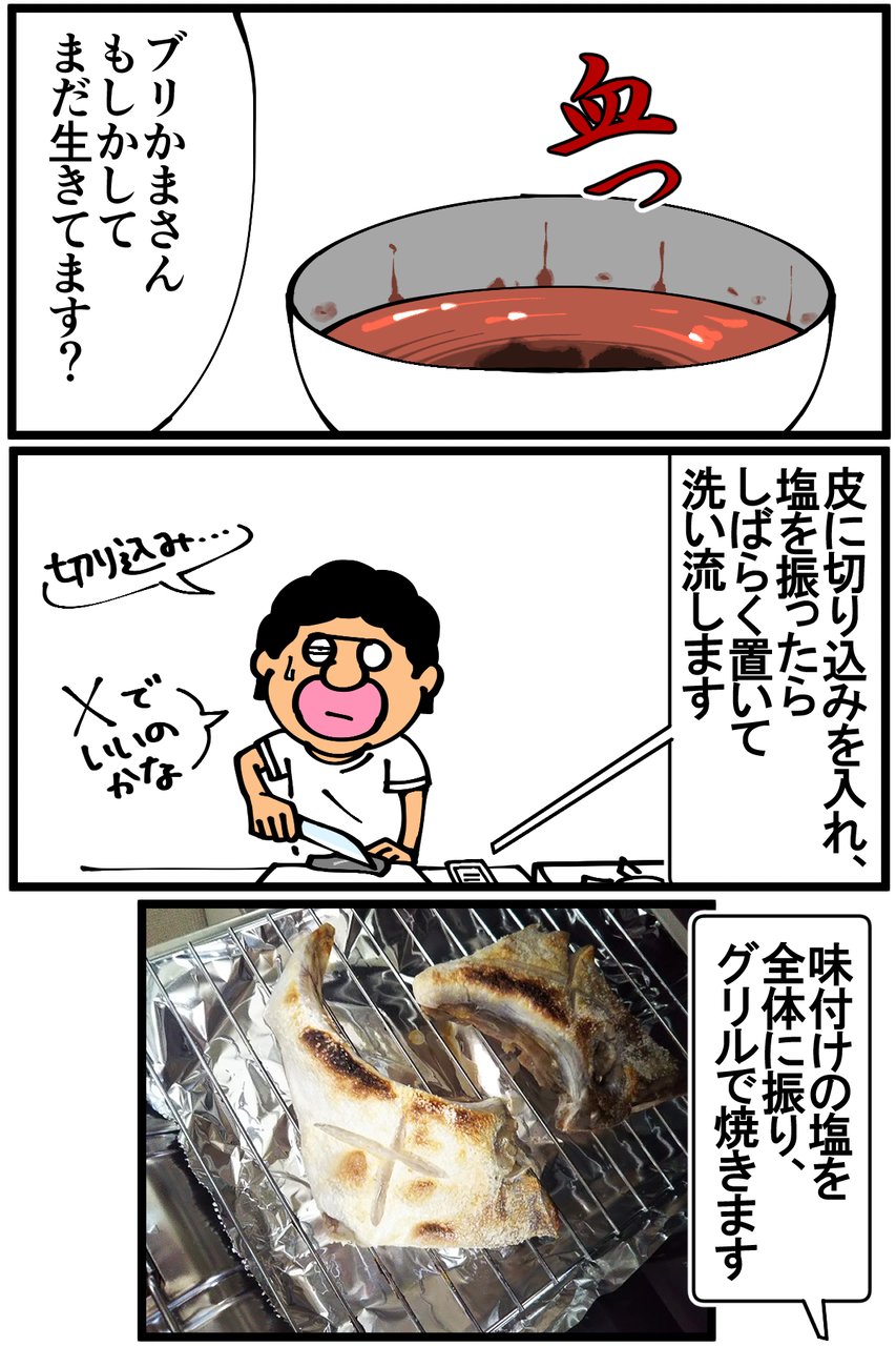 第774話「ブリかまの塩焼きを作る」 2021年06月26日 安アパートでカツカツな生活を送る男の漫画ブログです。金が底を尽きてくたばるようなことがなければ毎日更新します。極度の空腹状態の時って手で食べたくなりますね。皆さんもそうだと信じてます。ブリかまについて何の知識も無く買ったんですが、美味しすぎたのでまた絶対買います(値引きされてたら)。ただ、タレとか無いしな~とか思って味付けの塩を多めに振ってしまったのは失敗でした。次はブリかま自体の味をもっと楽しむために味付け無しで丸呑みします!次の記事↓ ブリの照り焼きを作った時の話↓ ●Twitterやってます。●登録していただくと更新通知がLINEで届きます↓ 「絵日記」カテゴリの最新記事 「料理」カテゴリの最新記事 < 前の記事次の記事 > コメント コメント一覧 (47) 1. 安定型カットマン 2021年06月26日 22:43 お魚いいですねー! 一人暮らし始めてからほとんど魚食べてないです。 0 taikutsu_ken がしました 24. 退屈健 2021年06月30日 12:43 >>1 魚美味しいですね~!食べる前後が少々面倒なのが唯一の難点です…!笑 0 taikutsu_ken がしました 2. なめこ 2021年06月26日 22:47 馬が進化していく……。 0 taikutsu_ken がしました 25. 退屈健 2021年06月30日 12:43 >>2 ペガサスまであと少し…! 0 taikutsu_ken がしました 47. なめこ 2021年06月30日 22:40 >>25 そっちじゃない‼️ 0 taikutsu_ken がしました 3. ぺんぺん 2021年06月26日 22:50 お米が食べたくなりますね😋 0 taikutsu_ken がしました 26. 退屈健 2021年06月30日 12:44 >>3 お米があったら最高でした!! 0 taikutsu_ken がしました 4. メタボ田中 2021年06月26日 22:52 めちゃ美味そう 0 taikutsu_ken がしました 27. 退屈健 2021年06月30日 12:46 >>4 美味しかったです! 0 taikutsu_ken がしました 5. ななひ 2021年06月26日 23:15 素手でじゃぶじゃぶいけちゃう先生男前ですね… 勢い余って素手で食べて原始人化しちゃうのは日本人あるあるだと思いますよ(⌒ ͜ ⌒) 0 taikutsu_ken がしました 28. 退屈健 2021年06月30日 12:47 >>5 本能的に素手で食べたくなりますね!笑 0 taikutsu_ken がしました 6. 赤身マグロ 2021年06月26日 23:20 ブリカマは脂の乗った一番うまいとこなので 羨ましい限りです。 クリスマスのローストチキンのように食べたのは驚きですが 0 taikutsu_ken がしました 29. 退屈健 2021年06月30日 12:49 >>6 えっ、一番美味いところでしたか!!それはラッキーでした! 0 taikutsu_ken がしました 7. しゃけかま 2021年06月26日 23:36 空腹時手掴みで食べたい気持ちにめっちゃ共感しました! 魚の頭美味しいですよね(о´∀`о) 最近このブログを寝る前に読ませていただいています 料理シリーズ、なんとも言えず好きです(*´ω`*) 0 taikutsu_ken がしました 30. 退屈健 2021年06月30日 12:49 >>7 手掴みでかぶりつきたいですね!笑 ありがとうございます、読んでいただけて光栄です!! 0 taikutsu_ken がしました 8. 鰤 2021年06月26日 23:36 まさか先生のブログで飯テロ喰らうとは。。。 腹減った。。 0 taikutsu_ken がしました 31. 退屈健 2021年06月30日 12:50 >>8 まさかの飯テロに!笑 0 taikutsu_ken がしました 9. dattepyon 2021年06月26日 23:41 ブリカマはもちろん、魚の一番おいし食べ方は!塩焼きだ! by 海の近くで生まれた女(生まれただけ) 0 taikutsu_ken がしました 32. 退屈健 2021年06月30日 12:50 >>9 塩焼き最高ですね!! 0 taikutsu_ken がしました 10. ぶりかま大好き 2021年06月26日 23:46 先生、上品なお料理だからこそ、お箸を使って、上品にいただきましょう! 0 taikutsu_ken がしました 33. 退屈健 2021年06月30日 12:51 >>10 最後の最後で手掴みにしてしまいました!笑 0 taikutsu_ken がしました 11. ペく 2021年06月27日 00:11 レパートリーどんどん増えますね そして料理が美味しそうになるのと反比例して体を張ったネタが増える先生…… 0 taikutsu_ken がしました 34. 退屈健 2021年06月30日 12:51 >>11 グリルを使いたくて魚を買う頻度が若干増えました!🐟 0 taikutsu_ken がしました 12. あらなみ 2021年06月27日 00:29 つまり半額シール貼ってあったら退屈先生の食生活が向上する...? 0 taikutsu_ken がしました 35. 退屈健 2021年06月30日 12:52 >>12 普段買わない物を買い始めることはあると思います!笑 0 taikutsu_ken がしました 13. シュフ 2021年06月27日 03:03 バキ って何ですか!?笑 美味しそうに焼けてますね〜! ブリカマイケるなら、鯛のお頭も激安なのを見つけたら焼いてみてください。バキッとは食べたら歯が折れる可能性がありますが、ちまちました身が美味しすぎて… たまらないです♪ 0 taikutsu_ken がしました 36. 退屈健 2021年06月30日 12:53 >>13 骨を砕く音でした!笑 鯛のお頭って激安なんですが!!それは是非食べてみたい…! 0 taikutsu_ken がしました 14. 鳥土竜 2021年06月27日 03:39 かまは脂乗ってて美味しいですよね~ブリのは食べた事ないですが照り焼きとか美味しいのかな。 0 taikutsu_ken がしました 37. 退屈健 2021年06月30日 12:53 >>14 初めて食べたんですがかま美味しいですね~! 0 taikutsu_ken がしました 15. ゆきちお 2021年06月27日 03:41 単品でのお召し上がり⁉️ 白米追加お願いしたい^_^ 0 taikutsu_ken がしました 38. 退屈健 2021