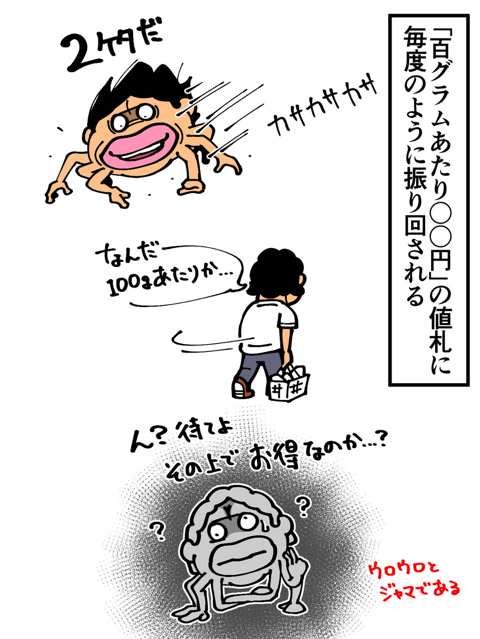 第840話「振り回されるもの」 2021年09月11日 安アパートでカツカツな生活を送る男の漫画ブログです。金が底を尽きてくたばるようなことがなければ毎日更新します。安いのかそうでもないのかよくわからなくなって結局いつも鶏むね肉買います。次の記事↓ 100gあたりに惑わされつつ買ったクラゲを食べた時の話↓マイクラプレイ動画アップしました。先日起きた、拠点でのとある大事件の様子です。●Twitterやってます。●登録していただくと更新通知がLINEで届きます↓ 「絵日記」カテゴリの最新記事 < 前の記事次の記事 > コメント コメント一覧 (17) 1. 名無しの7 2021年09月11日 20:32 すごくよくわかります 0 taikutsu_ken がしました 10. 退屈健 2021年09月16日 11:10 >>1 共感していただけて幸いです!笑 0 taikutsu_ken がしました 2. 名無し 2021年09月11日 20:43 サムネこっわ 0 taikutsu_ken がしました 11. 退屈健 2021年09月16日 11:10 >>2 ホラーサムネですみません…!笑 0 taikutsu_ken がしました 3. なめこ 2021年09月11日 20:52 たまにトラップかと思うのありますよね。 0 taikutsu_ken がしました 12. 退屈健 2021年09月16日 11:11 >>3 気を付けないとですね! 0 taikutsu_ken がしました 4. デパ地下恐怖症 2021年09月11日 21:29 それとデパ地下惣菜もいい加減グラム売りやめてほしいですね。 たまの贅沢が命取りに。 0 taikutsu_ken がしました 8. プンバ 2021年09月11日 23:29 >>4 私はそれで大変な目に合いました。田舎育ちがデパ地下なんて行くもんやない!と痛感しますた。 0 taikutsu_ken がしました 13. 退屈健 2021年09月16日 11:11 >>4 デパ地下のグラム売り、気を付けないと大変なことになりそうですね…!笑 0 taikutsu_ken がしました 5. cocktailer swift 2021年09月11日 21:32 「100gあたり」って、確かによく見る割にはちょっと分かりづらいですね 0 taikutsu_ken がしました 14. 退屈健 2021年09月16日 11:12 >>5 そうなんですよね~、通常の値札と混ざってたりすると余計に!笑 0 taikutsu_ken がしました 6. Jun 2021年09月11日 22:06 わかるぅ~。 鶏むね、いいですね💖 お財布に優しいし、たんぱく質とれてヘルシー! 0 taikutsu_ken がしました 15. 退屈健 2021年09月16日 11:12 >>6 鶏むね最強ですね!肉はそればかり買ってます!笑 0 taikutsu_ken がしました 7. プンバ 2021年09月11日 23:27 100グラムおいくらってのが分からなくて「え?!なんで?!320円って書いてあったやん!」って後戻り出来ないレジで激しくうろたえた一人暮らし始めた頃の私。 そもそも相場を知らなかったしなぁ。 シャインマスカットとか牛肉のチラシで、100グラムあたりなんていらんのに!って思います。 まぁ必要なんやろけども。 0 taikutsu_ken がしました 16. 退屈健 2021年09月16日 11:27 >>7 そうなんですよね~、俺も何度も100gトラップにやられました!ブドウ安い!と思ったら…!笑 0 taikutsu_ken がしました 9. ゆきちお 2021年09月12日 02:41 節約主婦目線〜😊 シャインマスカットとかだと値段すごい。 0 taikutsu_ken がしました 17. 退屈健 2021年09月16日 11:27 >>9 シャインマスカット、すごく安くなってるのかと前に買おうとしてしまいました!笑 0 taikutsu_ken がしました コメントフォーム 名前 コメント 記事の評価 リセット リセット 顔 星 情報を記憶 コメントを投稿する