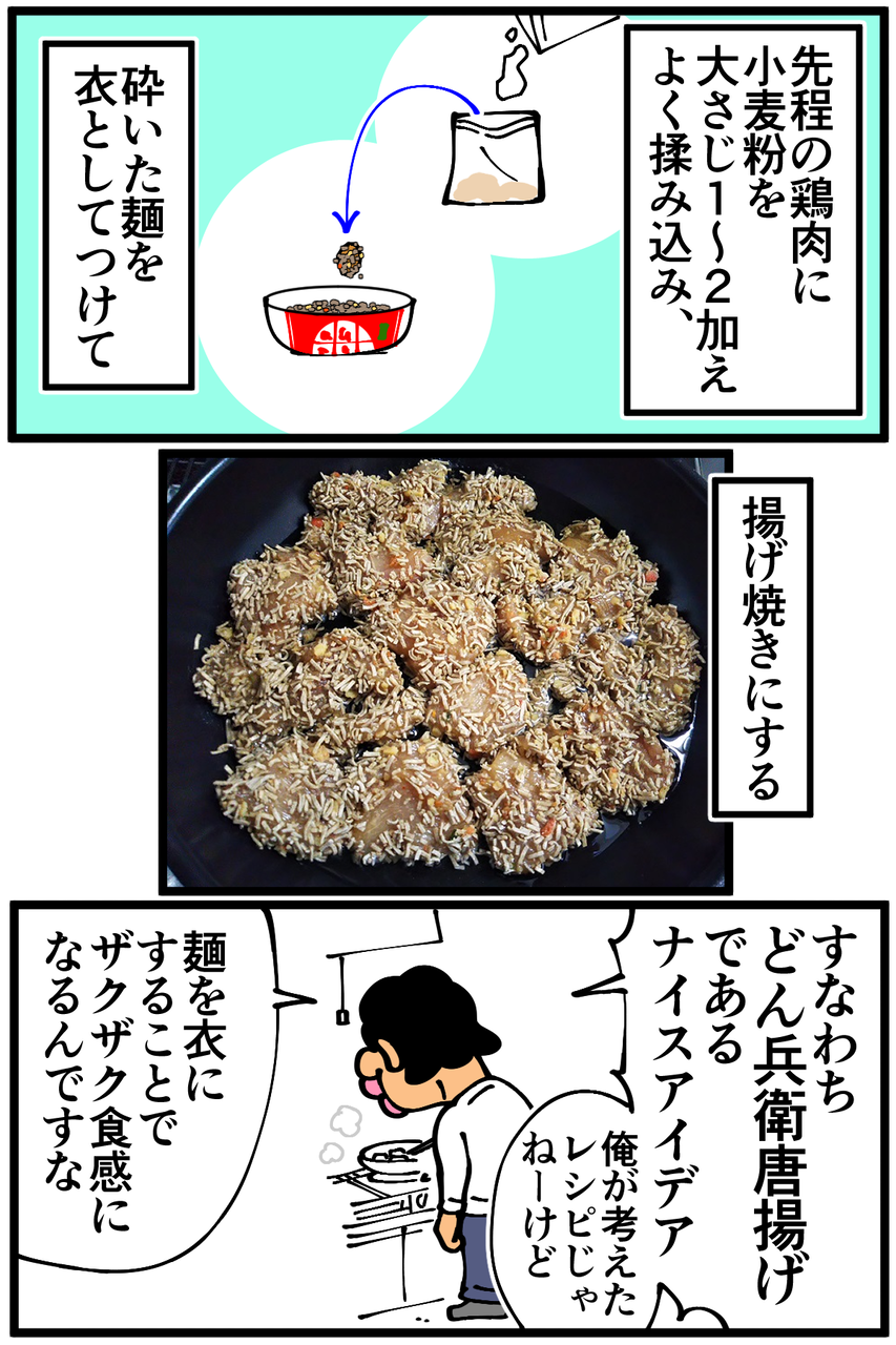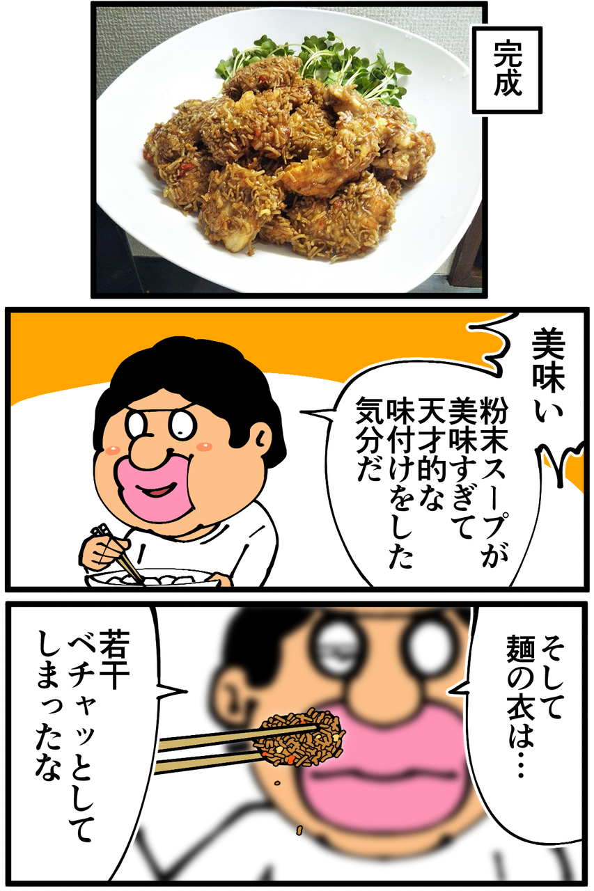 第919話「どん兵衛唐揚げを作る」 2021年12月13日 安アパートでカツカツな生活を送る男の漫画ブログです。金が底を尽きてくたばるようなことがなければ毎日更新します。写真を全部消していたので載せられないんですが、俺が唐揚げに挑戦すると毎回ベチャベチャ過ぎてある意味ジューシーな唐揚げもどきが完成します。油ケチりすぎなんでしょうか。とりあえずどん兵衛唐揚げは最高に美味しかったのでオススメです。次の記事↓ ザクザクの衣を求めてコーンフレークを衣にした時の話↓●Twitterやってます。●登録していただくと更新通知がLINEで届きます↓ 「絵日記」カテゴリの最新記事 「料理」カテゴリの最新記事 < 前の記事次の記事 > コメント コメント一覧 (24) 1. なめこ 2021年12月13日 22:52 笑いながら砕いてる姿はどこのサイコパスかと思った((( ;゚Д゚))) 0 taikutsu_ken がしました 13. 退屈健 2021年12月17日 19:50 >>1 完全にサイコパスでした!笑 0 taikutsu_ken がしました 2. ぱいぱい 2021年12月13日 23:09 くるみを砕く工程で気合入れすぎて粉末にして怒られた僕よりはだいぶいいですよ!!笑 0 taikutsu_ken がしました 14. 退屈健 2021年12月17日 19:50 >>2 くるみを粉末に!それはかなり大変そうですね!笑 0 taikutsu_ken がしました 3. フライハイ 2021年12月13日 23:30 フライパンの底で叩いてみてはいかがでしょうか……? 0 taikutsu_ken がしました 15. 退屈健 2021年12月17日 19:50 >>3 なるほど、その手が…!! 0 taikutsu_ken がしました 4. ななし 2021年12月13日 23:40 柿の種なんかで作るのもありますね 0 taikutsu_ken がしました 16. 退屈健 2021年12月17日 19:51 >>4 なるほど、柿の種も美味しそう!!今度試してみます! 0 taikutsu_ken がしました 5. あおい 2021年12月13日 23:52 ベチャベチャになるのは油が少ないのではなくて温度が低いのではないでしょうか?あとオリーブオイルじゃなくてサラダ油で揚げてみてはいかがでしょう? 0 taikutsu_ken がしました 17. 退屈健 2021年12月17日 19:52 >>5 確かに…!一気に揚げ過ぎて油の温度がかなり下がってると思われます😭 サラダ油で少量ずつ揚げるようにしてリベンジしてみます、ありがとうございます! 0 taikutsu_ken がしました 6. りん 2021年12月14日 06:12 足で踏めばいいのでは 0 taikutsu_ken がしました 18. 退屈健 2021年12月17日 19:52 >>6 あっ、確かに…! 0 taikutsu_ken がしました 7. ゆきちお 2021年12月14日 07:37 揚げ油の温度を高くするとカリっとカラッと上がりますよ。 と言いつつ私も揚げ物下手っぴですわ。 0 taikutsu_ken がしました 19. 退屈健 2021年12月17日 19:53 >>7 一気に全部投入したので油の温度下がってしまったんですかね…! 温度に気を付けつつリベンジしてみます! 0 taikutsu_ken がしました 8. まー 2021年12月14日 07:51 これは美味しそう! 私は揚げ物苦手で、中まで焼けたか心配でいつもパッサパサになります🤣 0 taikutsu_ken がしました 20. 退屈健 2021年12月17日 19:53 >>8 俺も揚げ物に限らず焼け具合が不安で基本いつも加熱時間長すぎになります!笑 0 taikutsu_ken がしました 9. 以下、名無し 2021年12月14日 09:43 箸で持っているのがベビースターの丸く固まっているのに似てる(語彙力) 0 taikutsu_ken がしました 21. 退屈健 2021年12月17日 19:54 >>9 あれ美味しいですよね!笑 0 taikutsu_ken がしました 10. ぺんぺん 2021年12月14日 12:19 初耳です!そばなのがポイントなんでしょうね〜😃 うどんでやったらモチモチになるのかな笑 0 taikutsu_ken がしました 22. 退屈健 2021年12月17日 19:54 >>10 うどんver.でも試してみたいですね!どんな食感になるんだろう…! 0 taikutsu_ken がしました 11. 小手毬 2021年12月14日 15:11 私も揚げ物苦手! 天ぷらがカラッと揚がった試しがなく、 ベチャ…か 焦げっ…です。 揚げ物のコツを知りたくて料理教室にも通いましたが、先生が手伝ってくれるとカラッ♪ 一人でやったらやっぱりベチャ…でした(涙) 0 taikutsu_ken がしました 23. 退屈健 2021年12月17日 19:55 >>11 おおお、そうなんですか!先生のコツを是非盗みたいところですね!笑 0 taikutsu_ken がしました 12. やわらかぴあの 2021年12月16日 22:00 ステキ! 作り方も分かりやすい🎅🎄 今年のクリスマスチキンはこれに挑戦します🤘🎁 0 taikutsu_ken がしました 24. 退屈健 2021年12月17日 19:55 >>12 ありがとうございます! 是非オススメです~! 0 taikutsu_ken がしました コメントフォーム 名前 コメント 記事の評価 リセット リセット 顔 星 情報を記憶 コメントを投稿する