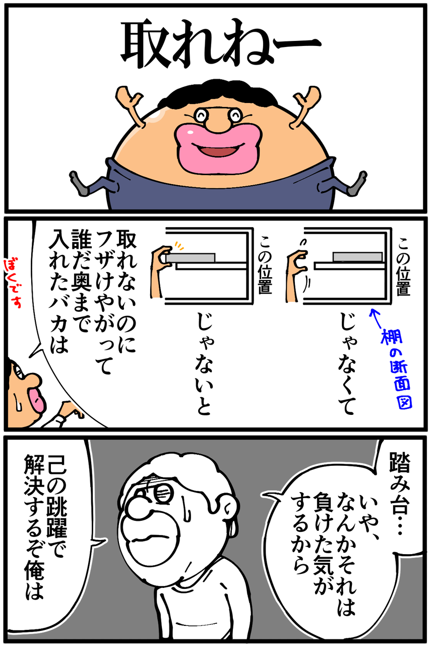 第922話「届かないアルミホイル」 2021年12月16日 安アパートでカツカツな生活を送る男の漫画ブログです。金が底を尽きてくたばるようなことがなければ毎日更新します。それ以降なんかずっと眠いんですが寝たらそのまま起きることがなさそうで怖いです。次の記事↓ 前のアパートで頭を打った(?)時の話↓●Twitterやってます。●登録していただくと更新通知がLINEで届きます↓ 「絵日記」カテゴリの最新記事 < 前の記事次の記事 > コメント コメント一覧 (57) 1. Nutty 2021年12月16日 22:04 すみません、笑ってまいました😂先生大丈夫?(取って付けたような心配) 0 taikutsu_ken がしました 30. 退屈健 2021年12月17日 22:41 >>1 ありがとうございます!なんとか大丈夫でした!笑 0 taikutsu_ken がしました 2. やわらかぴあの 2021年12月16日 22:06 頭は…心配だな 違和感があるなら動けるうちに診てもらったほうがいいかと思います🥺 でもそういう頭の打ち方私もよくやってた〜🤯 0 taikutsu_ken がしました 31. 退屈健 2021年12月17日 22:42 >>2 頭は怖いですよね…! ありがとうございます、何かあったらすぐに診てもらおうと思います! 0 taikutsu_ken がしました 3. なめこ 2021年12月16日 22:08 描いてる場合なんですか⁉️ 0 taikutsu_ken がしました 32. 退屈健 2021年12月17日 22:42 >>3 なんとか大丈夫でした!笑 0 taikutsu_ken がしました 4. とくめい 2021年12月16日 22:11 置く時に勢いよくシューって置くから滑って奥までいってしまって取れないんですよねわかります(170cm) 0 taikutsu_ken がしました 33. 退屈健 2021年12月17日 22:43 >>4 あるあるですよね~!奥までシュッと!笑 0 taikutsu_ken がしました 5. かっとびランサー 2021年12月16日 22:13 ぶつけたコマ見た瞬間「あっ」って声出ました それ絶対痛いやつじゃないですか大丈夫ですか 0 taikutsu_ken がしました 34. 退屈健 2021年12月17日 22:43 >>5 不意打ちでめちゃくちゃ痛かったです!笑 ありがとうございます、大丈夫です~! 0 taikutsu_ken がしました 6. はんな 2021年12月16日 22:17 退屈先生の暮らしぶりをブログで見てるだけで、分かった気になるなって感じなんですけど、ほんとに無償でいいから家政婦しに行きたいと思いますね😅 とりあえず座ってブログ等々書いてくださってればご飯くらいは作ってあげられるので(笑) マジでいつか大怪我しそうで心配です💦 0 taikutsu_ken がしました 35. 退屈健 2021年12月17日 22:43 >>6 いえいえいえ、そんなあまりに恐れ多いです!!笑 そのお気持ちだけでめちゃくちゃ嬉しいです~!ありがとうございます!😭 0 taikutsu_ken がしました 7. 🏳️🌈🗿🏳️🌈 2021年12月16日 22:32 頭をぶつけてるコマを見て内腿がヒヤッとしました 0 taikutsu_ken がしました 36. 退屈健 2021年12月17日 22:45 >>7 盛大にいきました!笑 0 taikutsu_ken がしました 8. のぞみ 2021年12月16日 22:35 頭はホントに心配。 少しでも違和感があったら受診してください。なんでもなければ、何でもなくて良かったねって笑って終われますから。 0 taikutsu_ken がしました 37. 退屈健 2021年12月17日 22:46 >>8 ご心配頂きありがとうございます!!😭 笑い話で済ませられるよう気を付けます! 0 taikutsu_ken がしました 9. Kk 2021年12月16日 22:38 絶対痛いやつw お大事に! 0 taikutsu_ken がしました 38. 退屈健 2021年12月17日 22:46 >>9 痛かったです…!笑 ありがとうございます! 0 taikutsu_ken がしました 10. かめ 2021年12月16日 22:41 これやったことあります。悶絶しました。 0 taikutsu_ken がしました 39. 退屈健 2021年12月17日 22:47 >>10 予測してないと痛さ100倍ですよね!笑 0 taikutsu_ken がしました 11. アルミホイル 2021年12月16日 22:48 取れてよかったです 0 taikutsu_ken がしました 40. 退屈健 2021年12月17日 22:47 >>11 取るという目的は無事達成できました!笑 0 taikutsu_ken がしました 12. ふーちゃ 2021年12月16日 23:01 ヒイイッ……痛そう>.< 結果的にアルミホイル取れたみたいですが代償がでかい…… ヤバそうだったらすぐ病院へGo! 0 taikutsu_ken がしました 41. 退屈健 2021年12月17日 22:48 >>12 ありがとうございます、違和感があったらすぐ診てもらおうと思います! 0 taikutsu_ken がしました 13. 怖すぎます 2021年12月16日 23:04 ジャンプの前は頭上確認よし!ですね 0 taikutsu_ken がしました 42. 退屈健 2021年12月17日 22:48 >>13 本当頭上確認大事ですね!! 0 taikutsu_ken がしました 14. 素ープLv.5 2021年12月16日 23:13 先生、笑っちゃいました(笑) 漫画にできているということは 無事と思ってよさそうですか? 頭を強く打つとあぶないので 違和感があったらすぐ病院へいってくださいね! 0 taikutsu_ken がしました 43. 退屈健 2021年12月17日 22:49 >>14 ご心配頂きありがとうございます!! どうにか無事でした! 0 taikutsu_ken がしました 15. あ 2021年12月17日 00:00 先生頭大丈夫ですか?(ダブルミーニング) 0 taikutsu_ken がしました 44. 退屈健 2021年12月17日 22:49 >>15 打った方は大丈夫ですがおかしい方の意味では大丈夫じゃないです!笑 0 taikutsu_ken がしました 16. 名無しさん 2021年12月17日 00:38 いっっっっったそ!!!!! ご自愛くだされ 0 taikutsu_ken がしました 45. 退屈健 2021年12月17日 22:49 >>16 ありがとうございます!