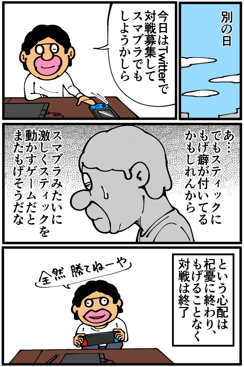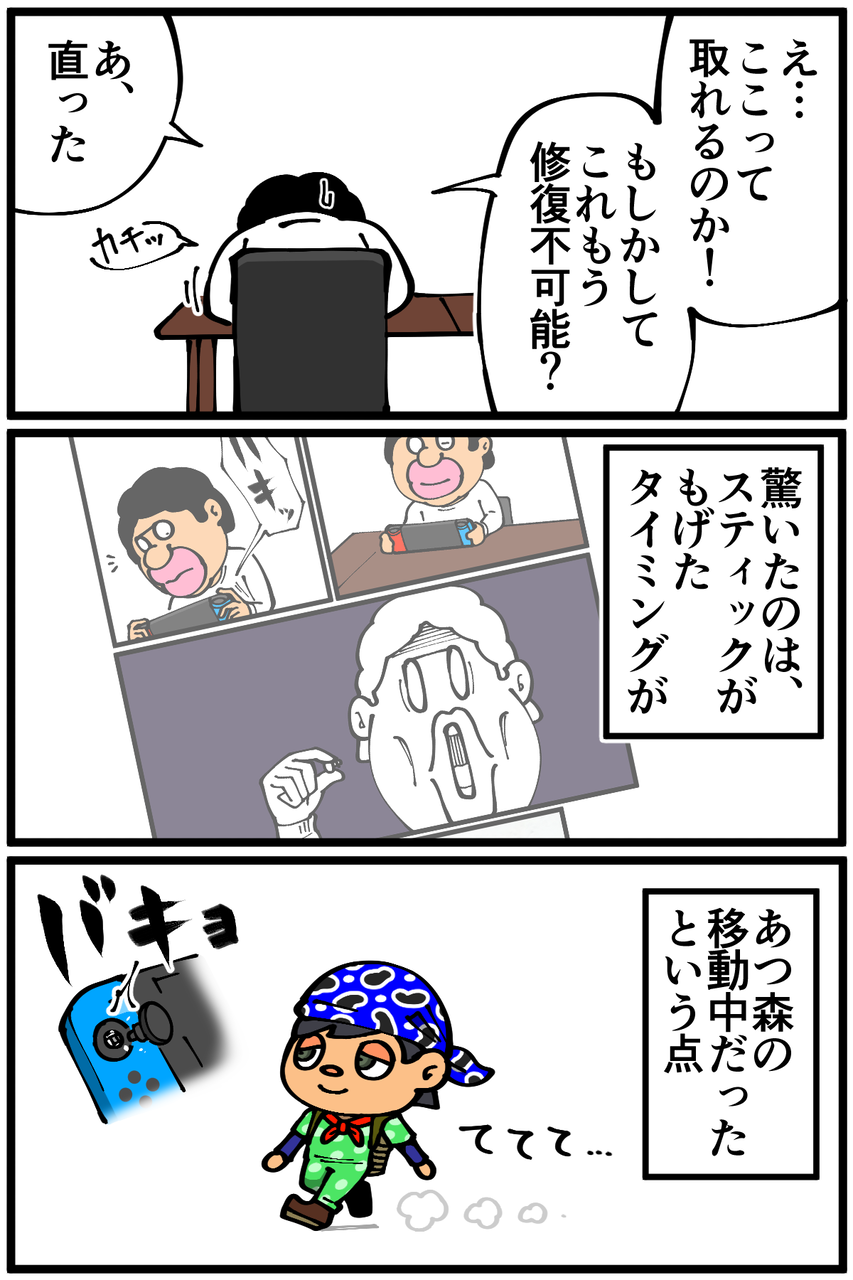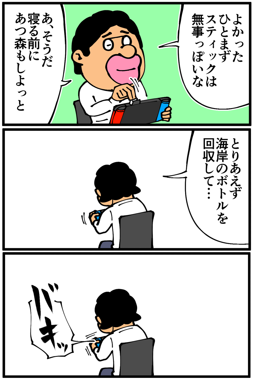 第944話「Switchのコントローラー」 2022年01月11日 安アパートでカツカツな生活を送る男の漫画ブログです。金が底を尽きてくたばるようなことがなければ毎日更新します。計4回もげたんですが全部あつ森で歩いてる時に起きてます。無意識にうちにめちゃくちゃ力入れてスティック倒してるんだろうか…。ゲーム関連の記事一覧↓次の記事↓ ゲームの思い出↓●Twitterやってます。●登録していただくと更新通知がLINEで届きます↓ 「絵日記」カテゴリの最新記事 < 前の記事次の記事 > コメント コメント一覧 (26) 1. なめこ 2022年01月11日 20:39 ゴミだらけにした祟り……。 0 taikutsu_ken がしました 13. 退屈健 2022年01月22日 01:36 >>1 なるほど、散らかした祟りでしたか…!笑 0 taikutsu_ken がしました 2. dd 2022年01月11日 20:42 壊れやすいってよく聞きます💦 0 taikutsu_ken がしました 14. 退屈健 2022年01月22日 01:38 >>2 そうなんですね~😭 0 taikutsu_ken がしました 3. まりも 2022年01月11日 21:20 退屈先生モニターなしであんだけスマブラ強いのすごいですね 0 taikutsu_ken がしました 15. 退屈健 2022年01月22日 01:38 >>3 とんでもないです、いつも動くサンドバッグ状態です!笑 0 taikutsu_ken がしました 4. みあ 2022年01月11日 21:21 不便なんで買い替えましょ 130素パスタはしますが… 0 taikutsu_ken がしました 16. 退屈健 2022年01月22日 01:39 >>4 130素パスタ…!厳しい…!笑 0 taikutsu_ken がしました 5. 以下、名無し 2022年01月11日 22:15 自分は3DSの頃のモンハンをやりすぎてRボタンが効かなくなりました。、。 0 taikutsu_ken がしました 17. 退屈健 2022年01月22日 01:39 >>5 モンハンはそこを多用する感じでしたか!笑 0 taikutsu_ken がしました 6. ねこ 2022年01月11日 22:23 ジョイコンは買うのも修理も非常に財布に痛いので悩みどころですね… 0 taikutsu_ken がしました 18. 退屈健 2022年01月22日 01:39 >>6 そうなんですよね…!😭 0 taikutsu_ken がしました 7. み 2022年01月11日 22:40 サムネで部品食べるのかと思いました 0 taikutsu_ken がしました 19. 退屈健 2022年01月22日 01:40 >>7 勢い余って食べそうになりました!笑 0 taikutsu_ken がしました 8. 鳥土竜 2022年01月11日 23:04 ジョイコンは良く中でスティック折れて勝手に曲がると聞くけどもげるは初めて聞いたな…。今安いプロコンなら2000円行かないくらいで買えるのもあるし修理出すより安いでしょうね。ジョイコンはマジで欠陥品なので安くても買い直したり修理出したりは止めた方がいいです。 0 taikutsu_ken がしました 20. 退屈健 2022年01月22日 01:40 >>8 おおお、そうなんですね! 俺もついにプロコンデビューの時が…!笑 0 taikutsu_ken がしました 9. チョコミント 2022年01月11日 23:31 これを機にコントローラー沼へ堕ちましょう…😇 0 taikutsu_ken がしました 21. 退屈健 2022年01月22日 01:40 >>9 こだわってみたいですね!笑 0 taikutsu_ken がしました 10. ゆきちお 2022年01月12日 03:54 アレって取れるんだ😱 0 taikutsu_ken がしました 22. 退屈健 2022年01月22日 01:41 >>10 俺もビックリでした!笑 0 taikutsu_ken がしました 11. ぺんぺん 2022年01月12日 07:44 純正のプロコンも壊れやすいから…そういう仕様なのは仕方ないんでしょうね(´・ω・`) ジョイコン買い直すと8千円だし、踏ん切りがつきづらいですよね〜 0 taikutsu_ken がしました 23. 退屈健 2022年01月22日 01:41 >>11 そうなんですよね~、かなりの痛い出費に…! 0 taikutsu_ken がしました 12. 名無し 2022年01月14日 14:44 こんなにあつ森に力入れてる人初めて見たわ 0 taikutsu_ken がしました 24. 退屈健 2022年01月22日 01:41 >>12 何故かフルパワーでスティック倒して移動していたようです!笑 0 taikutsu_ken がしました 25. ゲーマー主婦 2022年02月20日 13:04 モゲはしないんですが ジョイコンを触ってないのに何故か 左に行きつづけます ドラクエ10とどうぶつの森を やってる時高確率でなりますね コレで3回既に買い直しました... 0 taikutsu_ken がしました 26. ゴリ 2023年05月24日 20:21 同じくあつ森にハマってる時期にJoy-Conスティックが故障しました… 島の端から端まで歩く(倒しっぱなし)だったりするからですかね。 0 taikutsu_ken がしました コメントフォーム 名前 コメント 記事の評価 リセット リセット 顔 星 情報を記憶 コメントを投稿する