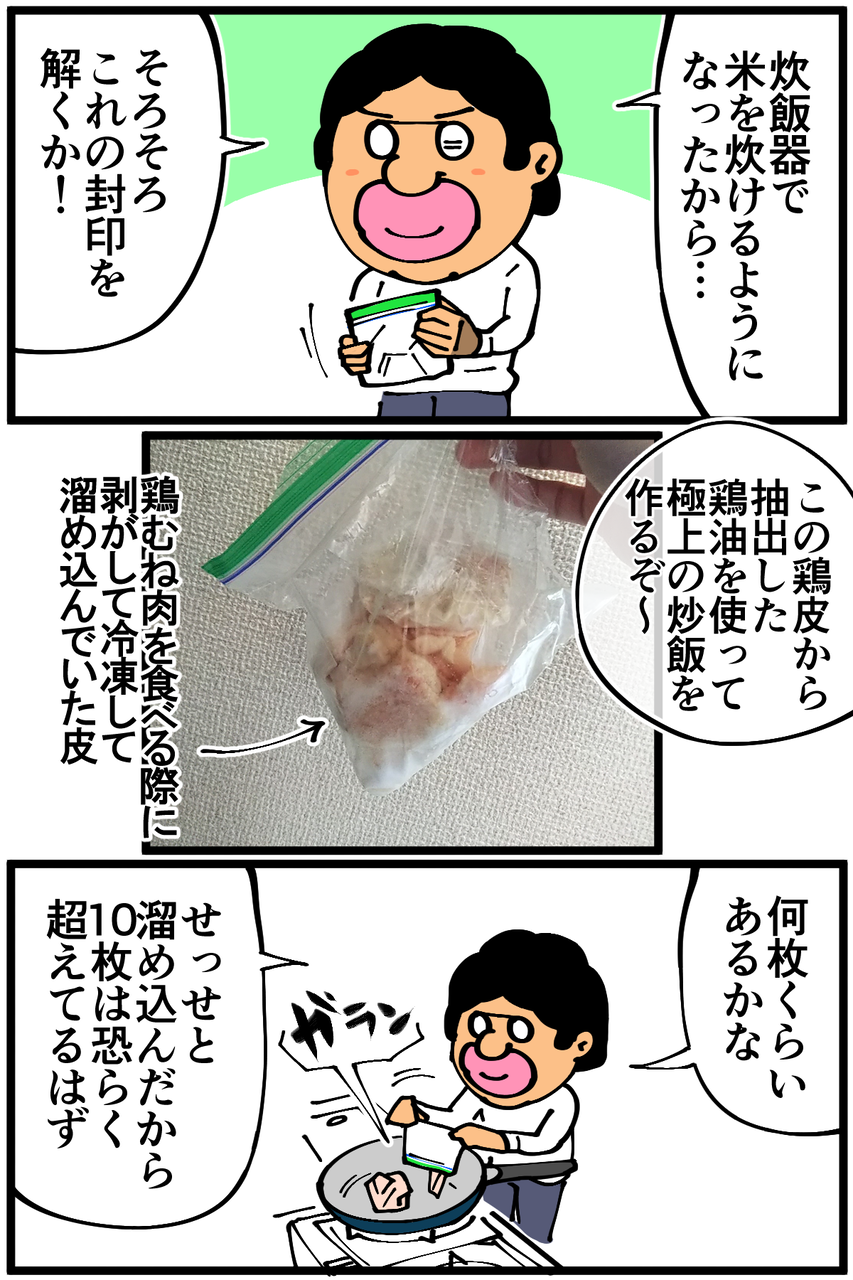 第953話「溜め込んだ鶏皮を開封」 2022年01月22日 安アパートでカツカツな生活を送る男の漫画ブログです。金が底を尽きてくたばるようなことがなければ毎日更新します。何故10枚以上あると思い込んでいたのかは謎。多分鶏油が楽しみすぎて4から先の数字が数えられなくなったんだと思います。次回に続きます。続き↓ 前に鶏油を使って料理した時の話↓ ●Twitterやってます。●登録していただくと更新通知がLINEで届きます↓ 「絵日記」カテゴリの最新記事 < 前の記事次の記事 > コメント コメント一覧 (24) 1. なめこ 2022年01月22日 23:01 何だろう。 頑張れ😅 0 taikutsu_ken がしました 13. 退屈健 2022年01月25日 12:04 >>1 頑張ります!笑 0 taikutsu_ken がしました 2. えび 2022年01月22日 23:05 いやいや、それが油めっちゃ出るんだなぁ〜これが! 0 taikutsu_ken がしました 14. 退屈健 2022年01月25日 12:05 >>2 意外と出ますね!と思ったら俺の技術不足で瓶を使うほどではありませんでした😭 0 taikutsu_ken がしました 3. ななし 2022年01月22日 23:13 僕が食べちゃいました! 0 taikutsu_ken がしました 11. 唐揚げ 2022年01月23日 12:31 >>3 僕も食べちゃいました! 0 taikutsu_ken がしました 15. 退屈健 2022年01月25日 12:05 >>3 鶏皮限定というピンポイントな空き巣!笑 0 taikutsu_ken がしました 4. とくめい 2022年01月22日 23:22 あれ?毎日読んでるのに炊飯器買ってましたっけ? 忘れてるのかな… 0 taikutsu_ken がしました 16. 退屈健 2022年01月25日 12:06 >>4 そうなんです、ようやく最近買いました!🍚 0 taikutsu_ken がしました 5. とくめい 2022年01月22日 23:23 945話で買ってましたね失礼しました 最近物忘れがひどい…… 0 taikutsu_ken がしました 17. 退屈健 2022年01月25日 12:06 >>5 いえいえ、とんでもないです!今後炊飯器ガンガン使っていきます~! 0 taikutsu_ken がしました 6. シュフ 2022年01月23日 00:05 鶏の油は美味しすぎて堪らないですよね! 鶏皮をフライパンに押し付けて焼いたらもっと油出そうだけど…次の更新楽しみにしてます。笑 0 taikutsu_ken がしました 18. 退屈健 2022年01月25日 12:07 >>6 なるほど、押し付けて焼く!今度作る時はもっとグッと押し付けます!! 0 taikutsu_ken がしました 7. あおい 2022年01月23日 00:28 鶏皮は茹でてもみじおろしとポン酢で食べると超旨いです! ゆで汁は鶏の旨味がめっちゃ出てるので適当に野菜入れて鶏がらスープの素や醤油などで味付けすると高級中華スープの出来上がり! 0 taikutsu_ken がしました 19. 退屈健 2022年01月25日 12:14 >>7 茹でてポン酢で食べるのもさっぱりしてて美味しいですよね~!もみじおろし買わなきゃ!! 0 taikutsu_ken がしました 8. うーろん 2022年01月23日 01:49 自分も鶏皮冷凍してたまったら鶏油とってます😊 量は結構ためて、弱火でじっくり時間をかけて…… いいですよね〜 0 taikutsu_ken がしました 20. 退屈健 2022年01月25日 12:15 >>8 鶏油最高ですね! 今度はもう少し溜め込んでまた作ってみます! 0 taikutsu_ken がしました 9. ゆきちお 2022年01月23日 04:27 油、結構出ますよね⁉️瓶の半分は行きそう😁 カラカラに焼いた鶏皮せんべいは美味しいですし。 飛び散る油の掃除がめんどいけど。 0 taikutsu_ken がしました 21. 退屈健 2022年01月25日 12:15 >>9 結構出たんですが、俺の技術不足で瓶を使うほどではありませんでした😭 確かに油の飛び散り方はなかなかですね!笑 0 taikutsu_ken がしました 10. ひまわり 2022年01月23日 10:13 鶏油、業務スーパーで激安で買えますよ! 0 taikutsu_ken がしました 22. 退屈健 2022年01月25日 12:16 >>10 おお、そうなんですね!自作鶏油用に買おうかな…! 0 taikutsu_ken がしました 12. ぱいぱい 2022年01月23日 21:25 カリッカリの皮を砕いてチャーハンに…最高ですよ! 0 taikutsu_ken がしました 23. 退屈健 2022年01月25日 12:16 >>12 最高の具ですね! 0 taikutsu_ken がしました 24. はな 2022年01月27日 05:01 福岡ですが、スーパーで鶏皮だけ安くで売ってます 先生のところはないのですか? 送ってあげたい( ´ ▽ ` ) 0 taikutsu_ken がしました コメントフォーム 名前 コメント 記事の評価 リセット リセット 顔 星 情報を記憶 コメントを投稿する