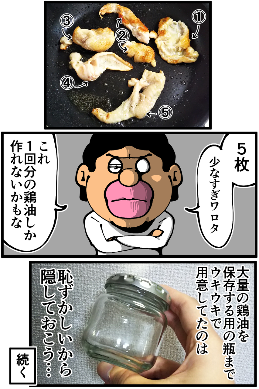 鶏皮をフライパンに押し付けて焼いたらもっと油出そうだけど…次の更新楽しみにしてます。笑