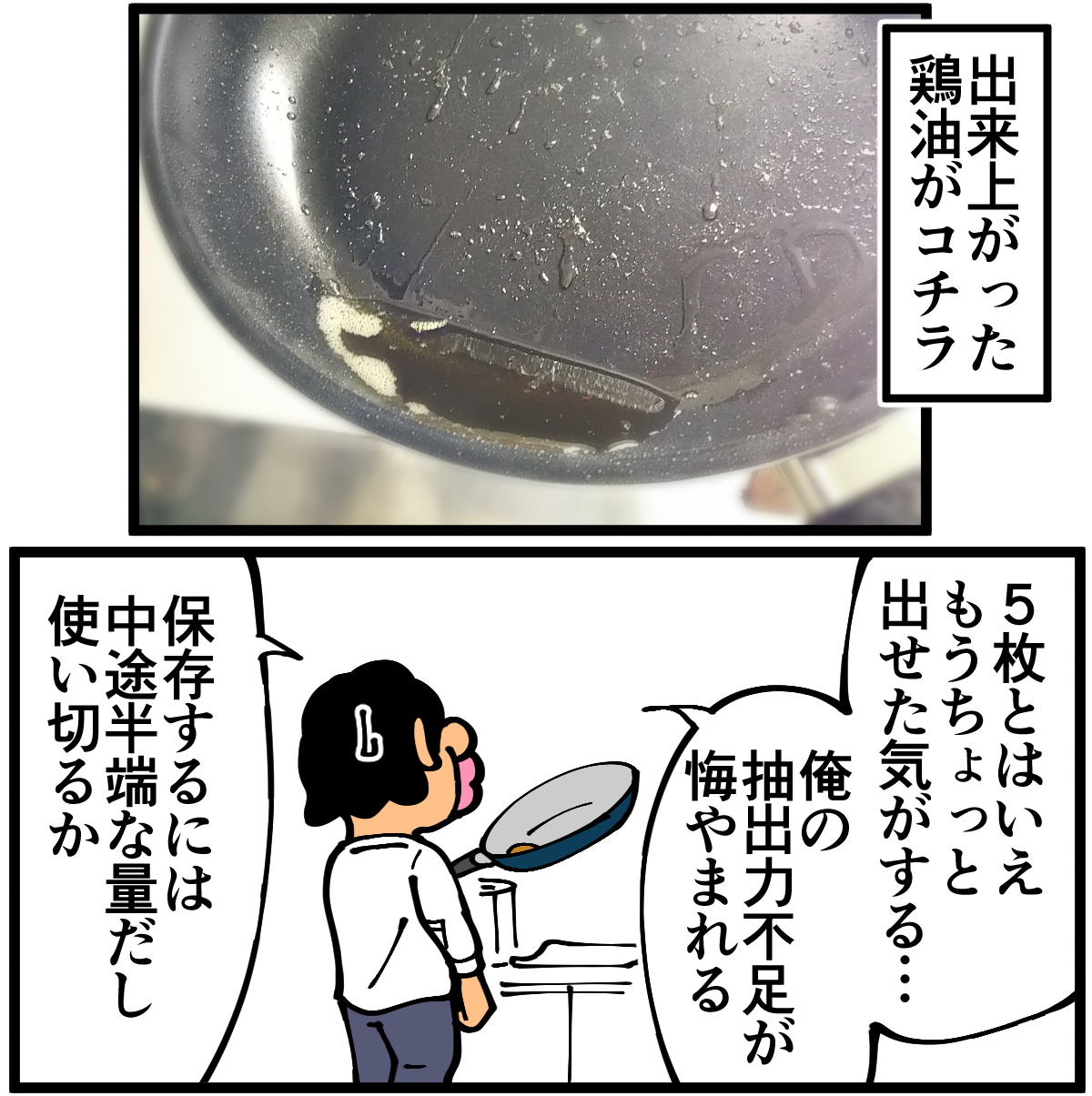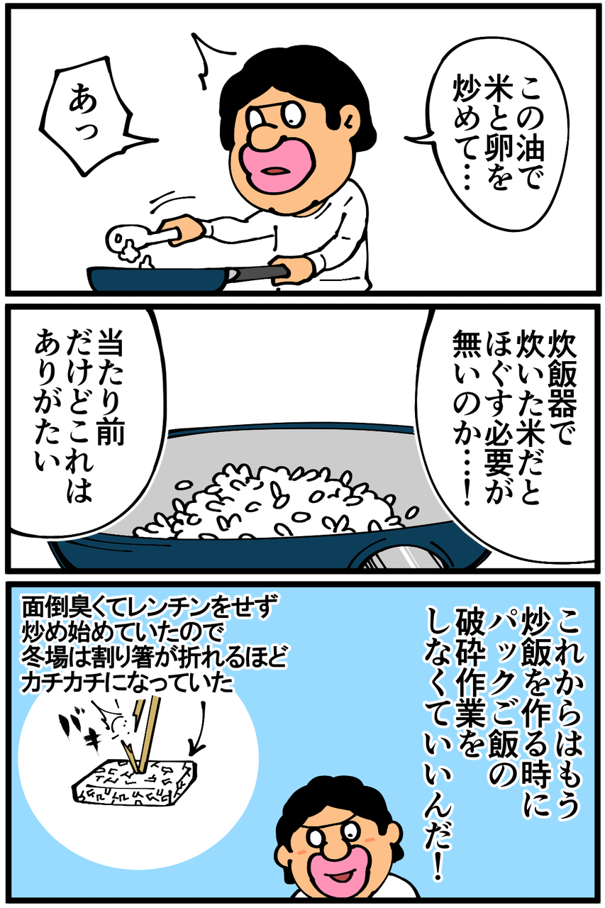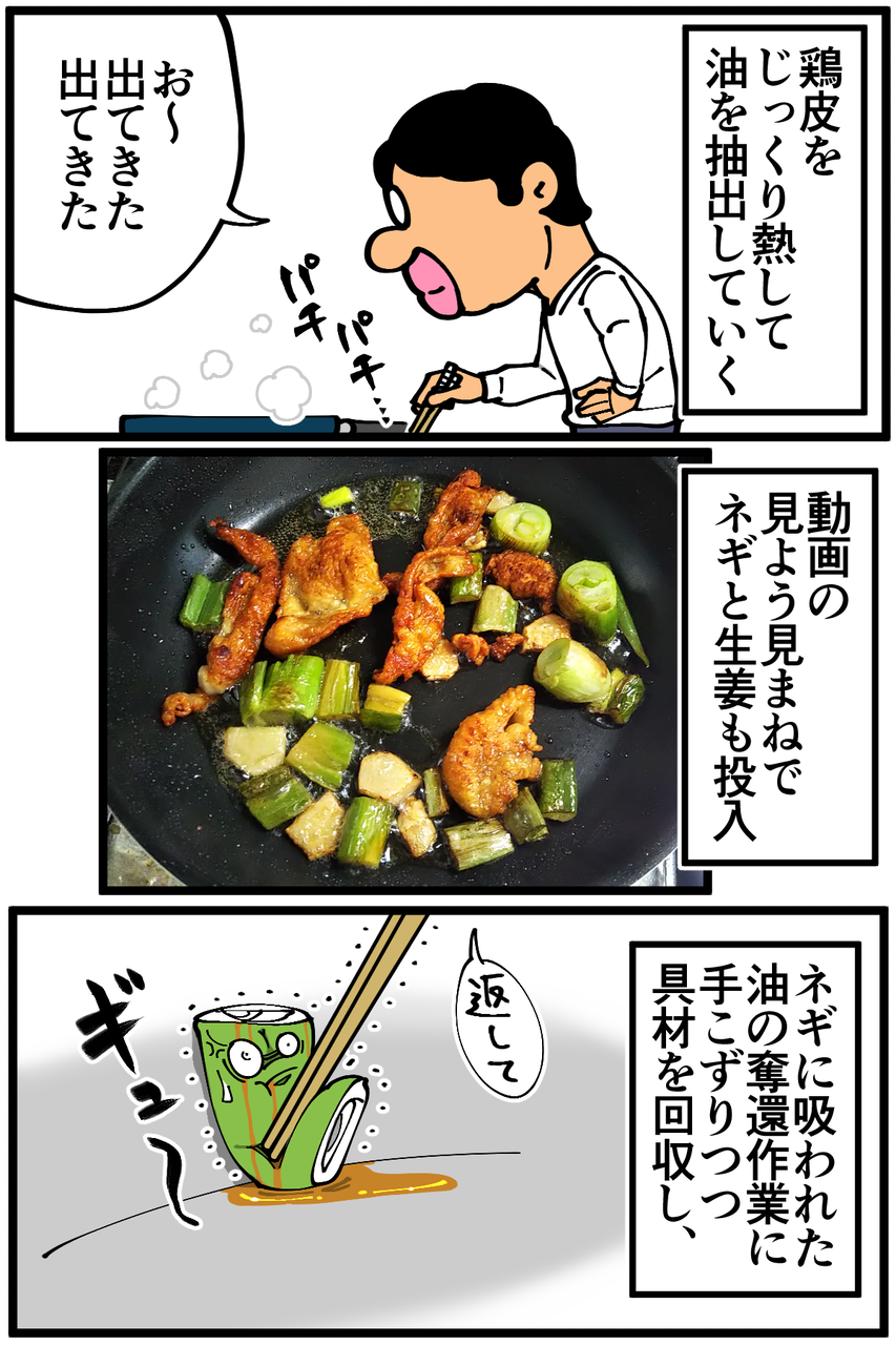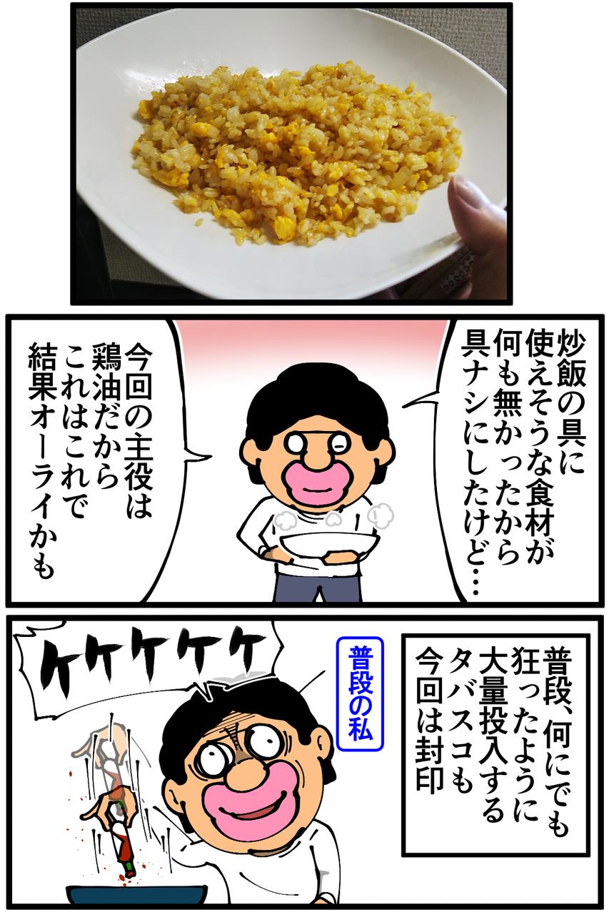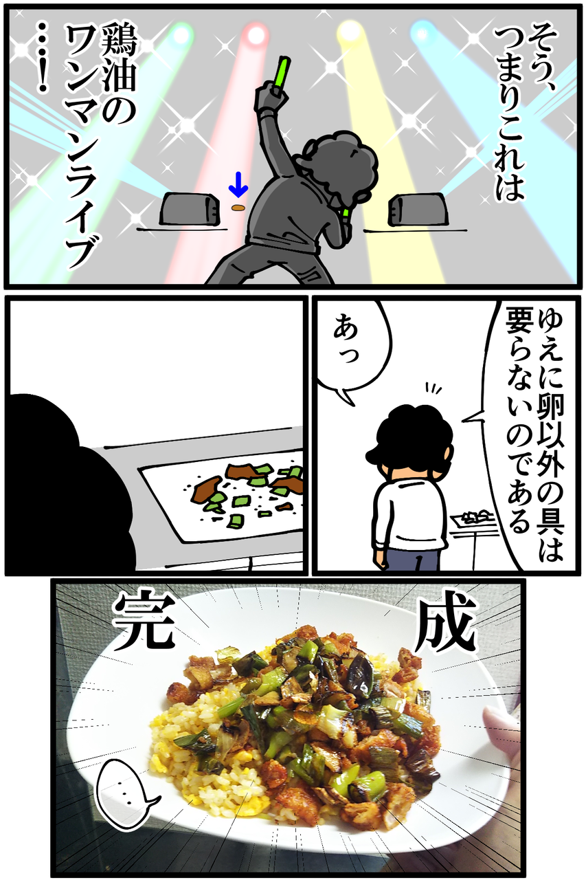 第954話「鶏油炒飯を作る」 2022年01月23日 安アパートでカツカツな生活を送る男の漫画ブログです。金が底を尽きてくたばるようなことがなければ毎日更新します。前回の記事 の続きです。せっかくなので役目を終えた鶏油部隊を刻んでのせてみたら予想以上に存在感が大きくて主役が見えなくなりました。でもめちゃくちゃ美味しかったのでヨシ!次の記事↓ 前のアパートで作っていた謎の料理↓ ●Twitterやってます。●登録していただくと更新通知がLINEで届きます↓ 「絵日記」カテゴリの最新記事 「料理」カテゴリの最新記事 < 前の記事次の記事 > コメント コメント一覧 (20) 1. ちゃー 2022年01月23日 22:22 冷えご飯で作るとベタベタしないからより作りやすいですよ 0 taikutsu_ken がしました 11. 退屈健 2022年01月25日 12:17 >>1 確かに、冷や飯の方がベチャッとしづらくていいですね! 0 taikutsu_ken がしました 2. NaNa4 2022年01月23日 22:25 何やかんやで美味しい仕上がりになったようで良かったです(笑) 先生の料理は楽しそうで、そこんところ見習いたいです。。(自分は生きるためにのみ料理をしているので。。) 0 taikutsu_ken がしました 12. 退屈健 2022年01月25日 12:17 >>2 なんだかんだで美味しかったです!笑 とんでもないです、ありがとうございます!! 0 taikutsu_ken がしました 3. よもぎもち 2022年01月23日 22:32 このブログを夜に見るからますますお腹が減ってくるー。って以前ではこの感覚はなかったけど、最近先生のお料理に魅力を感じてしまうのは明らかに腕を上げられたから?某イタリアンシェフみたいに上から目線ですいません。でも素パスタ時代にはなかったんですー。 0 taikutsu_ken がしました 13. 退屈健 2022年01月25日 12:18 >>3 おお、本当ですか!飯テロブログになれるよう精進します!笑 0 taikutsu_ken がしました 4. なめこ 2022年01月23日 22:33 ハイパードラゴン飯改。 0 taikutsu_ken がしました 14. 退屈健 2022年01月25日 12:18 >>4 ドラゴンが進化しました!笑 0 taikutsu_ken がしました 5. カバ 2022年01月24日 01:44 このブログ、料理タグを最初から読んでいくと段々人類になっていく感じがしますね 0 taikutsu_ken がしました 15. 退屈健 2022年01月25日 12:19 >>5 古代からの人類の進化を一人で再現してます!笑 0 taikutsu_ken がしました 6. ゆきちお 2022年01月24日 03:40 もっと油出るかと思った😁 パックご飯てチンしないとそんなに硬いんですね。 0 taikutsu_ken がしました 16. 退屈健 2022年01月25日 12:19 >>6 上手な方だったらもっと出せていたと思います…!😭 0 taikutsu_ken がしました 7. ユーリ 2022年01月24日 08:25 具をたくさん入れないシンプルな方が美味しいですよね! どんどんお料理の幅が広がって、楽しく見てます!応援してます!! 0 taikutsu_ken がしました 17. 退屈健 2022年01月25日 12:19 >>7 ありがとうございます、色々挑戦していこうと思います~! 0 taikutsu_ken がしました 8. ぺんぺん 2022年01月24日 09:58 めっちゃ美味しそう!なんだかんだそういうのが1番美味しいんですよね笑 0 taikutsu_ken がしました 18. 退屈健 2022年01月25日 12:20 >>8 ありがとうございます!悪魔的な油の旨味でした!笑 0 taikutsu_ken がしました 9. 以下、名無し 2022年01月24日 10:46 チャーハンにonせずに周りだったり、少しだけチャーハンに端に寄ってもらえたら・・・ 0 taikutsu_ken がしました 19. 退屈健 2022年01月25日 12:20 >>9 確かに、主役が隠れぬよう端に寄せるべきでしたね!笑 0 taikutsu_ken がしました 10. うーりゃ 2022年01月25日 11:33 鶏皮を冷凍なんて、先生、もう上級者じゃないですか! 鶏油悪魔炒飯ですね~。 0 taikutsu_ken がしました 20. 退屈健 2022年01月25日 12:21 >>10 鶏油の旨味はまさに悪魔的でした!笑 0 taikutsu_ken がしました コメントフォーム 名前 コメント 記事の評価 リセット リセット 顔 星 情報を記憶 コメントを投稿する