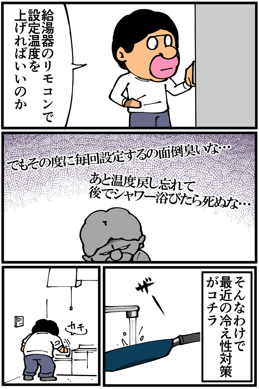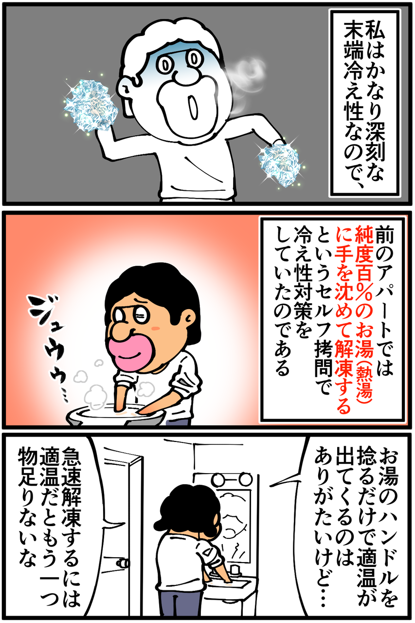 第967話「最近の冷え性対策」 2022年02月09日 安アパートでカツカツな生活を送る男の漫画ブログです。金が底を尽きてくたばるようなことがなければ毎日更新します。一応、安全のために①完全な沸騰状態にはしない②手を突っ込む前に火を止める③小まめに湯から出す、というルールを課してます。でもだいぶ危険だと思います(意味不明)。言われなくても誰もやらねーよという話ではあるのですが、ヤケドの恐れがあって危ないので絶対に真似しないでください。次の記事↓ 前のアパートでの熱湯拷問の様子↓●Twitterやってます。●登録していただくと更新通知がLINEで届きます↓●こちらのページから過去記事一覧が見られます↓ 「絵日記」カテゴリの最新記事 < 前の記事次の記事 > コメント コメント一覧 (68) 1. 東の天然土方 2022年02月09日 22:05 セラミックファンヒーターめっちゃオススメですよ!(もう冬終わりますけど笑) 0 taikutsu_ken がしました 35. 退屈健 2022年02月15日 21:29 >>1 セラミックファンヒーター! 来年の冬までにためらわず買うことができるよう頑張ります!笑 0 taikutsu_ken がしました 2. 小手毬 2022年02月09日 22:08 「手を茹でる」!! 生まれて初めて聞いたフレーズです(汗) w(゜o゜)w 恐ろしすぎて 「んふ」って笑ってしまった… 0 taikutsu_ken がしました 36. 退屈健 2022年02月15日 21:29 >>2 恐ろしい行為でした…!笑 0 taikutsu_ken がしました 3. ミヤポン 2022年02月09日 22:08 手を茹でる… やっぱり先生は凄えや🤣 0 taikutsu_ken がしました 37. 退屈健 2022年02月15日 21:29 >>3 危険な行為でした!笑 0 taikutsu_ken がしました 4. スズメ 2022年02月09日 22:14 何か特殊な拳法の修行ですか 0 taikutsu_ken がしました 38. 退屈健 2022年02月15日 21:30 >>4 繰り返したら何か会得出来てるかもしれないです!笑 0 taikutsu_ken がしました 5. おすかー 2022年02月09日 22:20 食べちゃだめですよ 0 taikutsu_ken がしました 39. 退屈健 2022年02月15日 21:30 >>5 わさび醤油でいただくところでした!笑 0 taikutsu_ken がしました 6. 名無しさん 2022年02月09日 22:22 えぇ… 0 taikutsu_ken がしました 40. 退屈健 2022年02月15日 21:31 >>6 危険な行為でした…!笑 0 taikutsu_ken がしました 7. とんこつ 2022年02月09日 22:24 ボイルドハンド? 0 taikutsu_ken がしました 41. 退屈健 2022年02月15日 21:31 >>7 立派なおかずになりますね!(狂気) 0 taikutsu_ken がしました 8. なめこ 2022年02月09日 22:25 太古の嘘発見器みたいですねぇ。 0 taikutsu_ken がしました 42. 退屈健 2022年02月15日 21:31 >>8 白状する所でした!笑 0 taikutsu_ken がしました 9. 2022年02月09日 22:25 いつか氷属性の能力者になれそう 0 taikutsu_ken がしました 43. 退屈健 2022年02月15日 21:31 >>9 指先だけ能力付与済みです!笑 0 taikutsu_ken がしました 10. 生き急いでいる?! 2022年02月09日 22:29 強硬手段過ぎる…💧 水とお湯交互に浸けると、 毛細血管の伸縮がポンプの役目を果たして 血行が良くなるらしいです。 それより、 もしかしたらそのひどい冷えは 鉄欠乏性貧血からくるものなのかもしれませんね。 対症療法ではなく、根本的な原因を特定した方がいいと思います。 みんな、心配していますよ🍀 0 taikutsu_ken がしました 44. 退屈健 2022年02月15日 21:33 >>10 なるほど、交互に…!ありがとうございます、試してみます!! ご心配いただき本当にありがとうございます😭 鉄不足は大いに心当たりがあるので十分にあり得そうな気がします…! 0 taikutsu_ken がしました 11. みょ 2022年02月09日 22:38 既にコメントされおられる方がいらっしゃいましたが やはり冷え性対策には水とお湯の交互をお奨めします あと血管は体を巡っているため、冷え性対策には 手だけでなく足湯もお奨めですよー! 0 taikutsu_ken がしました 45. 退屈健 2022年02月15日 21:34 >>11 交互にやる方法、知りませんでした!ありがとうございます、試してみます! 足湯もいいんですね~! 0 taikutsu_ken がしました 12. きみ 2022年02月09日 22:45 「くかたち」ですね 0 taikutsu_ken がしました 46. 退屈健 2022年02月15日 21:34 >>12 恥ずかしながら調べて初めて知りました!まさにそれですね!笑 0 taikutsu_ken がしました 13. かときち 2022年02月09日 22:59 それ逆に良くないみたいですよ〜💦 調べたら、「41℃以上の熱い湯は急激に体温を上げてしまい、体は懸命に体温を下げようとし、結果として体の温まりは長く続きません。体の温まりが長く続くのは、むしろぬるめの湯なのです」って書いてありました。 まぁ手じゃなくて身体全体の話ですけど。 で、40℃のお湯に全身浴で10〜15分つかるのが良いそうですよ☺️ 0 taikutsu_ken がしました 47. 退屈健 2022年02月15日 21:35 >>13 えええ、まさかの逆効果だったとは!!必死に逆効果の行為を…!笑 情報ありがとうございます!! 0 taikutsu_ken がしました 14. JIM 2022年02月09日 23:00 冷え性は血液の循環が悪くて起こるので指先ならハンドグリップいいですよ。 温めるのは根本的な解決策にならないけど悪いことではないので 最初に温めて手が楽になったら動きも良くなるのでハンドグリップで握力を鍛えて 血液循環をよくして冷え性対策してください。 結局