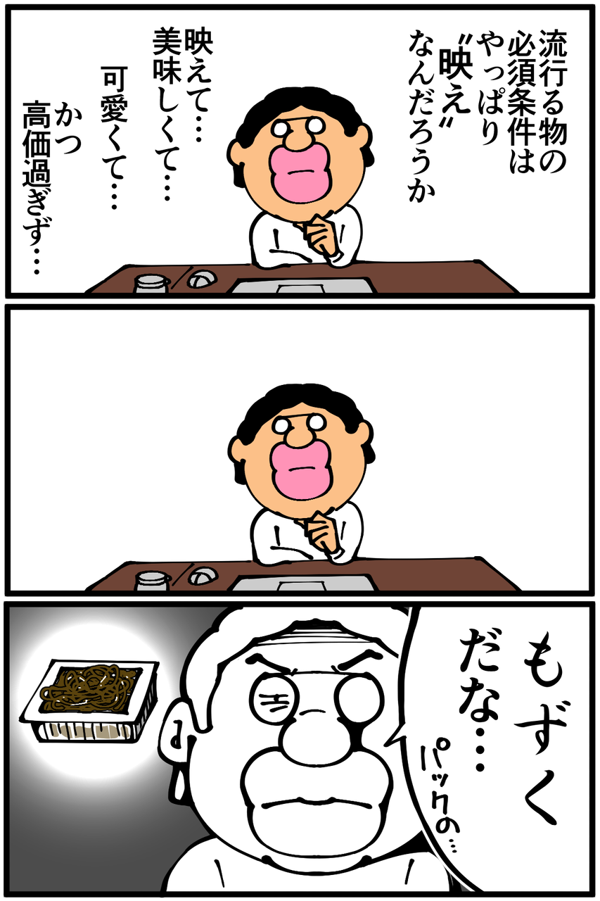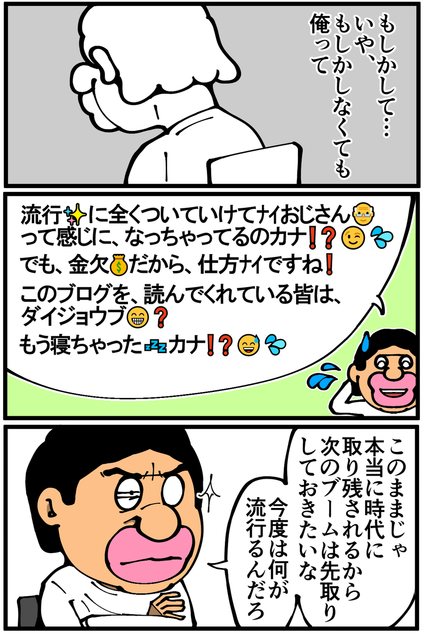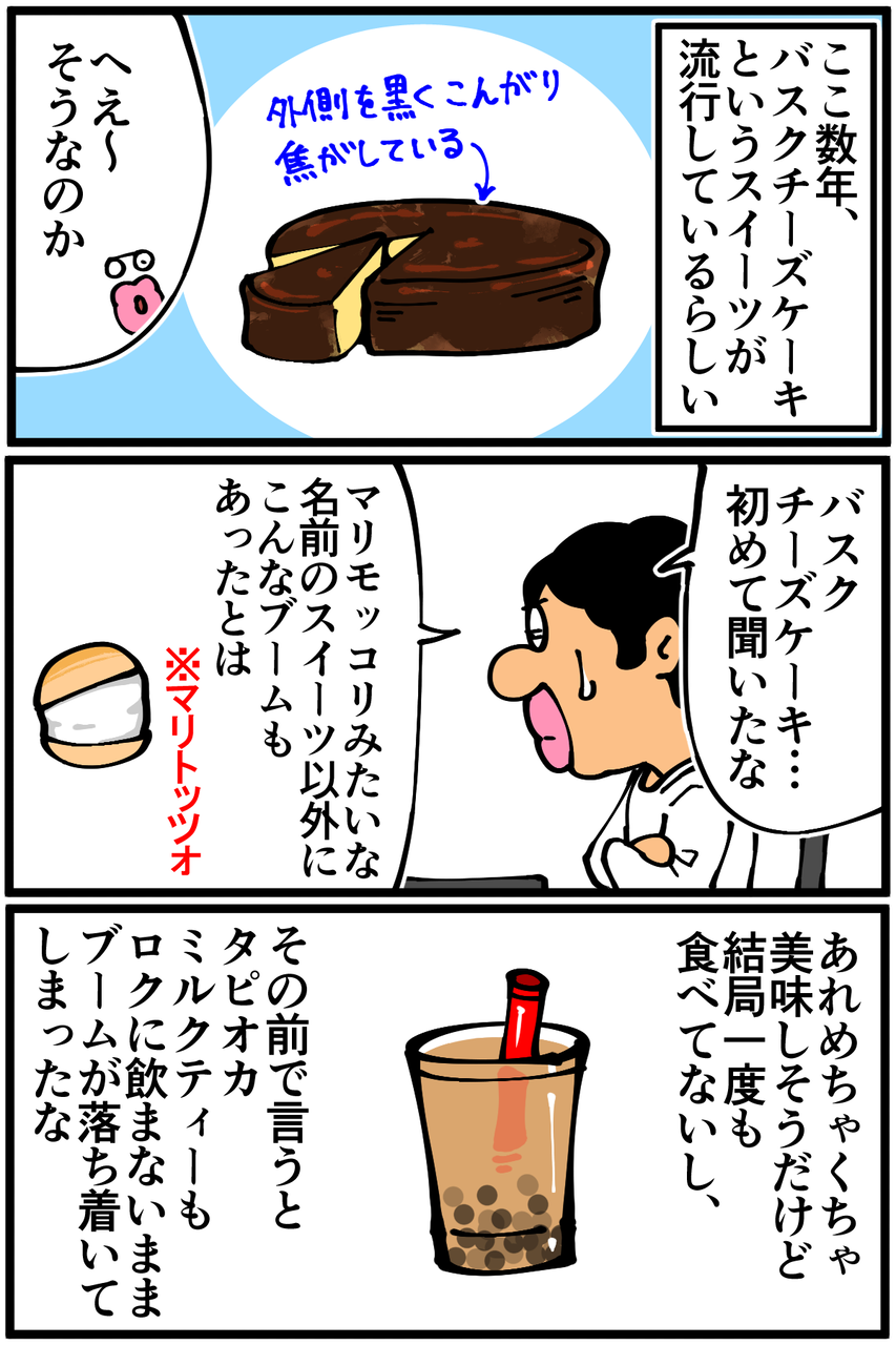 第975話「次のブーム予想」 2022年02月18日 安アパートでカツカツな生活を送る男の漫画ブログです。金が底を尽きてくたばるようなことがなければ毎日更新します。オッサンの想像力の限界です。次の記事↓ もはや自分の中での「最近」の定義すらおかしくなってきている↓●Twitterやってます。●登録していただくと更新通知がLINEで届きます↓●こちらのページから過去記事一覧が見られます↓ 「絵日記」カテゴリの最新記事 < 前の記事次の記事 > コメント コメント一覧 (39) 1. なめこ 2022年02月18日 22:06 好きなもの食え。 0 taikutsu_ken がしました 20. 退屈健 2022年02月23日 11:25 >>1 それが一番ですね!笑 0 taikutsu_ken がしました 2. 2022年02月18日 22:11 おじさん構文ブームには乗れてる 0 taikutsu_ken がしました 21. 退屈健 2022年02月23日 11:26 >>2 おじさんなので普通にしてるだけで勝手に乗れてました!笑 0 taikutsu_ken がしました 3. は? 2022年02月18日 22:12 は? 0 taikutsu_ken がしました 22. 退屈健 2022年02月23日 11:26 >>3 謎の予想に行き着きました!笑 0 taikutsu_ken がしました 4. 愛之助。 2022年02月18日 22:14 おじさんのLINEみたいな感じでしたね笑 もずく来るかなー 海ぶどうなら来そうだけど、 でもさ、まずスイーツじゃなないよね。。。 0 taikutsu_ken がしました 23. 退屈健 2022年02月23日 11:27 >>4 海ぶどうブームは是非来てほしいですね…! 0 taikutsu_ken がしました 5. お米 2022年02月18日 22:31 まさにこんな感じのLINEを会社の先輩がたまーーに送ってきますw 返信が遅くなると追撃かましてきますw そして何故もずくなのですか🤣 0 taikutsu_ken がしました 24. 退屈健 2022年02月23日 11:27 >>5 おじさん構文で追撃、なかなか強いですね!笑 0 taikutsu_ken がしました 6. 退屈おぢ 2022年02月18日 22:34 すこ 0 taikutsu_ken がしました 25. 退屈健 2022年02月23日 11:28 >>6 ありがとうございます!笑 0 taikutsu_ken がしました 7. うーろん 2022年02月18日 22:39 マリトッツォ、ヤマザキパンが100円くらいで出してるのでスーパーにあるかもです(*^^*) いつも要らないもの買わないよう避けてらっしゃるかもですが(´ψψ`) 0 taikutsu_ken がしました 26. 退屈健 2022年02月23日 11:28 >>7 ええ、そんなにお安く!!今度探してみます! 0 taikutsu_ken がしました 8. 通りすがりの名無し 2022年02月18日 22:45 ブームを自分で起こせばよいのです。そうすれば常に自分が時代の最先端ですよ! でも、やっぱり流行とか気にせず、自分が食べたいものを食べるのが一番良いのではないでしょうか。あまり周りに流されないタイプの人って、なんかカッコいいと思いますよ! 0 taikutsu_ken がしました 27. 退屈健 2022年02月23日 11:29 >>8 ひとまずお金に余裕ができるまでは食べたい物(というか安い物)を食べ続けることにします!笑 0 taikutsu_ken がしました 9. アジ 2022年02月18日 23:18 おじさん構文めちゃめちゃお上手ですね! 私も流行には乗れていませんが「流行に乗っからないかっこいいワタシ☆」と思い込んでます。 0 taikutsu_ken がしました 28. 退屈健 2022年02月23日 11:29 >>9 リアルでおじさんなのでナチュラルにしてるだけでおじさん構文が出来ました!笑 0 taikutsu_ken がしました 10. ふーちゃ 2022年02月18日 23:38 可愛いとは?(笑) 私はもずくよりめかぶ派です(・∀・) 昔バラエティー番組でもずくの歌ってありましたよね(・∀・) 0 taikutsu_ken がしました 29. 退屈健 2022年02月23日 11:29 >>10 めかぶも大好物です!笑 0 taikutsu_ken がしました 11. 米粉餅 2022年02月18日 23:53 流行とは流行っているということですから、流行ることを流行らせれば流行になると思います。 0 taikutsu_ken がしました 30. 退屈健 2022年02月23日 11:30 >>11 流行を流行らせて流行ることが流行って流行になれば流行りますね!(錯乱) 0 taikutsu_ken がしました 12. るを 2022年02月19日 00:52 もずく……インパクトはありそうですね笑 0 taikutsu_ken がしました 31. 退屈健 2022年02月23日 11:30 >>12 道行く人がもずく片手にしている未来がいつか…!笑 0 taikutsu_ken がしました 13. てか 2022年02月19日 03:10 まりもっこりの名がここで出てくるなんて… 0 taikutsu_ken がしました 32. 退屈健 2022年02月23日 11:31 >>13 唐突な!笑 0 taikutsu_ken がしました 14. ゆきちお 2022年02月19日 04:20 スイーツブームはすぐ去るけど、もずくなら大丈夫そうですね‼️スイーツでは無いけど。 0 taikutsu_ken がしました 33. 退屈健 2022年02月23日 11:31 >>14 去りはしないけど来ることもなさそうですね!笑 0 taikutsu_ken がしました 15. コーン 2022年02月19日 04:45 10年後も流行ってるか?と言われたらもずくは正解かも(笑) 0 taikutsu_ken がしました 34. 退屈健 2022年02月23日 11:32 >>15 ある意味正解でしょうか!笑 0 taikutsu_ken がしました 16. 以下、名無し 2022年02月19日 08:55 めかぶに1票 0 taikutsu_ken がしました 35. 退屈健 2022年02月23日 11:32 >>16 俺もめかぶ大好物です!笑 0 taikutsu_ken がしました 17. ゆゆ 2022年02月19日 12:25 タピオカが一世紀前だとするとバスクチーズケーキは一昔前の流行りですねえ……今流行りのトップを言ってるフルーツサンドもそろそろ危ないかも……。 流行なんてそんなもの。 0 taikutsu_ken が