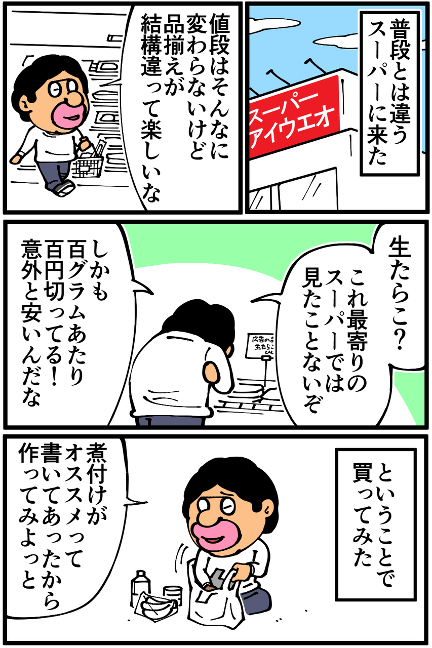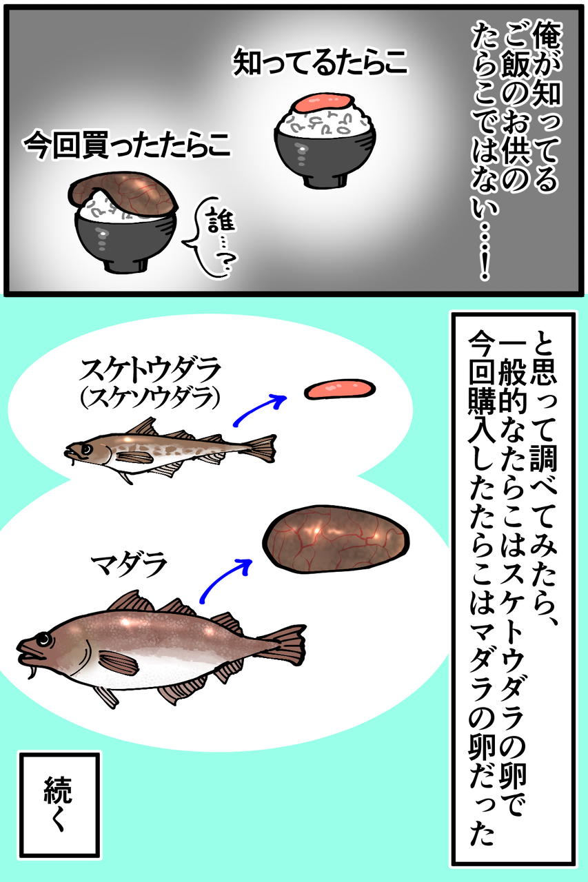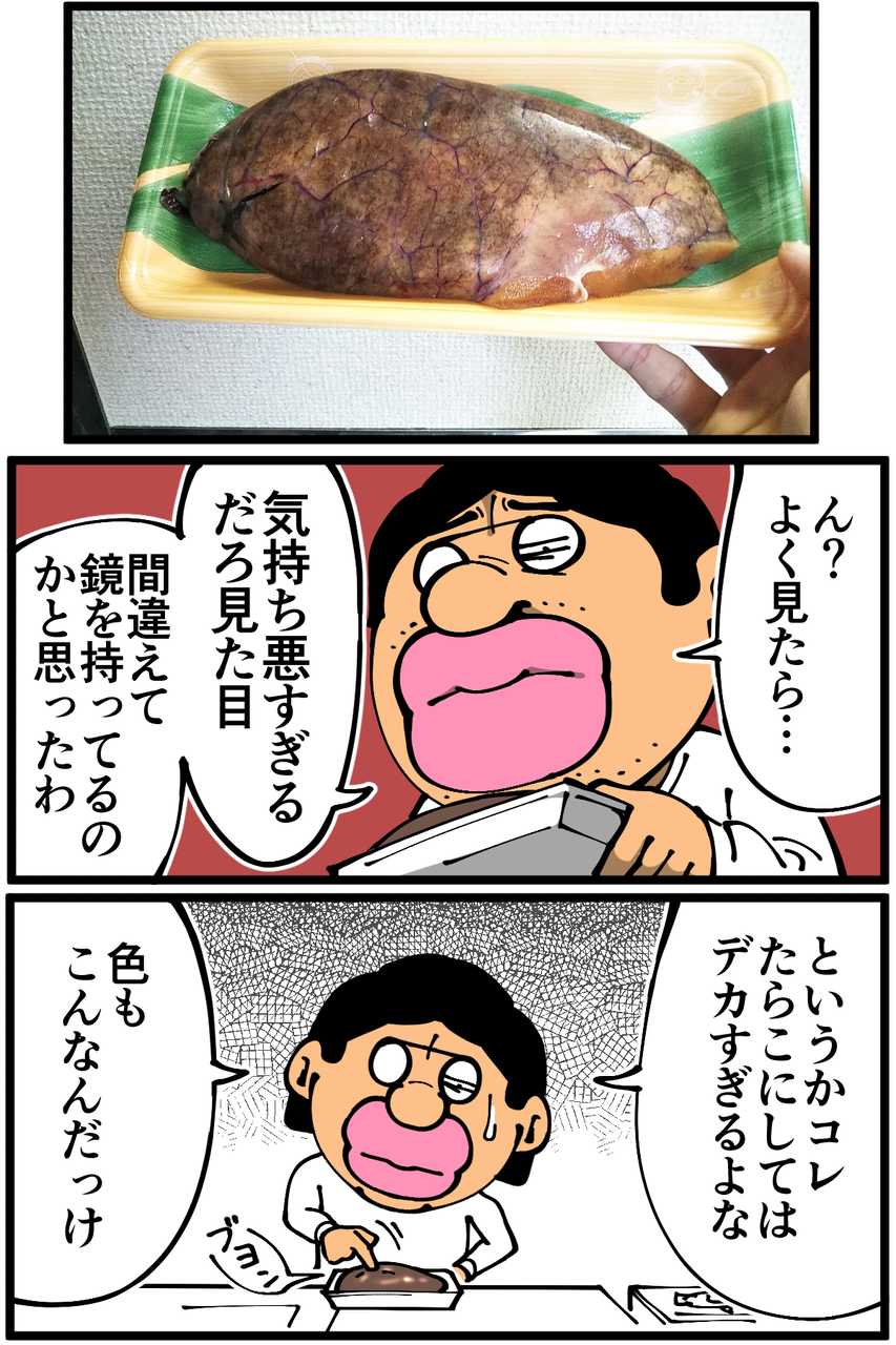 第977話「生たらこを買う」 2022年02月20日 安アパートでカツカツな生活を送る男の漫画ブログです。金が底を尽きてくたばるようなことがなければ毎日更新します。調理編に続きます。続き↓ タラを食べた時の話↓●Twitterやってます。●登録していただくと更新通知がLINEで届きます↓●こちらのページから過去記事一覧が見られます↓ 「絵日記」カテゴリの最新記事 < 前の記事次の記事 > コメント コメント一覧 (49) 1. こんなタラコ 2022年02月20日 22:16 見たことない… どんな料理になったか楽しみです(*⁰▿⁰*) 0 taikutsu_ken がしました 26. 退屈健 2022年02月23日 11:49 >>1 俺も初めて見ました!凄いインパクトですよね…!笑 0 taikutsu_ken がしました 2. 素ープLv.5 2022年02月20日 22:16 先生のチャレンジ精神に脱帽です、、 生たらこ見たこともないし 見ても多分手に取れないかも、、 0 taikutsu_ken がしました 27. 退屈健 2022年02月23日 11:56 >>2 俺も初めて見ました! 強烈なビジュアルで思わず買ってしまいました…!(というか安かった) 0 taikutsu_ken がしました 3. なめこ 2022年02月20日 22:23 炊飯器の存在を忘れず! 飯を炊くんですよ! 0 taikutsu_ken がしました 28. 退屈健 2022年02月23日 11:56 >>3 今回は大丈夫でした!笑 0 taikutsu_ken がしました 4. dd 2022年02月20日 22:28 スーパーで見かけますが買ったことないです! まさか先生が買うとは…😆 0 taikutsu_ken がしました 29. 退屈健 2022年02月23日 11:57 >>4 意外と安くて買っちゃいました!笑 0 taikutsu_ken がしました 5. 喫煙者の肺?! Σ(o゚Д゚ノ)ノ 2022年02月20日 22:36 フロンティアスピリッツに溢れた先生を見習って 新たなメニュー…いや、新たな食材に 挑んでみよう…と思ったものの、 見目怪しい物体には手が伸びん…💧 俺達の先生はさすがだゼ😆👍 0 taikutsu_ken がしました 30. 退屈健 2022年02月23日 11:57 >>5 ビジュアルが怪しすぎて買わずにはいられませんでした!笑 0 taikutsu_ken がしました 6. プイ 2022年02月20日 22:45 あっ こいりが食べたいなー 0 taikutsu_ken がしました 31. 退屈健 2022年02月23日 11:57 >>6 ご飯に合いそうですね~! 0 taikutsu_ken がしました 7. プンバ 2022年02月20日 22:48 これこれー!タラコの煮付けのやつ、最高ですっ。何なら煮付けしか知らない。幼い頃から大好きでした。粒々たっぷりの煮汁も御飯にかけておかわり万歳です。日本海側では冬になると鮮魚コーナーでよく見かけます。 先生、これを一人で食すのはめちゃ量が多いのでは…。魚卵だしプリン体が半端ない?!それはイクラか? 0 taikutsu_ken がしました 11. さく 2022年02月20日 23:13 >>7 私も煮付け好物です。 プリン体は細胞の数で量が決まっているようで、一口に入る細胞数が多いタラコの方がイクラよりやばいらしいですよ😱 0 taikutsu_ken がしました 32. 退屈健 2022年02月23日 11:59 >>7 粒々たっぷりの煮汁、ご飯が無限にいけちゃうやつですね! 大きすぎて4回くらいに分けて食べたんですが、痛風になりそうな気がします…!笑 0 taikutsu_ken がしました 8. アジ 2022年02月20日 22:51 大きいですね! こういう薄皮?は見た目&食感が苦手...でも明太子は好きなので、皮から身をこそいで食べてます🤣 0 taikutsu_ken がしました 33. 退屈健 2022年02月23日 11:59 >>8 皮からこそぐのもよさそうですね~!ほぐしてから煮るのも試してみたいです! 0 taikutsu_ken がしました 49. アジ 2022年02月23日 22:37 >>33 バラけてしまいそうですが、そういう調理法もあるんですかね! あと完全に勘違いして明太子って書いていたことに気付きました... 0 taikutsu_ken がしました 9. カルロス 2022年02月20日 22:58 生で食べちゃダメ! 0 taikutsu_ken がしました 34. 退屈健 2022年02月23日 12:00 >>9 さすがに生はいけませんでした!笑 0 taikutsu_ken がしました 10. にゃん太郎 2022年02月20日 23:13 これは、たいのこ。煮付け用 0 taikutsu_ken がしました 35. 退屈健 2022年02月23日 12:00 >>10 たいのこと言うんですね! 0 taikutsu_ken がしました 13. 以下、名無し 2022年02月20日 23:15 昔、祖母の家で白子の代わりに鍋に入ってたのを思い出しました。 0 taikutsu_ken がしました 36. 退屈健 2022年02月23日 12:00 >>13 鍋の具材としてもよさそうですね~! 0 taikutsu_ken がしました 14. なまえがなしこ 2022年02月20日 23:17 公式ブロガーならそこそこお金稼いでるでしょ? 0 taikutsu_ken がしました 37. 退屈健 2022年02月23日 12:01 >>14 もちろんです、と胸を張って言えるよう精進します!笑 0 taikutsu_ken がしました 15. 通りすがりの主婦 2022年02月20日 23:20 シラタキと一緒に炒め煮にすると美味しいですよ。 0 taikutsu_ken がしました 38. 退屈健 2022年02月23日 12:01 >>15 いいですね~!!シラタキも大好物なのでいつか作ってみます! 0 taikutsu_ken がしました 16. 通りすがり 2022年02月20日 23:38 真子ですね。 煮付けにすると、とても美味しいですね。 我が家では、そのまま煮ると爆ぜるので、戻した昆布で巻いて煮付けています。 でも、爆ぜたのをご飯にかけて食べるのも、またよろし。 0 taikutsu_ken がしました 39. 退屈健 2022年02月23日 12:02 >>16 なるほど、昆布で巻いて! 確かに!爆ぜたら爆ぜたでそれも美味しそうでいいですね!笑 0 