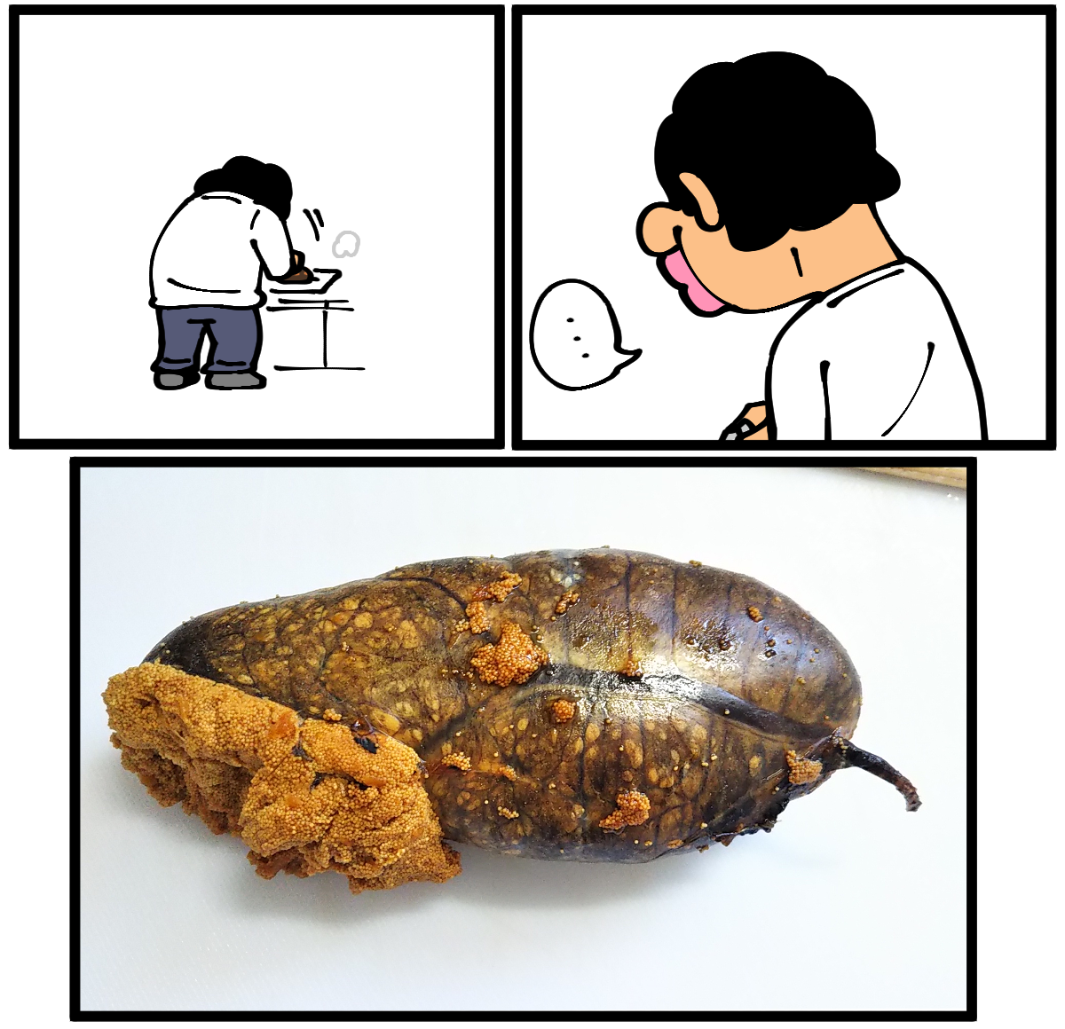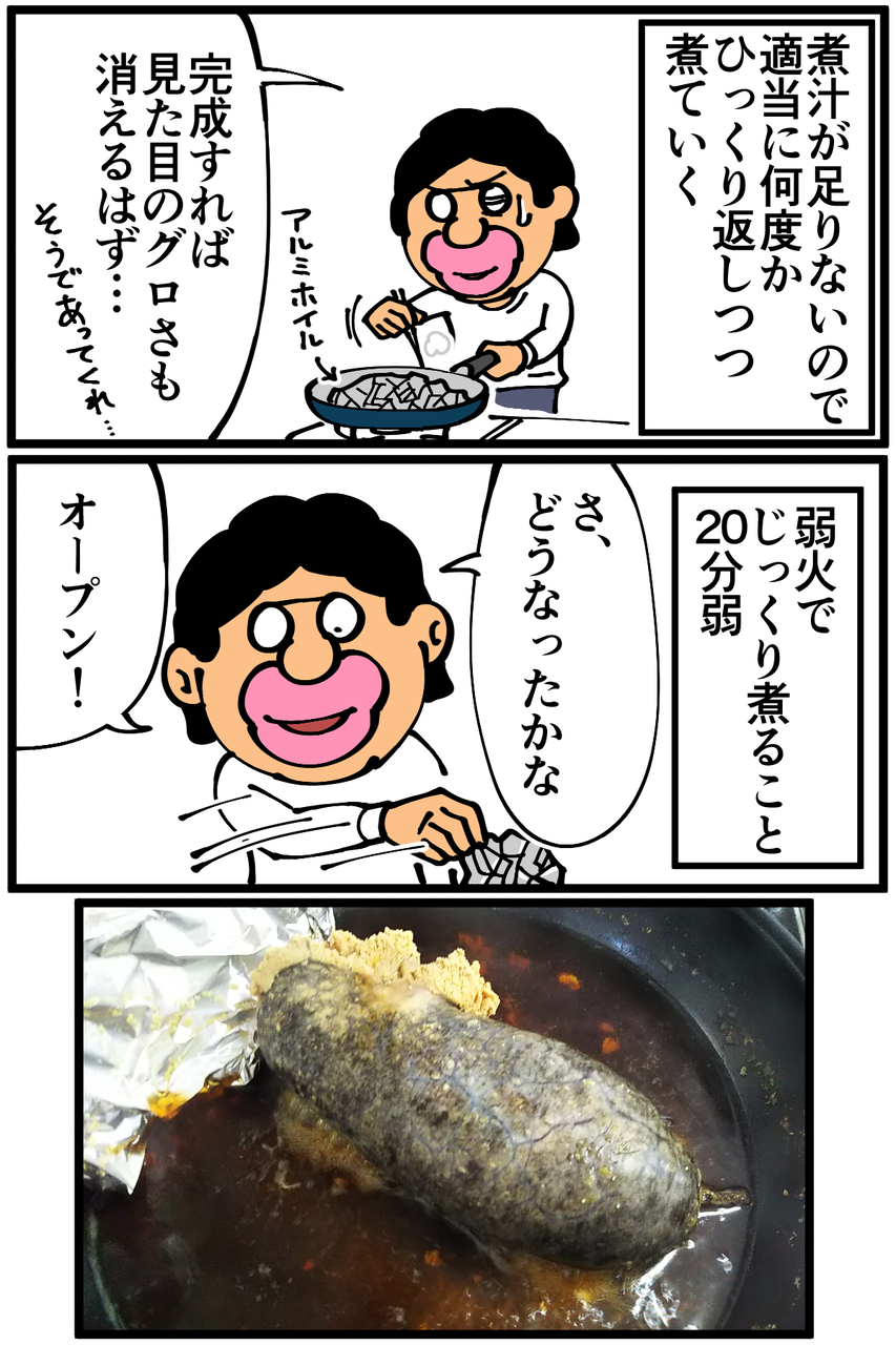 第978話「たらこの煮付けを作る・前編」 2022年02月21日 安アパートでカツカツな生活を送る男の漫画ブログです。金が底を尽きてくたばるようなことがなければ毎日更新します。前回の記事の続きです。※当記事には見た目が少々グロテスクな(たらこの)画像が含まれるので苦手な方はご注意下さい!蓋を取ったらグロさが増していた。次回に続きます。続き↓ 普通の食材を使ってもグロくなる↓●Twitterやってます。●登録していただくと更新通知がLINEで届きます↓●こちらのページから過去記事一覧が見られます↓ 「絵日記」カテゴリの最新記事 「料理」カテゴリの最新記事 < 前の記事次の記事 > コメント コメント一覧 (37) 1. we 2022年02月21日 21:38 ヤバい(ヤバい) 0 taikutsu_ken がしました 19. 退屈健 2022年02月23日 12:09 >>1 蓋取った瞬間、失敗なのかと焦りました…笑 0 taikutsu_ken がしました 2. ぐんぐん 2022年02月21日 21:42 最後のコマに声を立てて笑ってしまいました! ウチの地元では炒めたごぼうに皮を取ったタラコを入れて、お醤油、お酒で炒り煮にする「子炒り」というお正月料理にします。 1月から2月が旬なので毎年楽しみなお料理です! 今度はぜひごぼうと合わせて食べてみて下さいね。 0 taikutsu_ken がしました 20. 退屈健 2022年02月23日 12:09 >>2 ありがとうございます! ごぼうと合わせるの美味しそうですね~!旬のうちに食べたいところです! 0 taikutsu_ken がしました 3. mohishi 2022年02月21日 21:48 わかる〜!笑 ほぐすとグロくなくなるけど、その皮がね〜 0 taikutsu_ken がしました 21. 退屈健 2022年02月23日 12:10 >>3 皮のグロさ、なかなかですね!笑 0 taikutsu_ken がしました 4. 2022年02月21日 21:52 先生の料理が久しぶりに帰ってきた! 0 taikutsu_ken がしました 22. 退屈健 2022年02月23日 12:10 >>4 また化け物が誕生してしまいました!笑 0 taikutsu_ken がしました 5. 以下、名無し 2022年02月21日 21:53 「グロテスクなたらこ」を何故か「グロテスクなたらこ唇」って脳内変換してしまったことを謝罪します。 0 taikutsu_ken がしました 23. 退屈健 2022年02月23日 12:10 >>5 グロテスクなたらこ唇は俺の顔面ですね!笑 0 taikutsu_ken がしました 6. mou 2022年02月21日 21:55 新たな生命を生み出している感があります 退屈先生から退屈教授にランクアップですね 0 taikutsu_ken がしました 24. 退屈健 2022年02月23日 12:12 >>6 危険な生命体を開発する悪質な教授ですね!笑 0 taikutsu_ken がしました 7. (´・ω・`) 2022年02月21日 22:02 古代の原始生物を復元したみたいな見た目ですね… 0 taikutsu_ken がしました 25. 退屈健 2022年02月23日 12:12 >>7 確かに、シーラカンスとかと同類の…!笑 0 taikutsu_ken がしました 8. カルロス 2022年02月21日 22:05 エイリアンの卵・・・ 0 taikutsu_ken がしました 26. 退屈健 2022年02月23日 12:12 >>8 中からブシャッと生まれそうですね…!笑 0 taikutsu_ken がしました 9. マッドサイエンティスト👓✴️ 2022年02月21日 22:09 ぉ…お料理してるんですよね? 決して悲しきモンスターを産み出す 科学実験ではないですよね…? 0 taikutsu_ken がしました 27. 退屈健 2022年02月23日 12:13 >>9 完全に人類駆逐のためのモンスターを生み出す実験風景でした…!笑 0 taikutsu_ken がしました 10. なめこ 2022年02月21日 22:11 これは……。 やばいですわね……。 0 taikutsu_ken がしました 28. 退屈健 2022年02月23日 12:13 >>10 ヤバかったです…!笑 0 taikutsu_ken がしました 11. 最後www 2022年02月21日 22:14 外で読むんじゃなかった、退屈先生の漫画はたまにこういうことするから好きですwwwww 0 taikutsu_ken がしました 29. 退屈健 2022年02月23日 12:13 >>11 ありがとうございます!!笑 0 taikutsu_ken がしました 12. かきのたね 2022年02月21日 22:19 これ!よくおばあちゃんが作ってくれました! でもこんなグロかったかなー? おいしいといいですね!! 0 taikutsu_ken がしました 30. 退屈健 2022年02月23日 12:14 >>12 調理の工程をどこかで間違えたのかこんなにグロい見た目になってしまいました!笑 0 taikutsu_ken がしました 13. なお 2022年02月21日 22:23 笑った!ありがとうございます。 0 taikutsu_ken がしました 31. 退屈健 2022年02月23日 12:14 >>13 とんでもないです、こちらこそありがとうございます! 0 taikutsu_ken がしました 14. ななな 2022年02月21日 22:40 脚と頭をもがれたカマドウマかと思った… 0 taikutsu_ken がしました 32. 退屈健 2022年02月23日 12:14 >>14 それもそれでグロい!笑 0 taikutsu_ken がしました 15. とくめい 2022年02月21日 22:57 先生のご飯、いつもお世辞抜きに美味しそうなのに、これだけは…以下略 0 taikutsu_ken がしました 33. 退屈健 2022年02月23日 12:15 >>15 自炊史上最強のグロさでした…!笑 0 taikutsu_ken がしました 16. ゆきちお 2022年02月22日 03:23 先日アマプラで見たアニメーション映画でこんな食べ物出てきたなぁ。 0 taikutsu_ken がしました 34. 退屈健 2022年02月23日 12:15 >>16 えええ!それはグロい!笑 0 taikutsu_ken がしました 17. ソノナワゲートウェイ 2022年02月22日 17:35 流石に食いもんじゃねえ 0 taikutsu_ken がしました 35. 退屈健 2022年02月23日 12:15 >>17 完全に食べられる見た目ではないですね!笑 0 taikutsu_ken がしました 