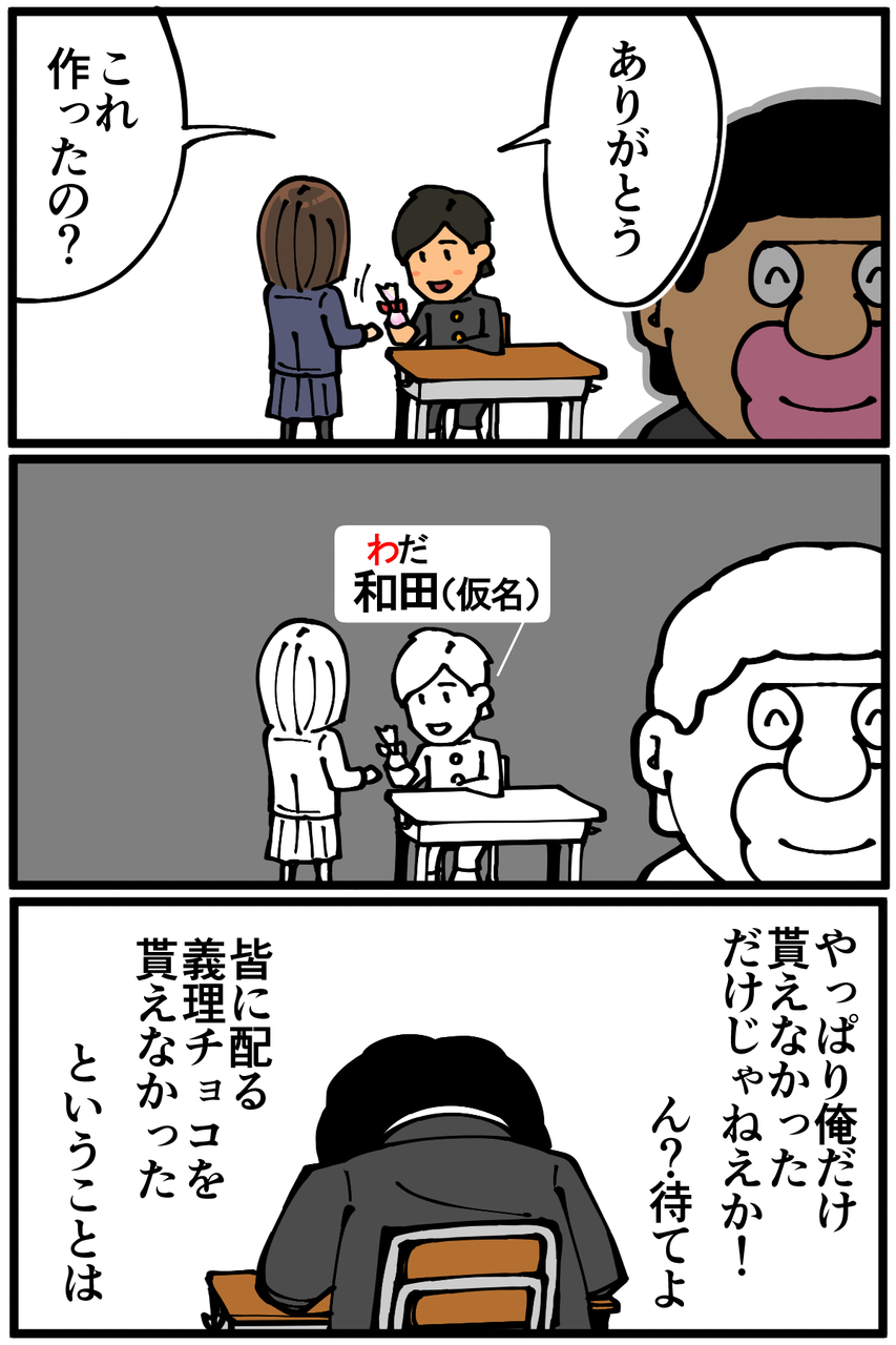 第980話「バレンタインデーの思い出」 2022年02月24日 ブログネタ:【公式】バレンタインデーのあれこれ に参加中! 安アパートでカツカツな生活を送る男の漫画ブログです。金が底を尽きてくたばるようなことがなければ毎日更新します。補足するまでもないけど勘違いでした。次の記事↓ 最終的に自分で自分に作るようになった↓ ●Twitterやってます。●登録していただくと更新通知がLINEで届きます↓●こちらのページから過去記事一覧が見られます↓ 「絵日記」カテゴリの最新記事 < 前の記事次の記事 > コメント コメント一覧 (48) 1. あらなみ 2022年02月24日 22:20 …可哀想だから、俺が貰ったの一個上げますよ… あ…俺も無かった… 0 taikutsu_ken がしました 26. 退屈健 2022年03月03日 20:46 >>1 来年こそお互い…!笑 0 taikutsu_ken がしました 2. クッキー 2022年02月24日 22:22 みんなにあげるのに、ひとりだけ省くのは意地悪だよ。幻滅する。……そのためにほかの全員に配ったクチだけどさあ! 0 taikutsu_ken がしました 27. 退屈健 2022年03月03日 20:48 >>2 その場にいる全員分を用意して渡すの、なかなか大変そうですね~😭 0 taikutsu_ken がしました 3. 稲荷 2022年02月24日 22:25 こんなん言ってるけど写真だとわりとイケメンだったから貰えてそうな感じする 0 taikutsu_ken がしました 28. 退屈健 2022年03月03日 20:49 >>3 とんでもないです、バレンタインに無縁な人生(と顔面)を送ってきました…!笑 0 taikutsu_ken がしました 4. なめこ 2022年02月24日 22:29 ( ;_;)_🍫🍫🍫🍫🍫🍫🍫🍫🍫🍫 私があげるよぉ。 0 taikutsu_ken がしました 29. 退屈健 2022年03月03日 20:49 >>4 こんなに大量に!ありがとうございます!笑 0 taikutsu_ken がしました 5. 🏳️🌈🗿🏳️🌈 2022年02月24日 22:34 せめて自分らに見えないとこで配ってほしいですよね 0 taikutsu_ken がしました 30. 退屈健 2022年03月03日 20:49 >>5 むしろ俺が気にしないでいるべきだったかもですね!笑 0 taikutsu_ken がしました 6. 漆黒の翼を背負いし救世主(メシア) 2022年02月24日 22:38 「…クッ! 暗黒界より召喚せし“ 侵食する闇 ”を この左手に宿した俺に近づくな…っ!!」 と、あえて孤高を保ったのですね。 0 taikutsu_ken がしました 31. 退屈健 2022年03月03日 20:51 >>6 フン、孤高を保つのもラクじゃないぜ(泣きながら) 0 taikutsu_ken がしました 7. うし 2022年02月24日 22:43 ほ、本当にもらえなかったの…? 🍫੧(❛□❛✿)ドーゾッ 0 taikutsu_ken がしました 32. 退屈健 2022年03月03日 20:51 >>7 ありがとうございます!!笑 0 taikutsu_ken がしました 8. 通りすがりの名無し 2022年02月24日 22:54 地味に心を抉りますね…。チョコを配る人て配らない人がいるんなら、せめてバレないように配って欲しい気はしますけど…。 私としては、その女の子の本命は先生で、照れ臭くて渡せなかったに一票。 0 taikutsu_ken がしました 17. 通りすがりの名無し 2022年02月25日 06:28 >>8 誤:チョコを配る人て 正:チョコを配る人と 0 taikutsu_ken がしました 33. 退屈健 2022年03月03日 20:51 >>8 むしろ俺が気にしないでいるべきだったかもしれないですね!笑 0 taikutsu_ken がしました 9. みゆみゆ 2022年02月24日 22:57 みんなに渡すならみんなに渡そうよ〜切ないじゃん😭 私はチロルチョコ箱買いして配ってました😂 私から先生へ🍫受け取ってください🌸 0 taikutsu_ken がしました 34. 退屈健 2022年03月03日 20:51 >>9 チロルチョコいいですね~! ありがとうございます!🍫 0 taikutsu_ken がしました 10. スズメ 2022年02月24日 23:02 恥ずかしくて今日まで渡せてないんですね 0 taikutsu_ken がしました 35. 退屈健 2022年03月03日 20:52 >>10 そろそろ届くかな?(狂気) 0 taikutsu_ken がしました 11. シュフ 2022年02月24日 23:06 本命である先生へのチョコは靴箱に入れておいたはずが、一段 間違って入れちゃってたから、先生は受け取ってないんですね……… 0 taikutsu_ken がしました 36. 退屈健 2022年03月03日 20:52 >>11 なるほど!念のため全部の靴箱を開けとけばよかった!(錯乱) 0 taikutsu_ken がしました 12. とくめい 2022年02月24日 23:49 やめろ…やめろ… 私も20超えてから本命も義理ももらうことは増えましたけど、 中高時代もらったことはただの一度もなかったですね… 0 taikutsu_ken がしました 37. 退屈健 2022年03月03日 20:53 >>12 学生時代のバレンタインイベント、なかなかハードルが高いですね…!笑 0 taikutsu_ken がしました 13. 鯛 2022年02月24日 23:54 でも先生イケメンだし女子の友人もいるじゃないすか... 0 taikutsu_ken がしました 38. 退屈健 2022年03月03日 20:54 >>13 イケメンとはかけ離れた顔面です…!笑 0 taikutsu_ken がしました 14. さよ 2022年02月25日 00:27 昔々好きな人に恥ずかしくてチョコ渡せなくて、全然好きじゃない人に渡した記憶が蘇りました その子も先生が本命なのに恥ずかしくて渡せなかったのかもよ、、 アオハル時代が懐かしき(遠い目) 0 taikutsu_ken がしました 39. 退屈健 2022年03月03日 20:54 >>14 おおお、そうだったんですか!全然好きじゃない人にとっては超ラッキーイベントとなってそうですね!笑 0 taikutsu_ken がしました 15. しっぽ 2022年02月25日 00:40 全米が泣いた、