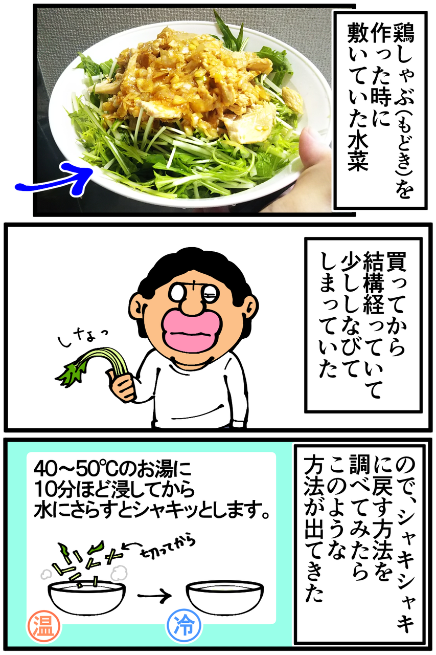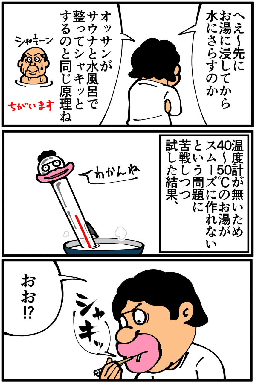 第1006話「水菜をシャキシャキに戻す方法を試す」 2022年03月26日 安アパートでカツカツな生活を送る男の漫画ブログです。金が底を尽きてくたばるようなことがなければ毎日更新します。先日の記事 のおまけです。全然関係無いけどSwitchオンラインでコツコツ進めていたMOTHER2、昨日クリアしました。名作でした!次の記事↓ 葉野菜は割とよく食べる↓●Twitterやってます。●登録していただくと更新通知がLINEで届きます↓●こちらのページから過去記事一覧が見られます↓ 「絵日記」カテゴリの最新記事 < 前の記事次の記事 > コメント コメント一覧 (26) 1. 通りすがりおぢさん 2022年03月26日 23:23 MOTHER2クリアおめでとうございます👏👏 MOTHER2のプレイ日記のようなマンガももっと見たいです笑 先生の料理スキルがどんどんあがっていくーーー!! 0 taikutsu_ken がしました 14. 退屈健 2022年04月02日 01:27 >>1 ありがとうございます、MOTHER2めちゃくちゃ面白かったです!! プレイ日記も色々描きたいです! 0 taikutsu_ken がしました 2. なめこ 2022年03月26日 23:24 棒ってアンタ……(笑) 0 taikutsu_ken がしました 15. 退屈健 2022年04月02日 01:28 >>2 例えが酷かった…!笑 0 taikutsu_ken がしました 3. かな 2022年03月26日 23:39 温度はあまり気にせず適当な給湯で サラッと流して水でしめるだけで 効果ありますよ☆ 0 taikutsu_ken がしました 16. 退屈健 2022年04月02日 01:30 >>3 おお、そうなんですね! それならだいぶラクでいいですね~! 0 taikutsu_ken がしました 4. 名無し 2022年03月26日 23:50 体温計でも水温は測れますよ! もしそれもなければ、氷(0℃)と熱湯(100℃)を同じ重さずつ混ぜれば50℃のお湯ができます 0 taikutsu_ken がしました 17. 退屈健 2022年04月02日 01:30 >>4 なるほど!!体温計も持っていないのでその方法で作ってみます、ありがとうございます! 0 taikutsu_ken がしました 5. もしかすると、 2022年03月26日 23:57 先生なら、お風呂タイムに食べていそうですね! 0 taikutsu_ken がしました 18. 退屈健 2022年04月02日 01:31 >>5 お風呂タイムですか!?笑 0 taikutsu_ken がしました 6. 次は是非、 2022年03月27日 00:21 Switchのダウンロードソフト「すみれの空」を プレイしてみてください。 まるで絵本のような綺麗な色彩で、 ゲームは闇ルートと光ルートがあり 主人公の少女の行動によりエンディングが変化します。面白いですよ。 0 taikutsu_ken がしました 19. 退屈健 2022年04月02日 01:32 >>6 おお、そんなゲームが!ありがとうございます、調べてみます~! 0 taikutsu_ken がしました 7. 良い子は真似しちゃダメだぞ☆ 2022年03月27日 01:30 昔々あるところに、 物事を深く考えない阿呆がおったんじゃ。 ある日、中途半端に残っていた水菜を 「こりゃ勿体無い」とばかりに お好み焼きの生地に入れて焼いたんじゃと。 《結果↓》 “あむっ” と口に入れた瞬間、 カリッカリに焼けた [ほぼ針] な水菜が 情け容赦なく頬に… (グフッ…!〉_:(´ཀ`」 ∠):_ 【教訓】 野菜は時に人に牙を剥く。 0 taikutsu_ken がしました 20. 退屈健 2022年04月02日 01:33 >>7 おおお、それは痛い!!水菜は時に凶器になりますね!笑 0 taikutsu_ken がしました 8. さよ 2022年03月27日 02:12 本日たまたまシナシナの白菜に、ネットで調べた50度洗浄(先生と同じ方法)を試したところだったのでタイムリーな記事にビックリ! ほんとシャキッとなりますねーー✨これにもビックリ! 0 taikutsu_ken がしました 21. 退屈健 2022年04月02日 01:33 >>8 おお、同じく試されてましたか! 本当にシャキシャキになって感動しますよね~! 0 taikutsu_ken がしました 9. ゆきちお 2022年03月27日 03:11 サウナのオッさんの例えは好き😊 0 taikutsu_ken がしました 22. 退屈健 2022年04月02日 01:42 >>9 ありがとうございます!笑 0 taikutsu_ken がしました 10. TEN 2022年03月27日 09:24 マザー2のラスボスこわいですよね。 それはそうとシャキシャキで口内に刺さるってどんなものだったんでしょうか😅 0 taikutsu_ken がしました 23. 退屈健 2022年04月02日 01:42 >>10 俺の口内が弱すぎる説もあります!笑 ラスボス、狂気すぎてめっちゃ怖かったです! 0 taikutsu_ken がしました 11. みずじめん 2022年03月27日 10:48 MOTHER2は名作ですよねぇ おうじゃのつるぎのツイートでトラウマが蘇りましたw …水菜による口内炎が発症しないことを祈ります 0 taikutsu_ken がしました 24. 退屈健 2022年04月02日 01:43 >>11 おうじゃのつるぎは茨の道すぎますね~😭 口内炎、なんとか大丈夫でした! 0 taikutsu_ken がしました 12. 米粉餅 2022年03月27日 18:07 いいみずなで いいです。 だいじょうぶか。 だいじょうぶならいい。 0 taikutsu_ken がしました 25. 退屈健 2022年04月02日 01:44 >>12 なおった。なおった。 よかったー。 0 taikutsu_ken がしました 13. ぱいぱい 2022年03月27日 21:41 僕はサウナ行くとシナシナになります。ほうれん草のお浸しのように。 0 taikutsu_ken がしました 26. 退屈健 2022年04月02日 01:44 >>13 俺も同じくシナシナタイプです!笑 0 taikutsu_ken がしました コメントフォーム 名前 コメント 記事の評価 リセット リセット 顔 星 情報を記憶 コメントを投稿する