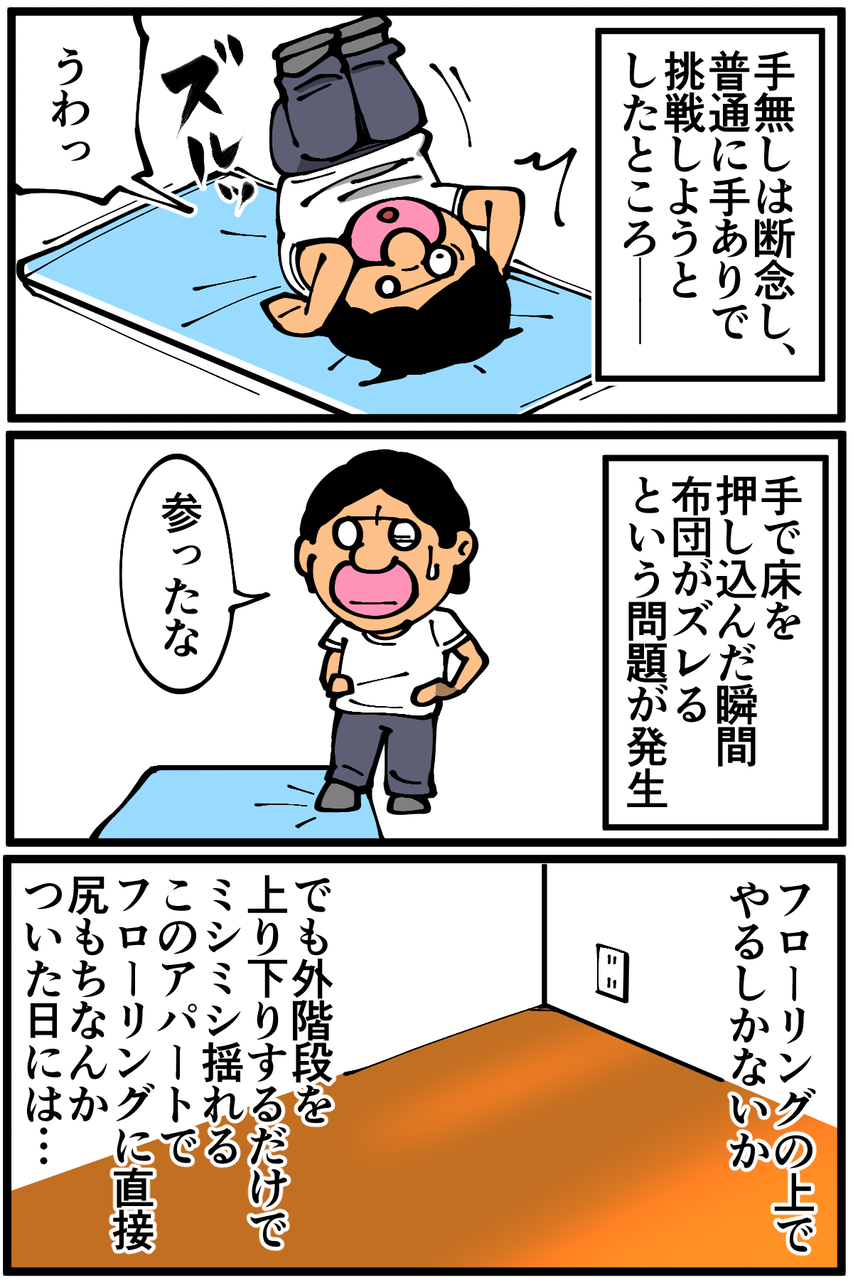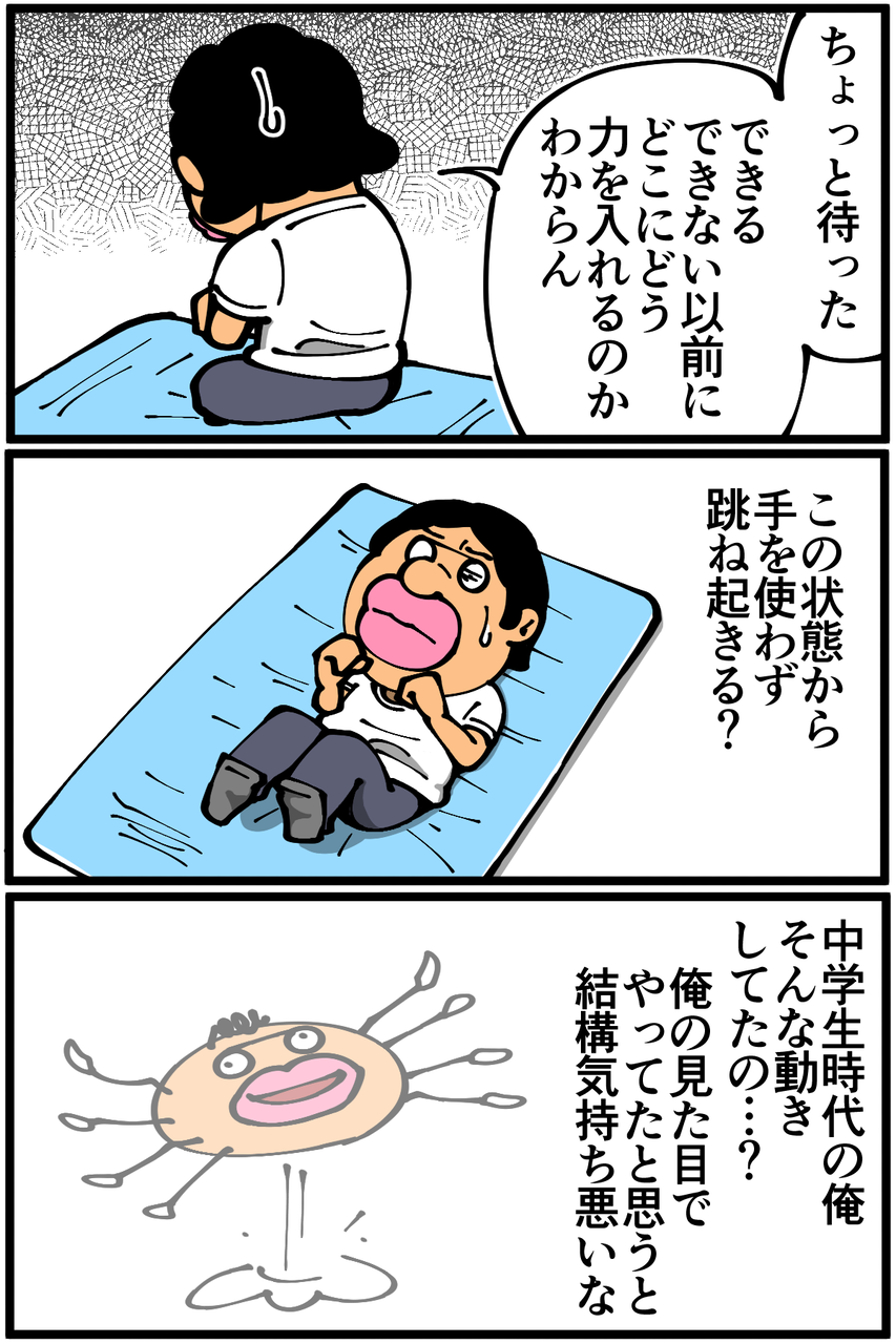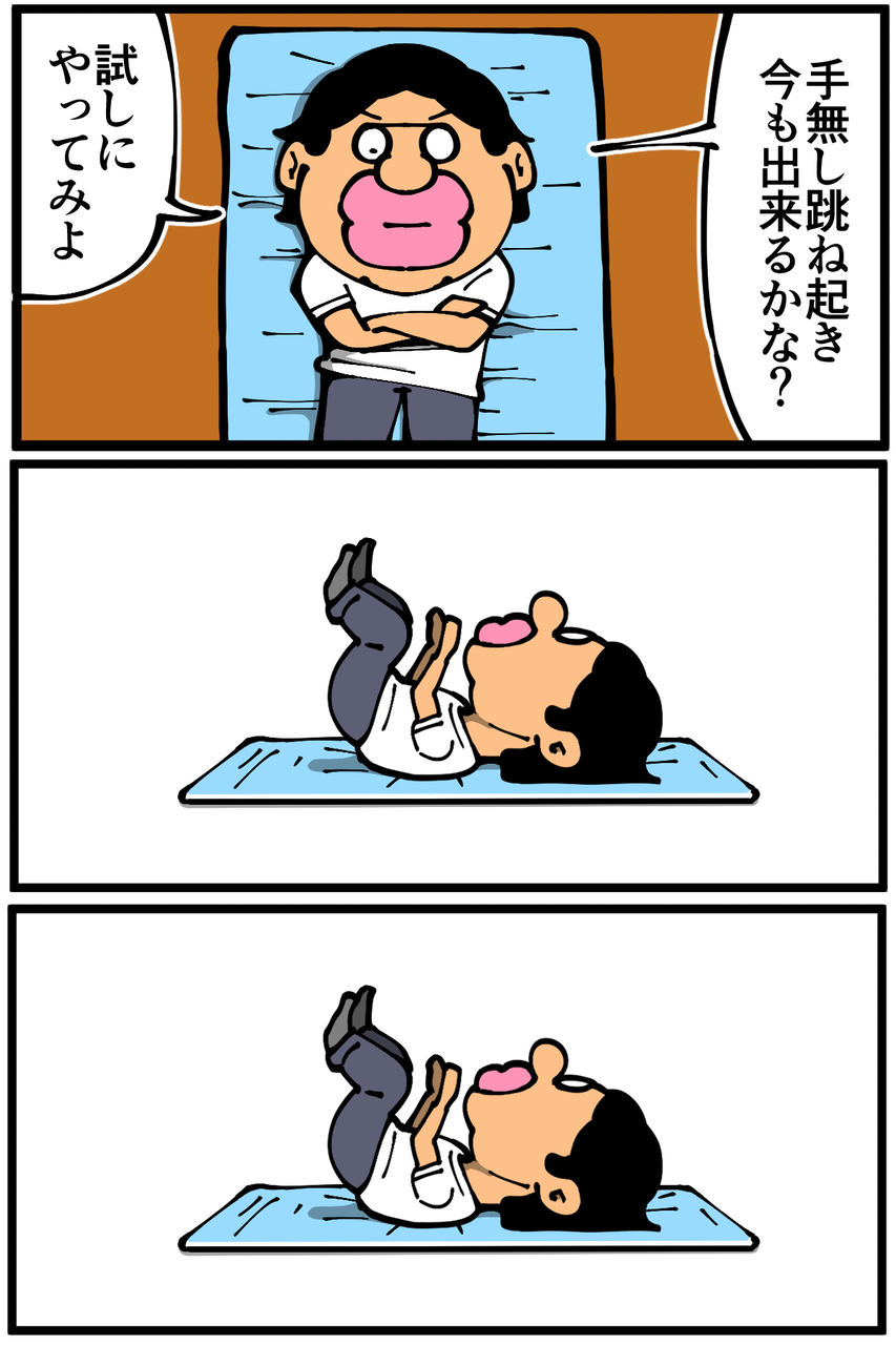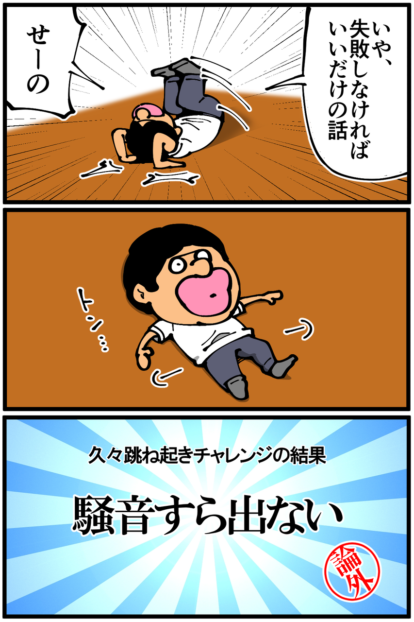 第1028話「運動不足が跳ね起きをやると・後編」 2022年04月22日 安アパートでカツカツな生活を送る男の漫画ブログです。金が底を尽きてくたばるようなことがなければ毎日更新します。前回の記事の続きです。身体1ミリも浮かなかったので通常の歩行くらいの振動で済みました。よかったよかった(よくない)。次の記事↓ 前のアパートでの壁ドン体験↓●Twitterやってます。●登録していただくと更新通知がLINEで届きます↓●こちらのページから過去記事一覧が見られます↓●LINEスタンプ販売中です。 「絵日記」カテゴリの最新記事 < 前の記事次の記事 > コメント コメント一覧 (23) 1. ゆー君 2022年04月22日 20:46 跳ね起き!いつか挑戦します 0 taikutsu_ken がしました 13. 退屈健 2022年04月23日 12:40 >>1 是非是非!ただ怪我には十分お気を付けください! 0 taikutsu_ken がしました 2. みゆみゆ 2022年04月22日 21:03 どこも痛めなくて良かった😂(身体もフローリングも) 私も出来るかやってみよーかな! 0 taikutsu_ken がしました 14. 退屈健 2022年04月23日 12:40 >>2 ご心配頂きありがとうございます!笑 是非お試しくださいー!ただ怪我には十分お気を付けください! 0 taikutsu_ken がしました 3. うみ 2022年04月22日 21:31 跳ね起きってどういうのかがわからず調べてみました。 ちょっとだけやってみようとしましたが、たぶん出来そうにない…。 0 taikutsu_ken がしました 15. 退屈健 2022年04月23日 12:41 >>3 やってみると意外と難しさを感じますよね…! 0 taikutsu_ken がしました 4. 焼牡蛎 2022年04月22日 22:21 御無事で良かったです… 0 taikutsu_ken がしました 16. 退屈健 2022年04月23日 12:41 >>4 ありがとうございます、惜しさの欠片も無かったが故に無事でした!笑 0 taikutsu_ken がしました 5. なめこ 2022年04月22日 22:31 アンタ中学時代カニだったの⁉️(笑) フラグはなんと言いますか。 抜けた、かな^^; 0 taikutsu_ken がしました 8. なめこ汁美味しい♪ 2022年04月22日 23:12 >>5 先生の描くクリーチャーは 何とも形容しがたい魅力と 中毒性がありますよね フフフ( *´艸`) 0 taikutsu_ken がしました 9. 2022年04月22日 23:16 >>8 自分で自分に返信してもIPアドレスで同一人物だとすぐにわかるんですよ…。 0 taikutsu_ken がしました 23. 8です 2022年04月23日 23:21 >>9さん 私は5さんではないですよ(^^) 0 taikutsu_ken がしました 17. 退屈健 2022年04月23日 12:42 >>5 中学時代、カニかダニか何かだった可能性はありますね!笑 0 taikutsu_ken がしました 6. 2022年04月22日 22:48 きのこのおばさんはどうしていつも偉そうなコメントなの? 0 taikutsu_ken がしました 18. 退屈健 2022年04月23日 12:43 >>6 いやいやそんな!元はと言えば俺の珍行動とか奇行が多すぎるのが一番の問題です!笑 0 taikutsu_ken がしました 7. 名無し 2022年04月22日 23:01 手首やらかして…☠とならなくて良かったです 0 taikutsu_ken がしました 19. 退屈健 2022年04月23日 12:44 >>7 確かに、変に捻ったりする可能性ありましたね…! ご心配頂きありがとうございます! 0 taikutsu_ken がしました 10. 通りすがりの名無し 2022年04月22日 23:23 夜、再度布団で跳ね起きを試してみましたが、お尻が上がりませんでした…。 それにしても、手を使わずに跳ね起きができたり、逆立ち(壁倒立)ができたり、排水溝に落下しかけた家の鍵に正確なキックを繰り出して救い出したりと、先生の運動能力って割と高い気がするのですが…。 0 taikutsu_ken がしました 20. 退屈健 2022年04月23日 12:45 >>10 いやいやとんでもないです!!自他共に認める運動音痴なもので…!笑 壁倒立も数秒すら壁から足が離せなかったりするので実際はできているとも言えないと思います!笑 0 taikutsu_ken がしました 11. ゆきちお 2022年04月23日 04:50 ドン‼️となるかと予想してました🤫 私は二重跳びと逆上がりが30代で出来なくなってました。40代、得意だった竹馬はかろうじて数歩。 50代になった今は恐怖で何もチャレンジ出来ません。 0 taikutsu_ken がしました 21. 退屈健 2022年04月23日 12:46 >>11 二重跳びとか逆上がりとか、小学生時代にやっていた動きは確かに今やってみたいですね…!俺ももはや何もできなくなっている気がします!笑 0 taikutsu_ken がしました 12. 以下、名無し 2022年04月23日 09:42 2コマ目3コマ目が土下座している人をひっくり返しているようにしか・・・w 0 taikutsu_ken がしました 22. 退屈健 2022年04月23日 12:47 >>12 妙にしっくりくる体勢だと思ったら土下座だったからなんですね!笑 0 taikutsu_ken がしました コメントフォーム 名前 コメント 記事の評価 リセット リセット 顔 星 情報を記憶 コメントを投稿する
