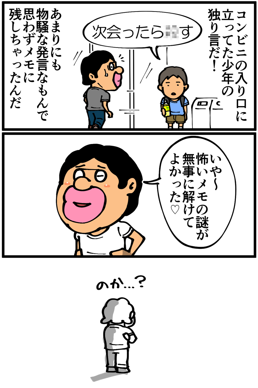 第1038話「スマホに残った物騒なメモ」 2022年05月03日 安アパートでカツカツな生活を送る男の漫画ブログです。金が底を尽きてくたばるようなことがなければ毎日更新します。独り言にしてはハッキリと声を発していたし俺に向けて言っていたのかも。そうだとしたらむしろ身の危険を感じて怖い。でも前のアパートに住んでいた時に残したメモ(=1年以上前)なのでなんとか逃げきれたようです。次の記事↓ 家にいる時はメモ帳に書いてます↓●Twitterやってます。●登録していただくと更新通知がLINEで届きます↓●こちらのページから過去記事一覧が見られます↓●LINEスタンプ販売中です。 「絵日記」カテゴリの最新記事 < 前の記事次の記事 > コメント コメント一覧 (20) 1. なめこ 2022年05月03日 22:38 怖っ!!! 0 taikutsu_ken がしました 10. 退屈健 2022年05月04日 18:05 >>1 恐怖ですね!笑 0 taikutsu_ken がしました 2. ZZ 2022年05月03日 22:53 少年に一体何が… 0 taikutsu_ken がしました 11. 退屈健 2022年05月04日 18:06 >>2 何か許せないことがあったのか、もしくは俺に対して猛烈な殺意が…!笑 0 taikutsu_ken がしました 3. ペドロ 2022年05月03日 23:31 昨今の少年世代にも、複雑な人間関係があるのかもしれない。 0 taikutsu_ken がしました 12. 退屈健 2022年05月04日 18:07 >>3 対人トラブルはどの世代にもつきものなんですね…!笑 0 taikutsu_ken がしました 4. アブドゥル 2022年05月03日 23:45 このラクガキを見て うしろをふり向いた時 おまえらは 0 taikutsu_ken がしました 13. 退屈健 2022年05月04日 18:08 >>4 怖い!と思ったらジョジョでしたか!(ググった) 0 taikutsu_ken がしました 5. 小手毬 2022年05月03日 23:46 子供だと思って侮るなかれ! 逃げ切って~~☆ (≧▽≦) 0 taikutsu_ken がしました 14. 退屈健 2022年05月04日 18:08 >>5 なんとか逃げ切ろうと思います!笑 0 taikutsu_ken がしました 6. ゆきちお 2022年05月04日 03:40 センセーに向けて放った言葉じゃ無いよね! 0 taikutsu_ken がしました 15. 退屈健 2022年05月04日 18:08 >>6 と信じたいです!笑 0 taikutsu_ken がしました 7. 通りすがりの名無し 2022年05月04日 08:31 少年の心に闇が翳ってますね…… 先生に向けた言葉ではないと私は信じてますが、それにしてもなんと物騒な。 0 taikutsu_ken がしました 16. 退屈健 2022年05月04日 18:08 >>7 俺に対しての言葉ではないと信じたいところです…!笑 0 taikutsu_ken がしました 8. 以下、名無し 2022年05月04日 10:03 そのメモの内容を何に使おうとしたんでしょうかね、ブログ用ですかね? メモ癖とは営業サラリーマンみたいですね 0 taikutsu_ken がしました 17. 退屈健 2022年05月04日 18:09 >>8 ブログ用であったりただの生活用であったり、ごちゃ混ぜでメチャクチャなメモです!笑 0 taikutsu_ken がしました 9. みゆみゆ 2022年05月04日 10:18 メモ欄と少年の心の治安が…良くないですね😨 0 taikutsu_ken がしました 18. 退屈健 2022年05月04日 18:09 >>9 色々と荒んでますね…!笑 0 taikutsu_ken がしました 19. ゆー君 2022年05月04日 20:47 あなたの後ろの暗闇に… 0 taikutsu_ken がしました 20. 退屈健 2022年05月04日 20:55 >>19 こ、怖い!!笑 0 taikutsu_ken がしました コメントフォーム 名前 コメント 記事の評価 リセット リセット 顔 星 情報を記憶 コメントを投稿する