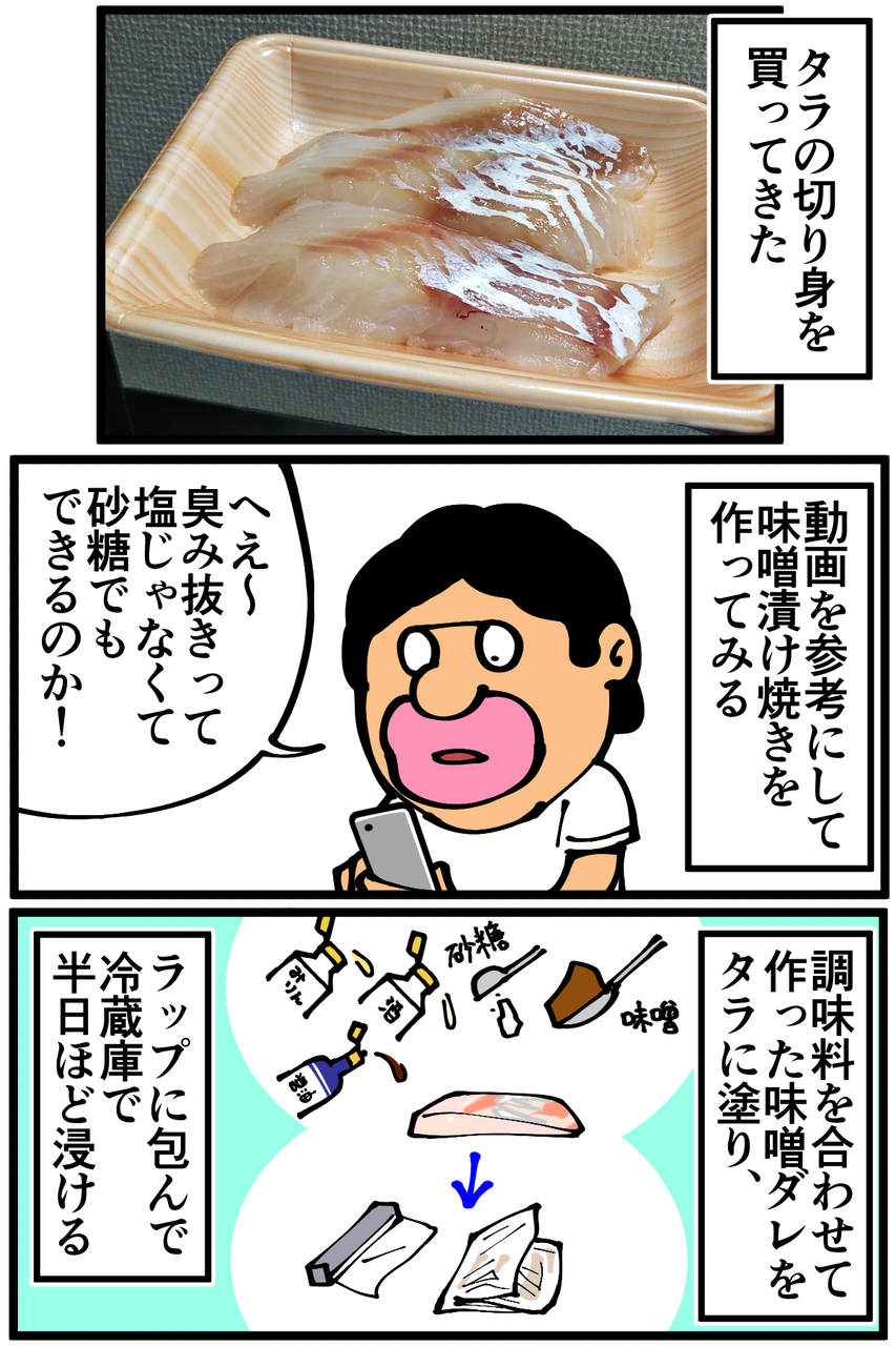 というかそもそも「調味料をしっかり拭き取る」「多めの油をクッションにする」というのはタラの皮をしっかり焼いてパリパリにしたい場合の話だったので、最初から皮が取ってある切り身を買ってきた俺は別にやる必要無かったのかもしれません。