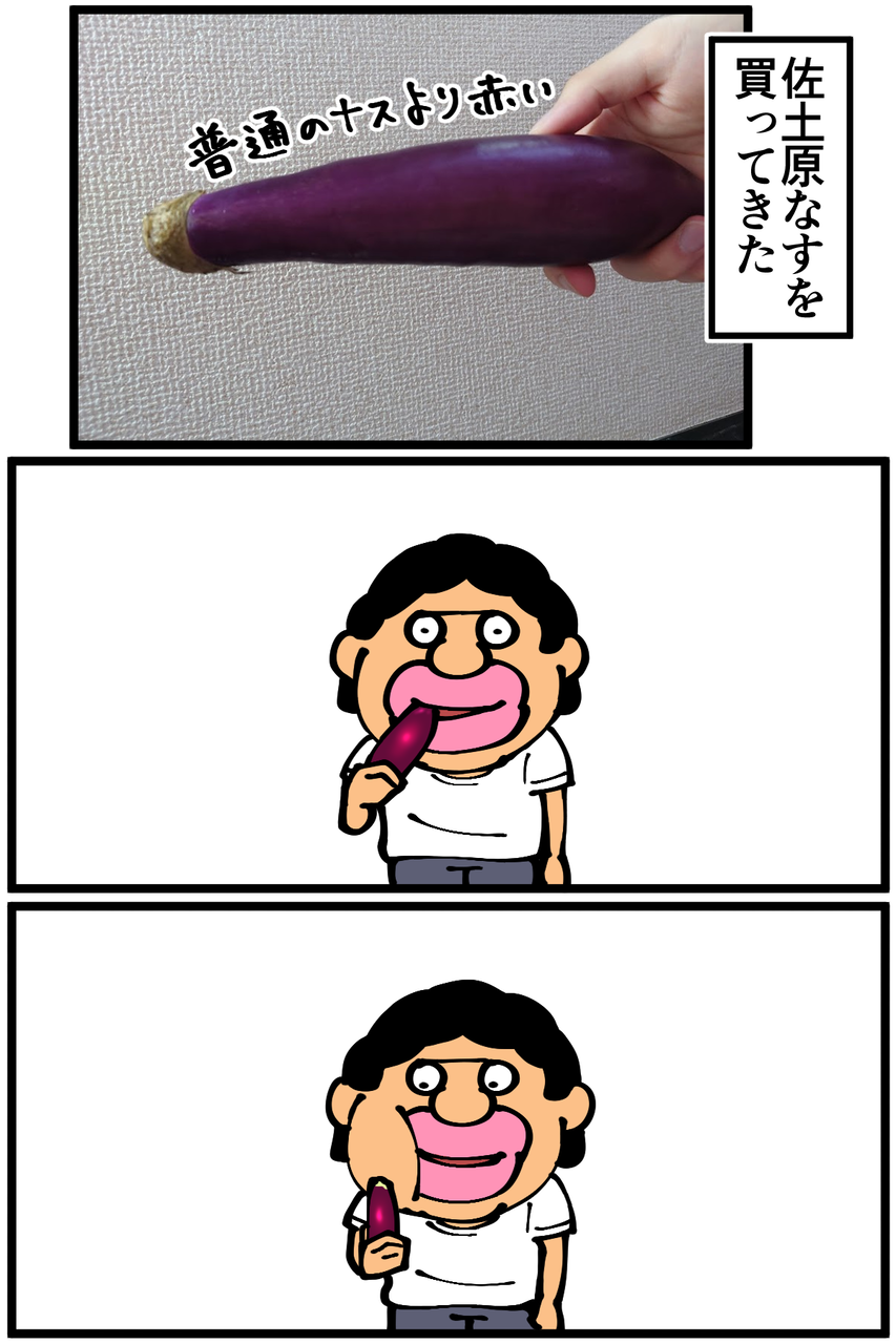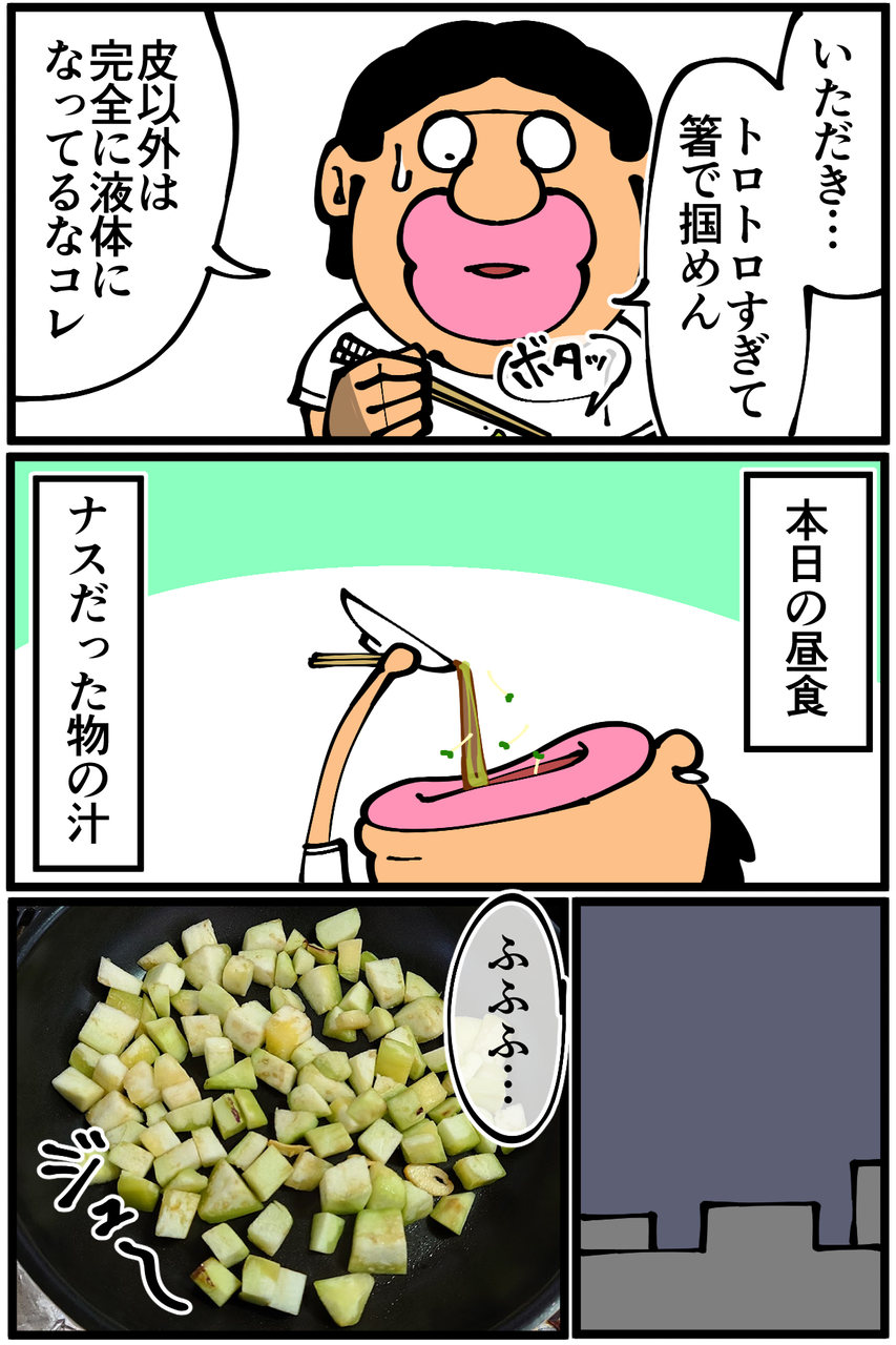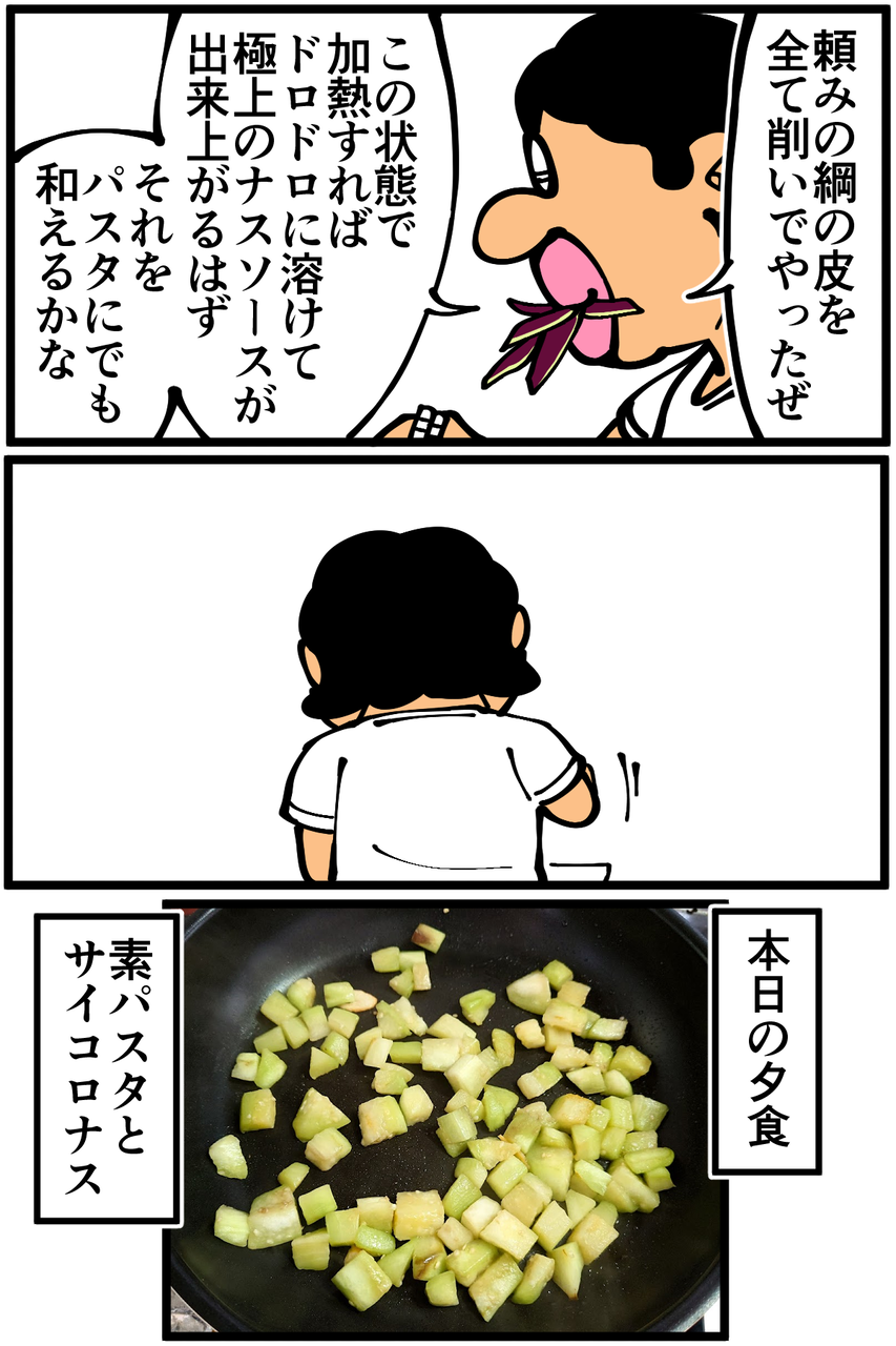 第1061話「佐土原なすを食べる」 2022年05月30日 安アパートでカツカツな生活を送る男の漫画ブログです。金が底を尽きてくたばるようなことがなければ毎日更新します。溶けてほしいときに溶けてくれない。茹で汁を加えたり醤油を加えたりしたんですがサイコロナス軍が全部吸収してソース状になってくれませんでした。変に切らない方がよかったんでしょうか。佐土原なす、最寄りのスーパーだと滅多に見かけないのが残念なんですが甘味が強くて凄く美味しかったです。次の記事↓ 前に作ったナスのステーキ↓ ●Twitterやってます。●登録していただくと更新通知がLINEで届きます↓●こちらのページから過去記事一覧が見られます↓●LINEスタンプ販売中です。 「絵日記」カテゴリの最新記事 「料理」カテゴリの最新記事 < 前の記事次の記事 > コメント コメント一覧 (49) 1. なめこ 2022年05月30日 20:46 トマトパスタで進化したと思ったのに……(^_^;) でも先生らしくていいかも。 0 taikutsu_ken がしました 24. 退屈健 2022年05月31日 23:41 >>1 結局いつも通りです!笑 0 taikutsu_ken がしました 2. NATSU 2022年05月30日 20:50 うああああああ!! 佐土原ナス!! 煮浸しにして丸ごとジュルッと食べるのが好きです 佐土原町出身のわたしです 0 taikutsu_ken がしました 25. 退屈健 2022年05月31日 23:42 >>2 おおお、ご出身佐土原でしたか!! トロトロなのでその食べ方は最高に美味しそうですね~! 0 taikutsu_ken がしました 3. みょんた 2022年05月30日 20:55 茄子生で食ってる!? 茄子飲んでる!? ふぁ!?ってなった。 けど、退屈先生だし当たり前でした。 うんうん。 0 taikutsu_ken がしました 26. 退屈健 2022年05月31日 23:43 >>3 一般的には見ないですが俺の生活においては割と見かける光景です!笑 0 taikutsu_ken がしました 4. 浜茶 2022年05月30日 20:57 今夜はナスと豚肉の味噌炒めでした。 焦がしました。 先生みたいにちょっと生でかじるべきだった。 0 taikutsu_ken がしました 27. 退屈健 2022年05月31日 23:43 >>4 ナスと豚肉の味噌炒め美味しそう…! 生でかじるのも美味しいのでオススメです!笑 普通のナスの場合、生食の前にしっかりアク抜きするとよいそうです! 0 taikutsu_ken がしました 5. みゆみゆ 2022年05月30日 20:59 おかえりなさい!先生😂 0 taikutsu_ken がしました 28. 退屈健 2022年05月31日 23:44 >>5 結局このスタイルです!笑 0 taikutsu_ken がしました 6. けいこ 2022年05月30日 21:09 4コマ目焼き芋かと思った 最初の料理はナスの生姜焼きですかね うちでよく作るのにそっくりだったので 0 taikutsu_ken がしました 29. 退屈健 2022年05月31日 23:45 >>6 確かに焼き芋感ありますね!笑 おお、そっくりでしたか! 生姜は今回入れなかったんですが入れるべきでした…! 0 taikutsu_ken がしました 7. スズメ 2022年05月30日 21:11 当然のようにかじるんですね 0 taikutsu_ken がしました 30. 退屈健 2022年05月31日 23:45 >>7 まずはかじってみます!笑 0 taikutsu_ken がしました 8. mohishi 2022年05月30日 21:12 皮を食べながらサイコロナスを炒めてるの笑うけど、ワカルやっちゃう(ナスじゃないけど笑) サイコロナスが液状化しなかったのは、皮を剥ぐことにより蓋の役割がなくなり蒸されなかったからだと思われます。サランラップでレンチンした方がトロトロになったのではないでしょうか。炒めてるのと水分抜けやすいと思うのですが、どうでしょうか 0 taikutsu_ken がしました 31. 退屈健 2022年05月31日 23:46 >>8 なるほど!!皮がフタの役割を果たしていてくれてたんですね…! ラップしてレンチンならしっかりトロトロになってそうでしたね~!そうするべきだった…! 0 taikutsu_ken がしました 9. 嫁 2022年05月30日 21:44 皮が蓋の役割になって蒸発せずにトロトロになってたんでしょうねぇ ナス美味しいよねー。何故か沖縄にも稀に水茄子(唯一、生食できるナスだが大阪の一部地域でしか食べられない)が売ってるのできゃっほーいって大量購入して縦にグワっと割いてかつぶしとカラシ麺つゆドバッとして食べますー。そろそろ出回るかなー。楽しみです。 0 taikutsu_ken がしました 32. 退屈健 2022年05月31日 23:47 >>9 なるほど、皮がフタの役割を!! おおお、水茄子!そんな食材があるんですか、食べてみたい…!! 0 taikutsu_ken がしました 10. 通りすがりの名無し 2022年05月30日 22:10 すみません、何話か前のおしゃれなトマトパスタと、ナスの丸齧りが脳内でつながらず、思考回路はショート寸前です。 先生って…お二人いらっしゃいますか? ナス、美味しいですね! 焼いてちょっと醤油垂らすだけで絶品です。 0 taikutsu_ken がしました 33. 退屈健 2022年05月31日 23:48 >>10 通常営業の姿はどちらかと言うと丸かじりの方です!笑 ナス美味しいですよね~! 0 taikutsu_ken がしました 11. 紅茶スキー 2022年05月30日 22:43 ナスは油との相性が最高なんですよね。 あとは豚肉と一緒に炒めるだけでも最高です。 最近腕をあげたトマトパスタとコラボして、ナスのトマトパスタなんてオシャレですね。 0 taikutsu_ken がしました 34. 退屈健 2022年05月31日 23:48 >>11 なるほど、トマトパスタに合わせるのも美味しそうで