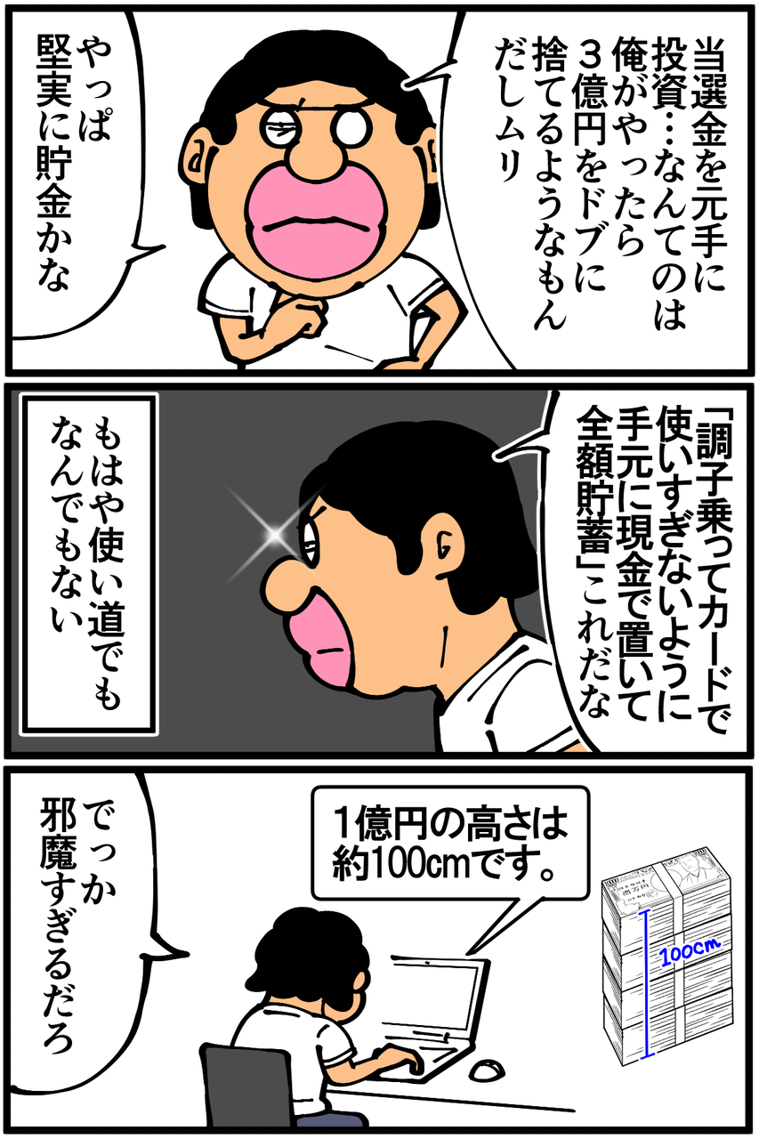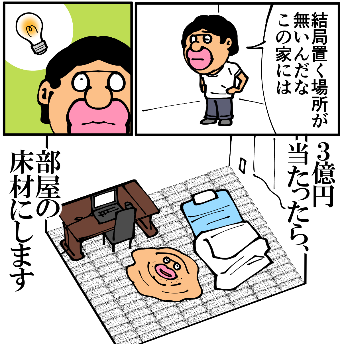 第1082話「もしも宝くじで3億円当たったら」 2022年06月23日 ブログネタ:【公式】宝くじで3億円当たったら? に参加中! 安アパートでカツカツな生活を送る男の漫画ブログです。金が底を尽きてくたばるようなことがなければ毎日更新します。前回の記事の続きです。高額当選妄想を本気でしすぎた結果、実際は金欠という現実を受け入れられなくなりました。次の記事↓ ●Twitterやってます。●登録していただくと更新通知がLINEで届きます↓●こちらのページから過去記事一覧が見られます↓●LINEスタンプ販売中です。 「絵日記」カテゴリの最新記事 < 前の記事次の記事 > コメント コメント一覧 (44) 1. みょんた 2022年06月23日 23:04 1番夢がありそうです全く嬉しくない夢! 親にプレゼントしたらそんなにかかるんですか!!!! …親にプレゼントはやめておこう…。 勉強になりました。 そんなに税金持っていかんでもええじゃろに… 0 taikutsu_ken がしました 23. 退屈健 2022年06月25日 10:15 >>1 そうなんです、俺も具体的な額を調べて驚きでした! でもこういったことを調べたり考えたりするのも意外と楽しいですね!笑 0 taikutsu_ken がしました 2. なめこ 2022年06月23日 23:09 前にみなさんでやってた窒息ゲーム?のキャラみたいなのが映ってるハコは何なのかと思ってたのですが、食洗機だったのですか。 億ションでカツカツ生活は、金はあるけど孤独○する人みたいになりそうですから、先生は地面に近い場所にいて下さい(笑) 0 taikutsu_ken がしました 22. シュフ 2022年06月24日 22:17 >>2 窒息ゲーム??と思って食洗機のイラスト見たら、もしやAmong Usのことですか? 言葉選びにセンスありすぎて噴き出しちゃいましたー!笑 0 taikutsu_ken がしました 24. 退屈健 2022年06月25日 10:16 >>2 確かに、俺がタワマンの最上階なんかに住んでいたらひっそりと死んでるかもしれないです!笑 0 taikutsu_ken がしました 3. mohishi 2022年06月23日 23:10 私は10億当たったらで想定してますよ!! 妄想めちゃくちゃ楽しんでるのに肝心の宝くじは滅多に買いません笑 0 taikutsu_ken がしました 25. 退屈健 2022年06月25日 10:16 >>3 10億バージョンだとさらに夢が広がりそうですね!!笑 0 taikutsu_ken がしました 4. ななし 2022年06月23日 23:11 素パスタで家建てましょう 0 taikutsu_ken がしました 26. 退屈健 2022年06月25日 10:17 >>4 腹が減ったら食べられるし最高ですね!笑 0 taikutsu_ken がしました 5. 嫁 2022年06月23日 23:11 じゃあ私は札束の風呂に入るかな 0 taikutsu_ken がしました 27. 退屈健 2022年06月25日 10:17 >>5 一度はやってみたいですね!笑 0 taikutsu_ken がしました 6. 以下、名無し 2022年06月23日 23:11 億ションでカツカツ生活って、端から見たら倹約家に見えるんでしょうかね。維持費が幾ら掛かることやら。。。 いっそ不労所得目当てでアパート建てるのもありかと。住人全員がカツカツだったり...w 0 taikutsu_ken がしました 11. 紅茶スキー 2022年06月24日 00:31 >>6 維持費は概算ですけど、維持管理費で数万円ぐらいですかね。駐車場使うなら月1万ぐらいにはなるでしょうし、修繕積立金も数万円程度はかかるでしょう(規模感によりますけど) 一番大きいのが固定資産税ですね。 仮に3億円マンションの評価額が2億1千万だと仮定するなら固定資産税1.4%都市計画税0.3%として年間役357万 管理費や積立金をざっくり月10万〜15万とすれば年間480万〜540万ぐらいの維持費ですかね。 月で言えば40万程度の出費 勿論、かなり乱暴な計算なので誤差は出ているでしょうけど。あくまでイメージとしたらこんな感じですかね。 因みに3億の億ションというのは凄い金額ですが、億ションの中では中堅で景気に左右されやすい価格帯です。 これが10億とかになると好景気不景気関わらず売れるとかいうとんでもない世界があったりします。 0 taikutsu_ken がしました 13. 紅茶スキー 2022年06月24日 00:39 >>11 でも、最悪人に貸すと言う手もありますね、 利回りが2%なら年間で600万 経費を差っ引けばギリギリ黒字? まあ、人が常に入ること前提ですけど 0 taikutsu_ken がしました 28. 退屈健 2022年06月25日 10:21 >>6 なるほど、アパートを建てるのもいいですね!貧乏人以外お断りのカツカツ荘を建てます!笑 0 taikutsu_ken がしました 7. プンバ 2022年06月23日 23:33 私もジャンボ宝くじが出る度、買わないくせに当たったらどうしよう(嬉)って妄想するの大好きです! 毎回3分の2は貯金、残りはあーしてこーしてって考えるの楽しんでいる小市民です。とりあえずヨシケイのカット済み具材の配達を週に2回、ヤクルトの配達をしてもらうのはマスト! そして今夜も考えながら眠りにつこう。 0 taikutsu_ken がしました 29. 退屈健 2022年06月25日 10:21 >>7 いいですね~!カット済み具材の配達なんてあるんですか!3億円当たったら俺もマストでそれをしてもらおうと思います!笑 0 taikutsu_ken がしました 8. まるぼうや 2022年06月23日 23:39 声出して笑いました いつも就寝前の癒しをありがとうございます♪ 億ション編も見てみたいですね〜 0 taikutsu_ken がしました 30. 退屈健 2022年06月25日 10:22 >>8 ありがとうござ