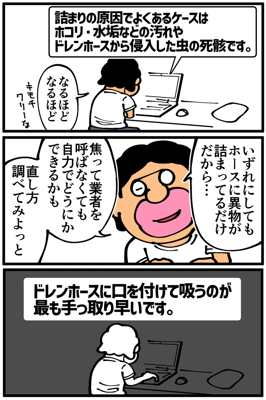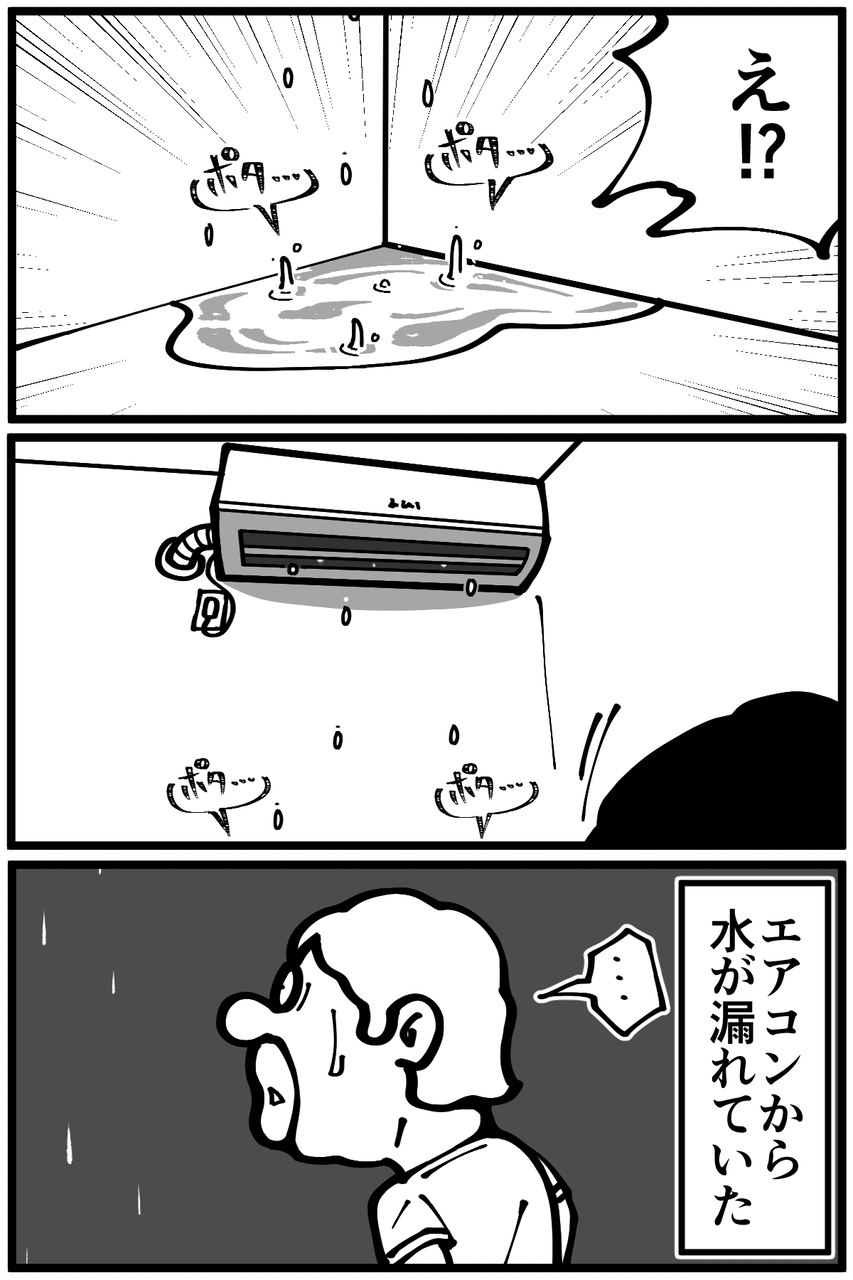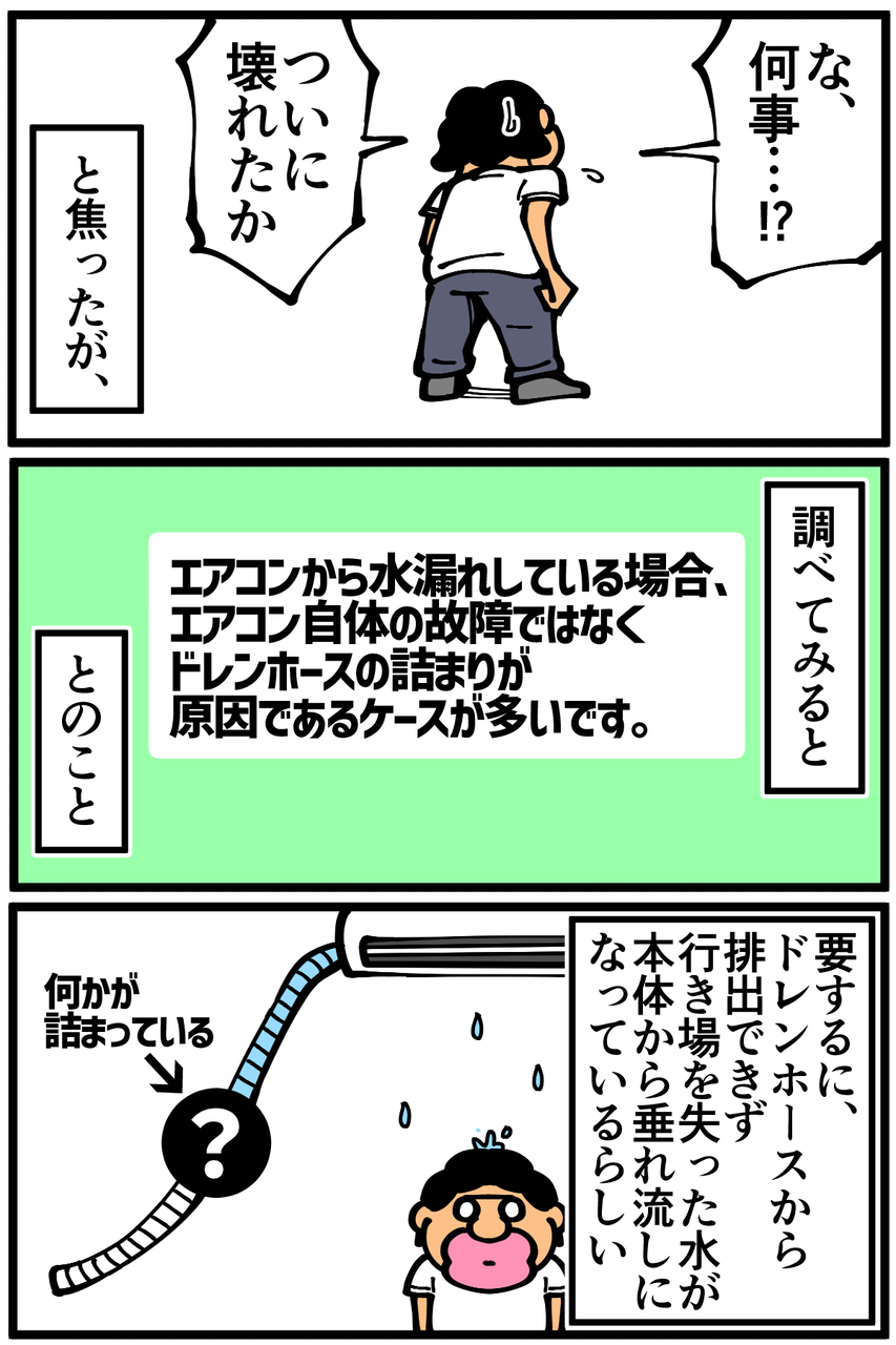 第1101話「エアコンが故障した時の話①」 2022年07月14日 安アパートでカツカツな生活を送る男の漫画ブログです。金が底を尽きてくたばるようなことがなければ毎日更新します。前回の記事を描いて思い出した話です。次回に続きます。続き↓全話まとめページはコチラから↓ ●Twitterやってます。●Instagramでブログの過去記事など更新してます↓●登録していただくと更新通知がLINEで届きます↓●こちらのページから過去記事一覧が見られます↓●LINEスタンプ販売中です。 「絵日記」カテゴリの最新記事 「エアコンが故障した時の話」カテゴリの最新記事 < 前の記事次の記事 > コメント コメント一覧 (45) 1. なめこ 2022年07月14日 20:33 自分が壊れそうですわねぇ。 0 taikutsu_ken がしました 21. 退屈健 2022年07月15日 10:18 >>1 確かに自分が壊れますね…!笑 0 taikutsu_ken がしました 2. スズメ 2022年07月14日 20:34 唐突な年齢発覚!! …え!? 吸ったんですか 0 taikutsu_ken がしました 22. 退屈健 2022年07月15日 10:18 >>2 現32歳です! 吸ったかどうかは…どうでしょうか…!笑 0 taikutsu_ken がしました 3. あるかり 2022年07月14日 20:34 2016年で26歳てことは今年32歳!? 勝手に20代前半だと思ってました笑 0 taikutsu_ken がしました 14. さんせい 2022年07月14日 22:39 >>3 自分は勝手に40代後半くらいと思ってました、 大変シツレイいたしました笑 0 taikutsu_ken がしました 20. ちゅうせい 2022年07月15日 03:27 >>14 「32歳から始める筋トレ」みたいな記事書かれてますよ!今年の5月くらいにあるのでぜひ♪ 0 taikutsu_ken がしました 23. 退屈健 2022年07月15日 10:19 >>3 今年で32になりました! 20代前半、戻りたい…😭笑 0 taikutsu_ken がしました 4. ゆきちお 2022年07月14日 20:35 😱それは嫌だあー‼️ 0 taikutsu_ken がしました 24. 退屈健 2022年07月15日 10:19 >>4 流石にキツいですよね…!笑 0 taikutsu_ken がしました 5. すきっぷ 2022年07月14日 20:53 ドレンホースって室外機側じゃなかったかな 吸いましょう!って他人事なアドバイスですね😆 0 taikutsu_ken がしました 25. 退屈健 2022年07月15日 10:20 >>5 暖房の時は室外機側から、冷房の時は室内機からドレンホースを通して排水されるらしいです~! そうなんです、あまりにもな解決策でビックリでした!笑 0 taikutsu_ken がしました 6. ゆー君 2022年07月14日 20:58 バイト先の恐怖体験ぶりの続きものかな? 今日もこれのために1日頑張れるぞ! てか先生最近料理の記事がない気がしますが食ってますかー 0 taikutsu_ken がしました 26. 退屈健 2022年07月15日 10:21 >>6 3回程度で終わりますがお付き合いいただけたら幸いです! 料理記事最近確かにあまり描けてないですね!相変わらずワケのわからんものを作って食べてます~!笑 0 taikutsu_ken がしました 7. ユーリ 2022年07月14日 21:00 まさか〜!自らの口で吸うって、ないでしょー! また天然の先生のことだから読み間違いしてるんでは…⁈ 0 taikutsu_ken がしました 27. 退屈健 2022年07月15日 10:22 >>7 確かに!もしかしたら自分の口でという意味ではなかったのかもですね…!笑 0 taikutsu_ken がしました 8. kyakya 2022年07月14日 21:40 吸う も確かに選択肢にありましたね😅 0 taikutsu_ken がしました 28. 退屈健 2022年07月15日 10:22 >>8 なかなかの力業ですね!笑 0 taikutsu_ken がしました 9. やしろあづき 2022年07月14日 21:44 フィルター掃除して壊したのかと思いました 先生ほどになると虫の死骸まで食べるんですね 0 taikutsu_ken がしました 29. 退屈健 2022年07月15日 10:23 >>9 いつかは虫の死骸も貴重な栄養素として摂れるようになりたいです!笑 0 taikutsu_ken がしました 10. みさと 2022年07月14日 21:51 心配 0 taikutsu_ken がしました 30. 退屈健 2022年07月15日 10:23 >>10 ご心配いただきありがとうございます! 0 taikutsu_ken がしました 11. やぎ 2022年07月14日 22:17 ダウンタウン松ちゃんの友だちの電気屋さんの人が、それで解決しようとして無理だったと聞いたことがありますが、正攻法だったのかな…? 0 taikutsu_ken がしました 31. 退屈健 2022年07月15日 10:25 >>11 おおお、そうなんですか!もしかしたら間違った解決策だったんでしょうか…!笑 0 taikutsu_ken がしました 12. Nutty 2022年07月14日 22:17 さすがにそこまでしなくても大丈夫です!笑 先生もしてないと思うけどなんやこのネット情報😂 0 taikutsu_ken がしました 32. 退屈健 2022年07月15日 10:25 >>12 身体張りすぎな解決策ですよね~!笑 0 taikutsu_ken がしました 13. プンバ 2022年07月14日 22:29 吸わないでーー!汚すぎるー!! でもカータンさん吸ってはったはず…。 0 taikutsu_ken がしました 33. 退屈健 2022年07月15日 10:26 >>13 おおお、カータンさん吸われてましたか!強い…!!笑 0 taikutsu_ken がしました 43. プンバ 2022年07月15日 21:10 >>33 先生ごめんなさい!私の記憶違い。 カータンさんは吹いておられました。 吸ってません!!そりゃそうだ。 でもカータンさんなら吸ってそうなイメージで…。 0 taikutsu_ken がしました 15. 以下、名無し 2022年07月14日 22:59 水が逆流してきてショートしないもんなんですかね(無知) 0 taikutsu_ken がしました 34. 退屈健 2022年07月15日 10:27 >>15 確かに、俺もそこは心配だった