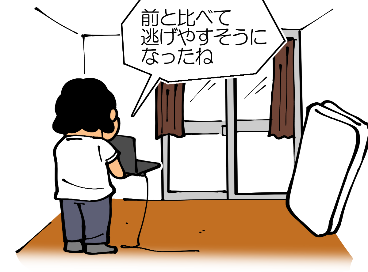 何故か逃げる前提でした。確かに出窓しかなかった前よりかは脱出しやすい部屋だと思うけど俺別にここで囚われてるわけじゃないよ。