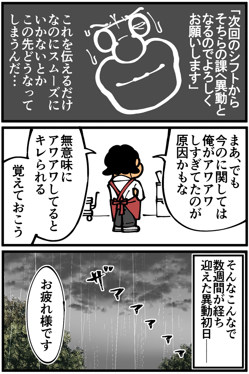 第1113話「【6】バイト先にいたクセが強すぎる社員さんの思い出」 2022年07月27日 安アパートでカツカツな生活を送る男の漫画ブログです。金が底を尽きてくたばるようなことがなければ毎日更新します。前回の記事の続きです。次回に続きます。続き↓ 1話から読む↓全話まとめページはコチラから↓最近使っているメモ帳は(雑過ぎて)怪文だらけ↓●Twitterやってます。●Instagramでブログの過去記事など更新してます↓●登録していただくと更新通知がLINEで届きます↓●こちらのページから過去記事一覧が見られます↓●LINEスタンプ販売中です。 「絵日記」カテゴリの最新記事 「バイト先にいたクセが強すぎる社員さんの思い出」カテゴリの最新記事 < 前の記事次の記事 > コメント コメント一覧 (32) 1. なめこ 2022年07月27日 22:00 コンフュをかけられた人ってこんな感じなのかしら。 0 taikutsu_ken がしました 17. 退屈健 2022年07月28日 22:10 >>1 調べたらFFの呪文?ですか!笑 0 taikutsu_ken がしました 2. 2-10(ニート) 2022年07月27日 22:04 また、進化(退化)しちゃって!(笑) 0 taikutsu_ken がしました 18. 退屈健 2022年07月28日 22:10 >>2 パニックの余り変異を繰り返してました!笑 0 taikutsu_ken がしました 3. ユーリ 2022年07月27日 22:08 イヤですね、こういう教え方が下手な人。 先生、負けないで❗️ 0 taikutsu_ken がしました 19. 退屈健 2022年07月28日 22:10 >>3 俺の理解力が足りないのも相まって大変でした!笑 0 taikutsu_ken がしました 4. みょんた 2022年07月27日 22:10 それメモしても「?」って絶望するやつ。 しかも「メモ取ってたよね?」とか言われるやつ… 0 taikutsu_ken がしました 20. 退屈健 2022年07月28日 22:11 >>4 メモを取ったら取ったで絶望的な状況になるやつですね!笑 0 taikutsu_ken がしました 5. にゃおこ 2022年07月27日 22:31 めんどくさい人~ 先生のブログで初めて毎回イライラしてる(笑) 0 taikutsu_ken がしました 21. 退屈健 2022年07月28日 22:12 >>5 大変でした…!笑 せっかく読んでいただいているのにイライラな内容で申し訳ございません!😭 0 taikutsu_ken がしました 6. 通りすがりの名無し 2022年07月27日 22:34 「何が!?」と言われても「まぁ俺がアワアワしてたのがいけなかったのかも…」となるあたり、先生の人柄の良さというか謙虚さが滲み出てますね。私だったら「何が!?って何よ!?」と心で毒づいてしまいそうで…(面と向かっては言えないタイプ) 0 taikutsu_ken がしました 22. 退屈健 2022年07月28日 22:13 >>6 とんでもないです!こんなこと言いつつ俺も心の中で「なんじゃそら!」と悪態ついてました!笑 0 taikutsu_ken がしました 7. まあ 2022年07月27日 22:48 偉い❗️ メモる!良いことだよー わからないくせに、出来ないくせにメモらない輩沢山いるからね 特にそんなコミュ障上司なら尚更ですね! センセ偉いよー 0 taikutsu_ken がしました 23. 退屈健 2022年07月28日 22:14 >>7 とんでもないです、そもそも理解力が低すぎてメモを取ってもわかっていないような無能でした!笑 でもそう言っていただきありがとうございますー! 0 taikutsu_ken がしました 8. みどり 2022年07月27日 23:31 続けられるのかなぁ、、続きが楽しみ! 0 taikutsu_ken がしました 24. 退屈健 2022年07月28日 22:14 >>8 ありがとうございます、本日続き更新します! 0 taikutsu_ken がしました 9. ぴぷ 2022年07月27日 23:42 スーパー……いますよね……こういう人……(遠い目) 0 taikutsu_ken がしました 25. 退屈健 2022年07月28日 22:14 >>9 いるんですよね…!笑 0 taikutsu_ken がしました 10. 鳥土竜 2022年07月27日 23:44 高校の時そんな感じの人バイト先に居たなぁ。そんなんだから便乗して辞める人間出るんだろうに… 0 taikutsu_ken がしました 26. 退屈健 2022年07月28日 22:15 >>10 おお、同じタイプの方がおりましたか!それは大変な…!笑 0 taikutsu_ken がしました 11. 紅茶スキー 2022年07月27日 23:55 教える気が一切ないタイプですね。 それとも別課とはいえ、スーパーの業務していたから分かるでしょ。ということなのか。 どっちにしても新人で入ってくる子も大変そうですね。 まさか、店長もそれを見越して先生を回した? なんて穿った見方をしてみたり 0 taikutsu_ken がしました 27. 退屈健 2022年07月28日 22:17 >>11 そうなんです、この後描く予定なんですが新人たちも人によってはかなり大変な思いをしていたりで気の毒でした…! 0 taikutsu_ken がしました 12. ゆきちお 2022年07月28日 04:06 仕事は出来る人なんだろーけど、苦手なタイプだわ。 0 taikutsu_ken がしました 28. 退屈健 2022年07月28日 22:17 >>12 なかなかクセの強い方でした…!笑 0 taikutsu_ken がしました 13. †ゆー君† 2022年07月28日 06:46 もうこれまでで何種類もの退屈先生クリーチャーが生まれている… 0 taikutsu_ken がしました 29. 退屈健 2022年07月28日 22:18 >>13 パニックの余り変異を繰り返してました!笑 0 taikutsu_ken がしました 14. ひぃ 2022年07月28日 07:20 こういうヤツって自己評価高いから扱いに困るし余計タチ悪いよな 0 taikutsu_ken がしました 30. 退屈健 2022年07月28日 22:19 >>14 ですね~、自分の信じたこと(だけ)は絶対といった感じのタイプでした…!笑 0 ta