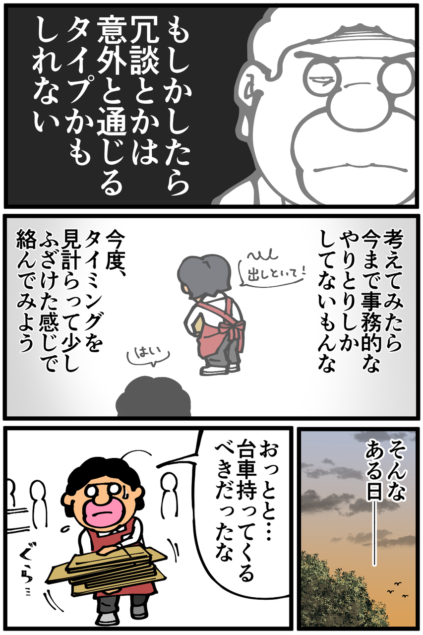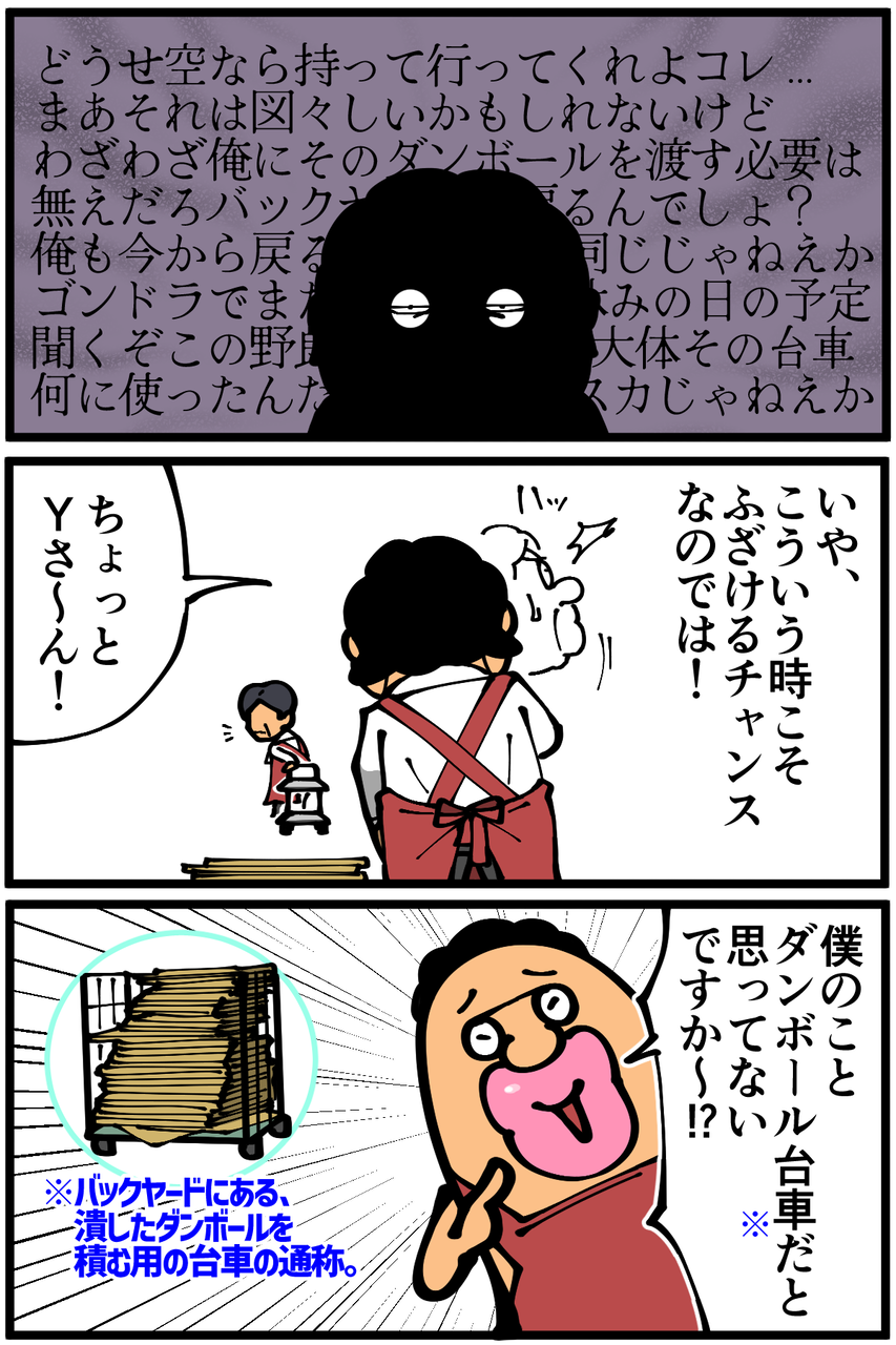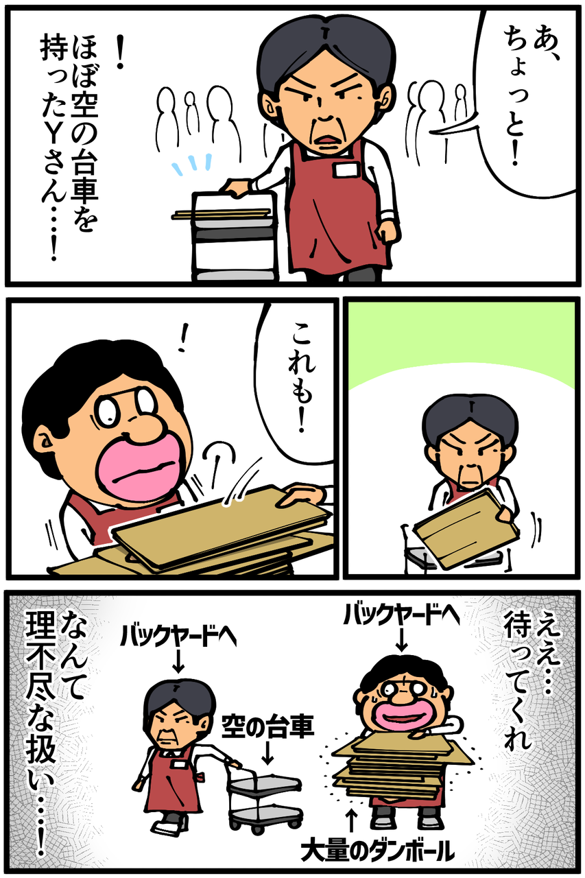 というか、普通はダンボールを大量に持って店をうろついたらお客さんにあたるかもしれないし、手元が狂ってばら撒いてしまうかもしれないから台車を使えと注意してから渡すものなんですが…