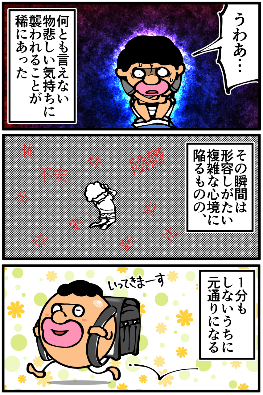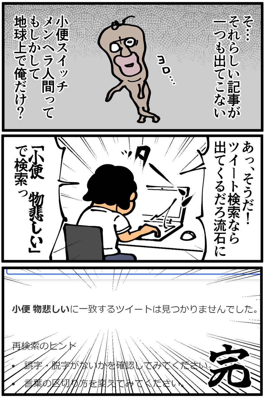 第1151話「これって私だけ?と思うこと」 2022年09月05日 ブログネタ:【公式】「これって私だけ?」と思うこと に参加中! 安アパートでカツカツな生活を送る男の漫画ブログです。金が底を尽きてくたばるようなことがなければ毎日更新します。※少々汚い内容なのでご注意ください!人類史上俺だけだった!非常に残念です。そもそもその状態の心境をきちんと言語化できていないけど。次の記事↓ 最近悲しい気持ちになった時の話↓ トイレで死ぬほどビビってしまった時の話↓ ●Twitterやってます。●Instagramでブログの過去記事など更新してます↓●登録していただくと更新通知がLINEで届きます↓●こちらのページから過去記事一覧が見られます↓●LINEスタンプ販売中です。 「絵日記」カテゴリの最新記事 < 前の記事次の記事 > コメント コメント一覧 (103) 前のコメントを読み込むためにはJavaScriptを有効にしてください。 読み込み中 47. 退屈健 2022年09月06日 12:03 >>2 気になって読み入ってしまいました!読み応えのある面白い記事でした…!笑 0 taikutsu_ken がしました 3. ナメック星人 2022年09月05日 20:34 夢の中で失禁した時は焦ります💦 0 taikutsu_ken がしました 48. 退屈健 2022年09月06日 12:03 >>3 それは焦りますね…!笑 0 taikutsu_ken がしました 4. なめこ 2022年09月05日 20:35 トイレではありませんが、悲しみスイッチみたいなのは入る事ありますね。 私は駅で電車を待っている時に悲しくなる時があります。 0 taikutsu_ken がしました 49. 退屈健 2022年09月06日 12:04 >>4 おお、電車を待っている時に!スイッチも人それぞれで面白いですね! 0 taikutsu_ken がしました 5. ピピ 2022年09月05日 20:35 初めてコメントします、私は女性ですが、大きい方のとき、同じ現象に襲われます。少し安心しました。 0 taikutsu_ken がしました 50. 退屈健 2022年09月06日 12:04 >>5 コメントありがとうございます! おお、そうなんですか!同じ現象の方がいらっしゃって俺も安心しました!! 0 taikutsu_ken がしました 6. かおる 2022年09月05日 20:37 私は経験したことないですね 見たところによると軽いパニック障害みたいなかんじの症状ですね パニック障害とトイレの因果関係を調べてみてはどうでしょうか 0 taikutsu_ken がしました 51. 退屈健 2022年09月06日 12:06 >>6 軽いパニック障害!なるほど…!! ありがとうございます、調べてみます! 0 taikutsu_ken がしました 7. やゆ 2022年09月05日 20:42 記憶にも残っていないくらい小さな頃に、小をしているときに何かそういう感情になるような出来事があったとかかもしれないですね。 その出来事があった時と同じ行動をしていると、そのときの記憶や感情が蘇りやすいものなので。 興味深いですねー! 0 taikutsu_ken がしました 52. 退屈健 2022年09月06日 12:07 >>7 なるほど!昔のトラウマ的な物が知らず知らずのうちに蘇ってるのかもしれないですね! 昔トイレで何があったんだろう…!笑 0 taikutsu_ken がしました 8. ユーリ 2022年09月05日 20:44 小でもちゃんと座ってしてるのは好感持てます。 悲しみスイッチとはまた違いますが、私もトイレ中は「これが終わったら、家事頑張るから…。」ってやる気スイッチを押す準備段階に入ります笑 0 taikutsu_ken がしました 53. 退屈健 2022年09月06日 12:08 >>8 飛び散り防止で座ってする派です!笑 トイレでやる気スイッチON、俺もたまにやってます!笑 0 taikutsu_ken がしました 9. スズメ 2022年09月05日 20:45 唐突な物悲しい気持ちは何となく分かります 臭いがスイッチだったりするんでしょうか? 0 taikutsu_ken がしました 54. 退屈健 2022年09月06日 12:09 >>9 嗅覚から説!もしかしたらそれもあるのかもですね…! 0 taikutsu_ken がしました 10. 名無し 2022年09月05日 20:45 【排べんショック】で検索、検索ぅ! 排便前後などに血圧が低下し、体調不良を訴えたり吐き気、めまい、冷や汗、生あくび、顔面蒼白を起こします。 そして意識消失する方も。 もしかして、先生の物悲しさも血圧低下と関係あるかも? 0 taikutsu_ken がしました 55. 退屈健 2022年09月06日 12:11 >>10 おおお、そういった症状があったんですか!!血圧低下の関係性もありそうですね…! ありがとうございます、調べてみます! 0 taikutsu_ken がしました 11. みり子 2022年09月05日 20:51 おしっこって出すのも貯めるのも自律神経が関係してるから、そのせいでなんとも言えない気持ちになるんじゃないですかね。ちなみに私は濃いブラックコーヒーを飲みすぎるとすごく落ち込みます(これも自律神経が関係してるらしいです) 0 taikutsu_ken がしました 56. 退屈健 2022年09月06日 12:14 >>11 そうなんですね!俺は冷え性が酷かったりと、自律神経乱れまくっている説があるので関係してる可能性ありそうですね…! 0 taikutsu_ken がしました 12. kuri 2022年09月05日 20:52 私はトイレで用を足すとき、悲しくはなりませんが涙が流れます。なんの感情もなくツーっと涙が流れるんです。 そんな人は少数派ですがいるみたいです。「トイレ 涙」で検索すると数件ヒットします。 なぜかはわかりませんけどね。 0 taikutsu_ken がしました 13. まる 2022年09月05