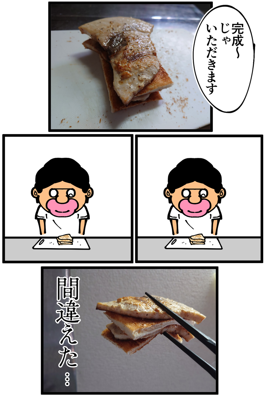 第1208話「メカジキサンドを作る」 2022年10月24日 安アパートでカツカツな生活を送る男の漫画ブログです。金が底を尽きてくたばるようなことがなければ毎日更新します。サンドなのに持てない。「メカジキ2枚あるからビッグマックみたいにできるじゃん!」とテンション上がって挟んでたら時すでに遅しでした。いつか(値引きされていたら)バーガー用のバンズを買ってハンバーガー作ってみようと思います。次の記事↓ ●Twitterやってます。●Instagramでブログの過去記事など更新してます↓●登録していただくと更新通知がLINEで届きます↓●こちらのページから過去記事一覧が見られます↓●LINEスタンプ販売中です。 「絵日記」カテゴリの最新記事 「料理」カテゴリの最新記事 < 前の記事次の記事 > コメント コメント一覧 (32) 1. なめこ 2022年10月24日 22:26 おしゃれですわ。 で、足ります? 0 taikutsu_ken がしました 17. 退屈健 2022年10月25日 19:45 >>1 足りなかったのでちくわとか食べてました! 0 taikutsu_ken がしました 2. 2−10(ニート) ※安全なブログです 2022年10月24日 22:27 終わり(味)よければ全て良しなんですよ! 食べるのは自分なんですから! 0 taikutsu_ken がしました 18. 退屈健 2022年10月25日 19:45 >>2 味が良ければ全て良しですね!!笑 0 taikutsu_ken がしました 3. 舞茸 2022年10月24日 22:29 巨大プクプクさんですから あんぐりしちゃえば問題無しw 0 taikutsu_ken がしました 19. 退屈健 2022年10月25日 19:46 >>3 丸呑みすれば全て解決ですね!笑 0 taikutsu_ken がしました 4. 松茸 2022年10月24日 22:32 えっ、パンが薄すぎません? サンドイッチ用のパンですか? 0 taikutsu_ken がしました 20. 退屈健 2022年10月25日 19:46 >>4 切る時に押し潰し過ぎました…!笑 普通の食パンです~! 0 taikutsu_ken がしました 5. ペコ太郎 2022年10月24日 22:35 写真を見て一瞬「えっ?!」ってなりました。 メカジキサンド美味しそう!! でもそれだけじゃおなかがすきそうです‥ 減量中かな? 0 taikutsu_ken がしました 21. 退屈健 2022年10月25日 19:47 >>5 ありがとうございます、美味しかったです! お察しの通り足りませんでした…!笑 0 taikutsu_ken がしました 6. しずか 2022年10月24日 22:35 パンが薄いんじゃなくてカットする時に抑えすぎてるんじゃないかな? 0 taikutsu_ken がしました 22. 退屈健 2022年10月25日 19:47 >>6 その通りです~!!抑え過ぎました!笑 0 taikutsu_ken がしました 7. まつこ 2022年10月25日 00:51 サンドだけどお箸で食べたんですね笑 バンズで、いろんな具材を足しても美味しそうですね! 0 taikutsu_ken がしました 23. 退屈健 2022年10月25日 19:48 >>7 箸で食べました!笑 色んな具材挟んで作ってみたいですね~! 0 taikutsu_ken がしました 8. けたこ 2022年10月25日 00:53 ナイフとフォークが必要そう 味付けは何だったんですか? 0 taikutsu_ken がしました 24. 退屈健 2022年10月25日 19:49 >>8 ナイフとフォーク必要でしたね!笑 塩胡椒で味付けました! 0 taikutsu_ken がしました 9. 紅茶スキー 2022年10月25日 01:58 メカジキって硬くなりやすいのに調理できて凄いなーと思っていたらどうして……。 まあ、アメリカンなハンバーガーとかには手で持てないやつもありますし 0 taikutsu_ken がしました 25. 退屈健 2022年10月25日 19:50 >>9 手で持てないくらい豪快でアメリカンなハンバーガー、いつか食べてみたいです!笑 0 taikutsu_ken がしました 10. ゆきちお 2022年10月25日 05:01 オサレなカフェのランチみたい☺️と思いつつ読んでいたら違いました。 0 taikutsu_ken がしました 26. 退屈健 2022年10月25日 19:50 >>10 結局箸で食べる謎の食事風景になりました!笑 0 taikutsu_ken がしました 11. ユーリ 2022年10月25日 06:50 挟み直せば今ならまだ間に合いますよ❗️ それか、お箸でパンとメカジキを2枚セットで食べるか。 0 taikutsu_ken がしました 27. 退屈健 2022年10月25日 19:51 >>11 すぐ修正すればギリセーフだったかもしれないですね!笑 0 taikutsu_ken がしました 12. えいとぷりんす 2022年10月25日 07:08 最近更新多くて嬉しい!! 0 taikutsu_ken がしました 28. 退屈健 2022年10月25日 19:51 >>12 ありがとうございます、読んでいただけて嬉しい限りです! 0 taikutsu_ken がしました 13. ユタマル 2022年10月25日 09:56 メカジキサンドならぬ 食パンonメカジキ・・・・・・・・・・ メカジキパンですね 0 taikutsu_ken がしました 29. 退屈健 2022年10月25日 19:52 >>13 名称に困る一品になりました!笑 0 taikutsu_ken がしました 14. ゆう 2022年10月25日 14:15 美味しければ無問題! 0 taikutsu_ken がしました 30. 退屈健 2022年10月25日 19:52 >>14 美味しければ全て良しですね!笑 0 taikutsu_ken がしました 15. BBA 2022年10月25日 15:31 お味のほうはいかがでしたか? 0 taikutsu_ken がしました 31. 退屈健 2022年10月25日 19:52 >>15 美味しかったです~! 0 taikutsu_ken がしました 16. 2022年10月25日 16:26 バーガー(バーカー) 0 taikutsu_ken がしました 32. 退屈健 2022年10月25日 19:53 >>16 バカが作るバーガーでした!笑 0 taikutsu_ken がしました コメントフォーム 名前 コメント 記事の評価 リセット リセット 顔 星 情報を記憶 コメントを投稿する