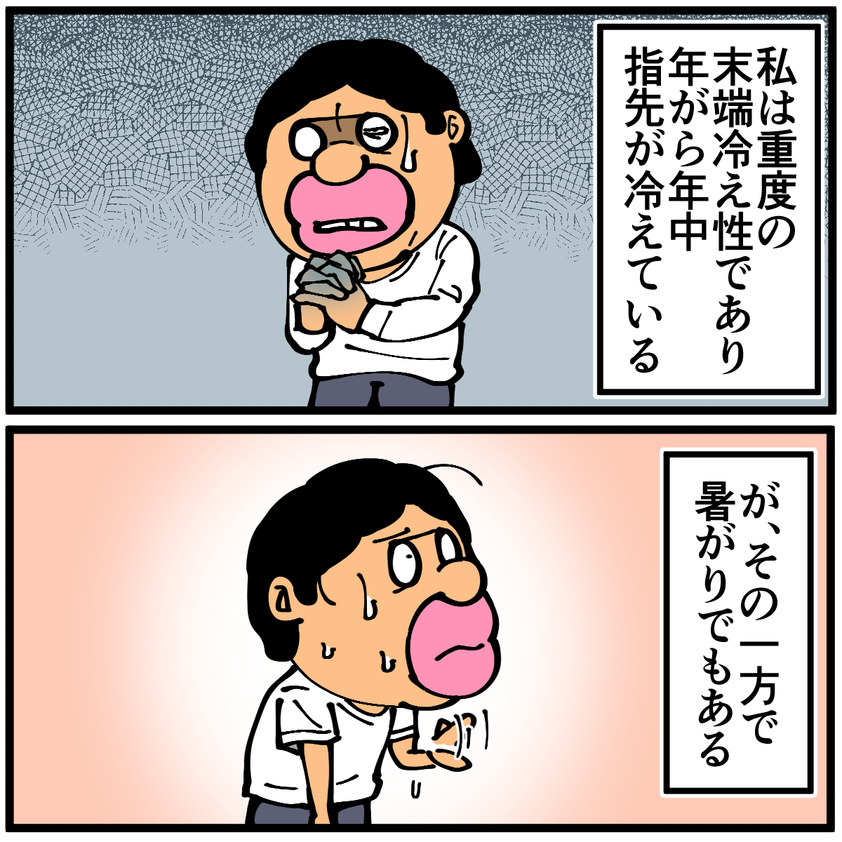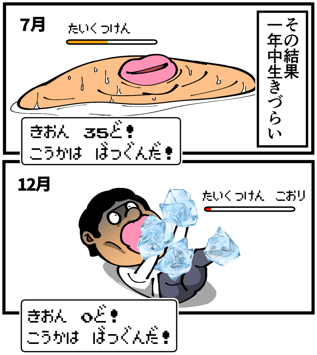 第1215話「暑がりで冷え性」 2022年10月28日 安アパートでカツカツな生活を送る男の漫画ブログです。金が底を尽きてくたばるようなことがなければ毎日更新します。去年頃から改善を諦めて活用に可能性を見出し始めました。でも会得する前に死にそうなので今年こそどうにかして冷え性をもう少しマシにしようと思います。次の記事↓ 昔からずっと悩んでます↓ ●Twitterやってます。●Instagramでブログの過去記事など更新してます↓●登録していただくと更新通知がLINEで届きます↓●こちらのページから過去記事一覧が見られます↓●LINEスタンプ販売中です。 「絵日記」カテゴリの最新記事 < 前の記事次の記事 > コメント コメント一覧 (54) 1. なめこ 2022年10月28日 23:13 末端に血を通わせる方が早いって(^_^;) 0 taikutsu_ken がしました 28. 退屈健 2022年10月31日 11:12 >>1 頑張って通わせます!笑 0 taikutsu_ken がしました 2. ペドロ 2022年10月28日 23:23 運動しましょう。 血流と代謝が悪いんですよ。 0 taikutsu_ken がしました 29. 退屈健 2022年10月31日 11:12 >>2 運動不足の極みなので確実にそれも影響してそうですね…!😭 0 taikutsu_ken がしました 3. たーさん 2022年10月28日 23:29 一緒や 最近 汗が落ち着いたらと思ったら 手足 キンキンです おしっこ近くないてすか? 0 taikutsu_ken がしました 30. 退屈健 2022年10月31日 11:13 >>3 おお、一緒ですね! トイレはどうだろう、そこまで近くないかもしれないです…! 0 taikutsu_ken がしました 4. プチ子 2022年10月28日 23:29 湯たんぽで温めるのはどうですか? 0 taikutsu_ken がしました 31. 退屈健 2022年10月31日 11:14 >>4 湯たんぽいいですね! 毎年買おうかと悩みつつ結局冬を越してしまうので今年こそ…!笑 0 taikutsu_ken がしました 5. た 2022年10月28日 23:33 運動も足りてないと思うのですが、貧血っぽいので鉄分のサプリおすすめします!1ヶ月500円くらいです 0 taikutsu_ken がしました 32. 退屈健 2022年10月31日 11:14 >>5 なるほど、鉄不足!サプリ買ってみますありがとうございます! 0 taikutsu_ken がしました 6. 2−10(ニート) ※安全なブログです 2022年10月28日 23:37 ボクも会得目指して頑張ります! 一緒に頑張りましょう! 0 taikutsu_ken がしました 33. 退屈健 2022年10月31日 11:15 >>6 会得も目指しつつ改善も目指します!(強欲) 0 taikutsu_ken がしました 7. よんよん 2022年10月28日 23:38 運動が一番ですが、食事に生姜を取り入れると血流良くなって冷え性改善しますよ♪ もちろんチューブ生姜でもOKです⭐️ 0 taikutsu_ken がしました 34. 退屈健 2022年10月31日 11:58 >>7 生姜いいですね~!元々好きでもあるのでこれからの時期どんどん使っていこうと思います! 0 taikutsu_ken がしました 8. まめち 2022年10月28日 23:54 う~ん、昭和っぽく養命酒はいかがですか? 血行促進に 0 taikutsu_ken がしました 35. 退屈健 2022年10月31日 11:58 >>8 養命酒効くみたいですね! お金に余裕があったらいつか買いたい…! 0 taikutsu_ken がしました 9. 通りすがり 2022年10月29日 00:00 足の冷えをどうにかしたいと思ってYouTubeで調べてふくらはぎの皮膚を摘んで筋肉から剥がすマッサージをしたら長年行方不明になってた足首が出現しましたよ!筋肉を動かすだけでなく、筋膜の癒着も血行不良の原因みたいです。 0 taikutsu_ken がしました 36. 退屈健 2022年10月31日 11:59 >>9 おお、マッサージで!!それは凄いですね! 俺も手指のマッサージしてみようかな…! 0 taikutsu_ken がしました 10. なし 2022年10月29日 00:21 これを機に 筋トレを再開したら、 いかがでしょう。 寒く感じて 運動不足になり、 最悪 鬱を誘発する事例が多くあります。 お体ご自愛ください。 0 taikutsu_ken がしました 37. 退屈健 2022年10月31日 12:01 >>10 運動不足解消も兼ねてちゃんと筋トレ再開しないとですね! 寒いと気持ちも鬱々としてきてしまいますね~😭ご心配頂きありがとうございます! 0 taikutsu_ken がしました 11. こま 2022年10月29日 00:23 女性にありがちな感じですね。体質的な原因なら、漢方薬が効くかも。 0 taikutsu_ken がしました 38. 退屈健 2022年10月31日 12:01 >>11 漢方薬効くんですね!いつか試してみたい…! 0 taikutsu_ken がしました 12. モリヒロ 2022年10月29日 00:28 養命酒いいですよ 0 taikutsu_ken がしました 39. 退屈健 2022年10月31日 12:02 >>12 養命酒効くんですね!いつかお金に余裕が出来たら試してみたい…! 0 taikutsu_ken がしました 13. 冷え性で 2022年10月29日 00:28 すぐ出来る対策は、寝起きに白湯を飲む事。 内臓の冷えが原因なので白湯を習慣にすると楽になるかと。 あと、今年の冬は寒さが厳しい予報なので、今年こそ低燃費暖房の電気毛布を準備しましょうよ😰 使い捨てカイロよりエコですよ。 0 taikutsu_ken がしました 40. 退屈健 2022年10月31日 12:05 >>13 寝起きの白湯いいんですね!お手軽で安上がりだし現状の僕にピッタリかもしれない…! 低燃費暖房の電気毛布!今年もカイロに頼ろうと思っていたんですがもし買えそうな余裕があったらそういった便利グッズも買おうと思います! 0 taikutsu_ken がしました 14. ななし 2022年10月29日 00:57 ジムおすすめです。ジャグジーあるとこもある
