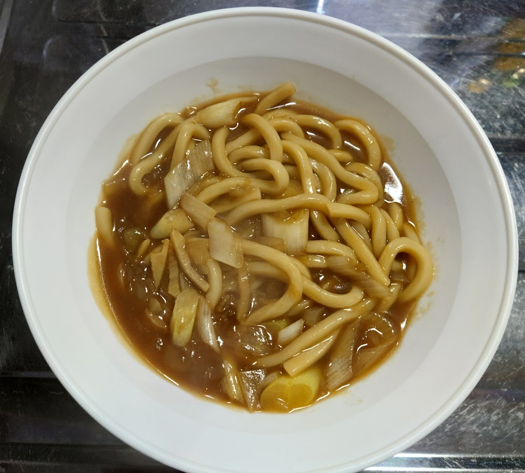 途中で気が変わって水の量を200~300mlくらいに増やしてめんつゆも加え、うどんと長ネギを投入してみたらそれっぽいカレーうどんになりました。みじん切りの玉ねぎ入りという謎のつゆですがこれも美味しかったです。