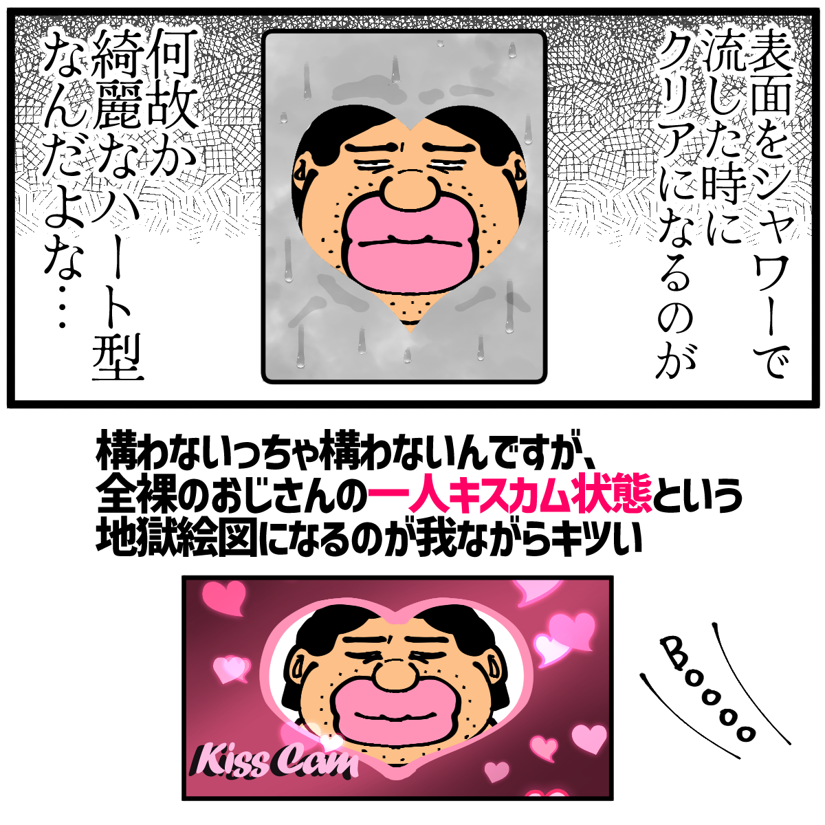 鏡を使うのは基本的に髭剃りの時なので、ラブリーなハートの中で汚いオッサンが髭を剃るという奇妙な構図になってます。でもキモいだけで一応映るのでまだ使う。