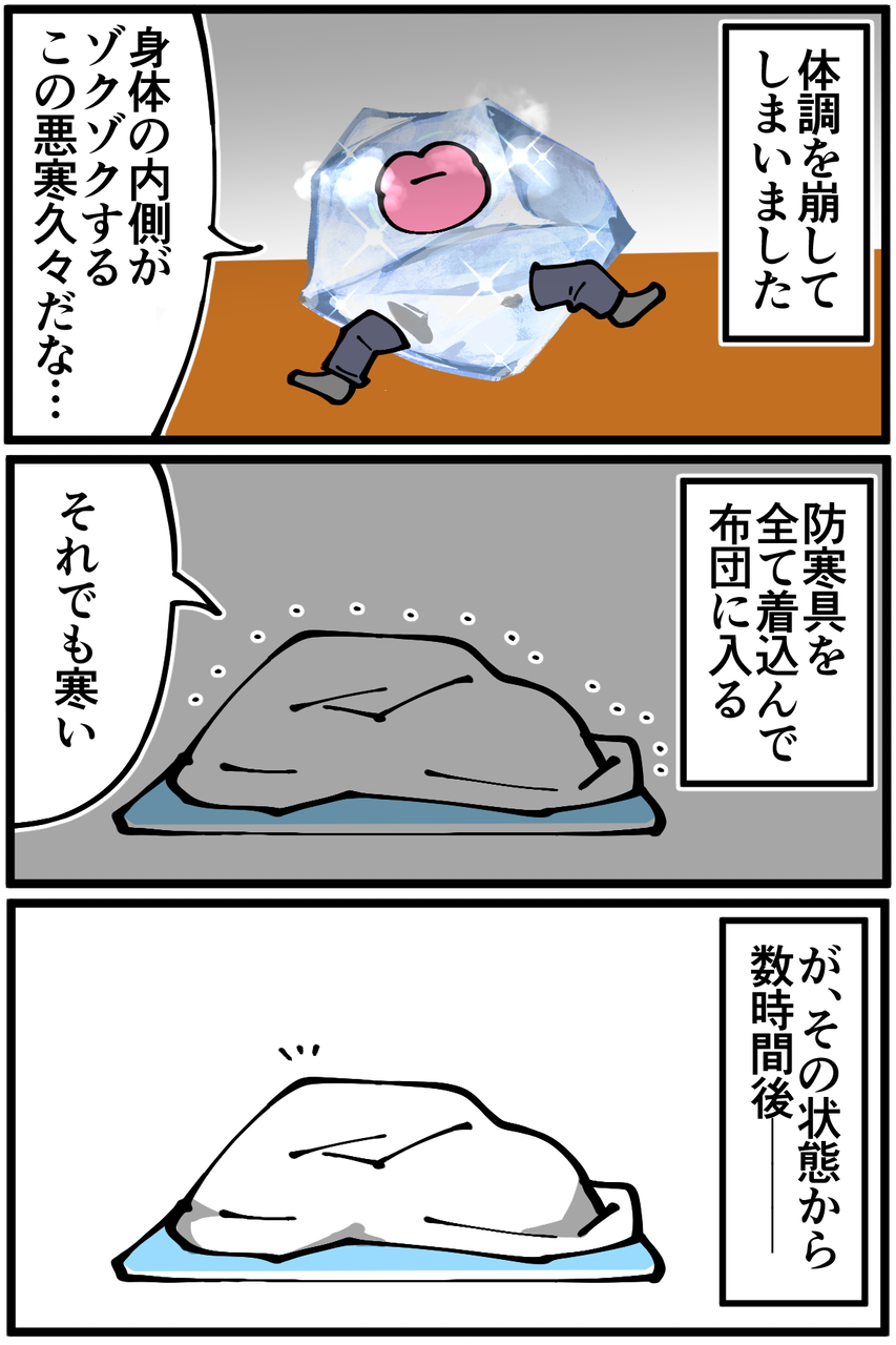 LINE Monaryさんで描かせていただいている連載漫画、第4話が更新されました!そんなもん描くなという話ですが絶対に真似しないでいただきたい冷え性改善策です⛄