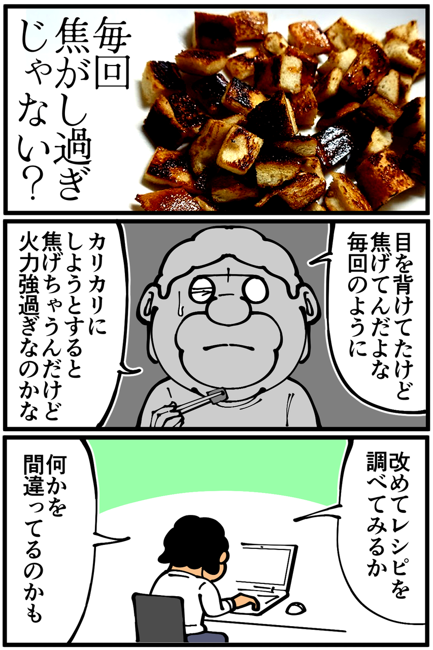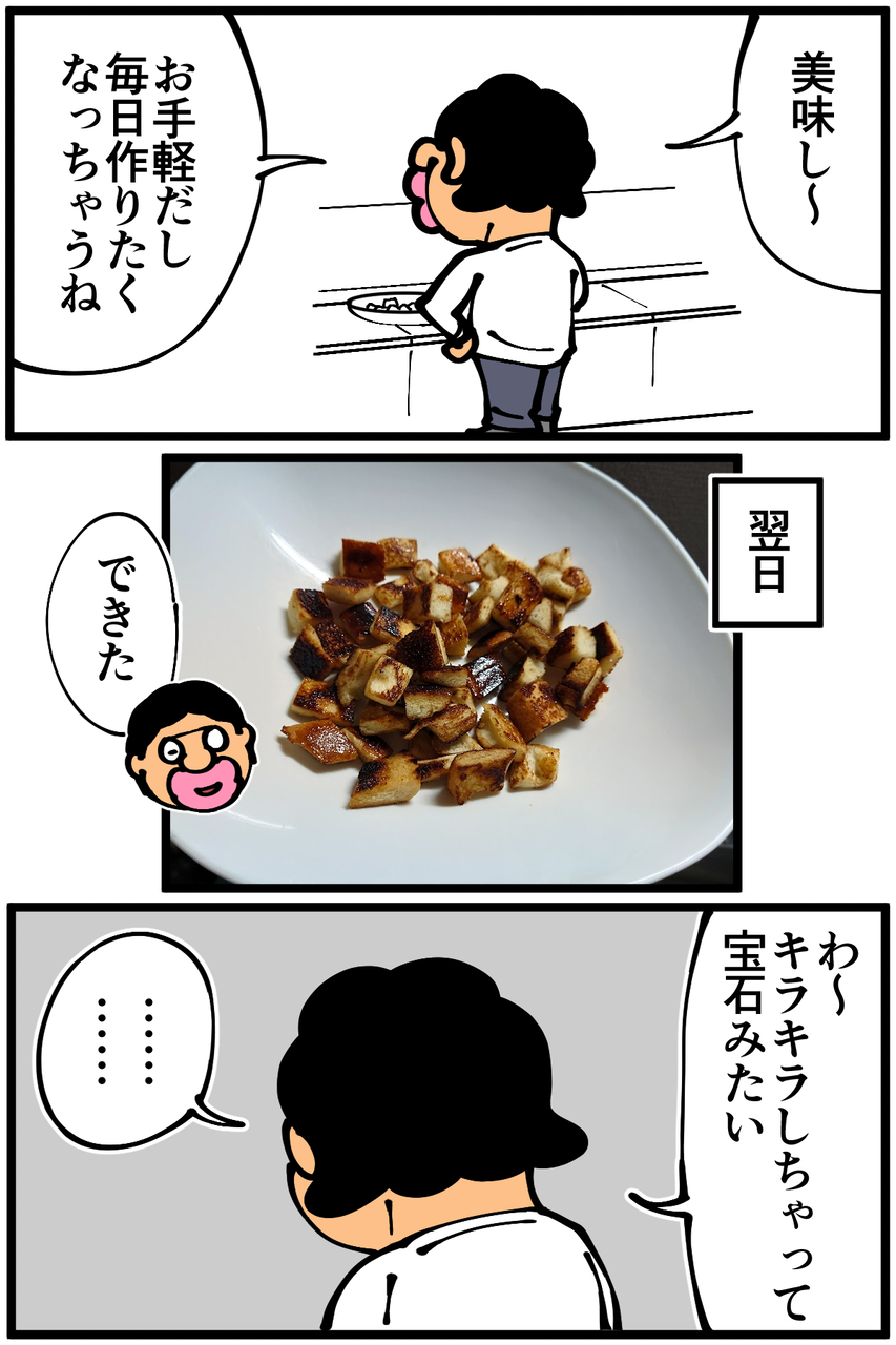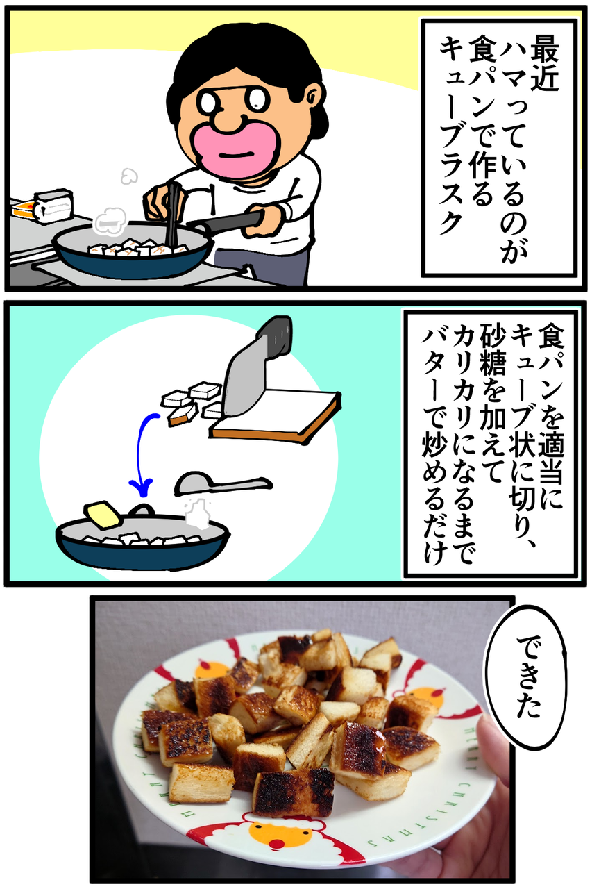 第1304話「最近よく作るキューブラスク」 2023年01月29日 安アパートでカツカツな生活を送る男の漫画ブログです。金が底を尽きてくたばるようなことがなければ毎日更新します。誤解を招く表現になってしまったかもしれないので念のため補足ですが、ネットにあった工程が誤っていたのではなく私の調理技術のせいでコゲただけです。次の記事↓ キャラメルシュガートーストに挑戦した時の話↓ 個人的にヒットした菓子パンアレンジ↓ ●Twitterやってます。●Instagramでブログの過去記事など更新してます↓●登録していただくと更新通知がLINEで届きます↓●こちらのページから過去記事一覧が見られます↓●LINEスタンプ販売中です。 「絵日記」カテゴリの最新記事 「料理」カテゴリの最新記事 < 前の記事次の記事 > コメント コメント一覧 (32) 1. なめこ 2023年01月29日 22:06 全て強火でやってるのかしら? 0 taikutsu_ken がしました 16. 退屈健 2023年01月30日 22:15 >>1 中火のつもりなんですが強いのかもです…!笑 0 taikutsu_ken がしました 2. 舞茸 2023年01月29日 22:12 サトウを加えると焦げやすくなりますよね。 先にバターでこんがりさせ火を止めてから サトウと和えても良いかもですよ。🙂 0 taikutsu_ken がしました 17. 退屈健 2023年01月30日 22:16 >>2 なるほど、砂糖を最後にするのよさそうですね!試してみます! 0 taikutsu_ken がしました 3. かっとびランサー 2023年01月29日 22:16 ちょっと作ってみたくて作り方調べたら 「焦げすぎないようにだけ注意すれば失敗は無いと思います!」 って書いてありました 0 taikutsu_ken がしました 18. 退屈健 2023年01月30日 22:16 >>3 その唯一の失敗を繰り返している奇跡!!笑 0 taikutsu_ken がしました 4. 2−10(ニート) ※安全なブログです 2023年01月29日 22:22 まぁ、サクサクになりますし、無しではないのでは…? 0 taikutsu_ken がしました 19. 退屈健 2023年01月30日 22:16 >>4 確かにサクサクなのでアリかもですね!笑 0 taikutsu_ken がしました 5. 分かる 2023年01月29日 22:28 全部同じ写真かと思いました🤣 砂糖って焦げやすいから火加減難しいですよね…! 0 taikutsu_ken がしました 20. 退屈健 2023年01月30日 22:17 >>5 毎回焦がしているせいで全部同じに見えますね!笑 0 taikutsu_ken がしました 6. くろいろ 2023年01月29日 22:34 遠目で見たら角切りした茄子の炒めものみたいですね。溶かしバターと砂糖を混ぜたものを焼いたパンに和える方が簡単かも。 0 taikutsu_ken がしました 21. 退屈健 2023年01月30日 22:17 >>6 炒めたナスくらい黒いですね!笑 確かに順番をそうしたら砂糖が焦げなくて済みそうですね~! 0 taikutsu_ken がしました 7. プチ子 2023年01月29日 23:01 食パンで作るキューブラスク美味しそうですね。 お麩で作るラスクもふわふわでサクサクしていて美味しいのでおすすめです。 0 taikutsu_ken がしました 22. 退屈健 2023年01月30日 22:18 >>7 お麩ラスク美味しそうですね!!今度買って作ってみます! 0 taikutsu_ken がしました 8. あんず 2023年01月29日 23:14 美味しそうですね! 他の方の仰る通り 砂糖は焦がしやすいですよね。 キャラメリゼのとき、 電子レンジで加熱するのいかがでしょう? 0 taikutsu_ken がしました 23. 退屈健 2023年01月30日 22:18 >>8 ありがとうございます! 確かにレンジ加熱の方がいいのかもしれないですね~! 0 taikutsu_ken がしました 9. あの 2023年01月29日 23:36 体に悪そう😭 0 taikutsu_ken がしました 24. 退屈健 2023年01月30日 22:19 >>9 めちゃくちゃ太りそうな味がします!笑 0 taikutsu_ken がしました 10. ああああ 2023年01月30日 00:16 焦げるタイミングがもし、最初の炒めるタイミングなら、 パンをトースターで焼いて切る→「弱火で」パンをバターと砂糖と絡める→火(IH)を止める→砂糖をまぶす とかですかね?でもトースターだと中がふわふわしてしまいますかね? 料理初心者のアドバァァァアイスでした! 0 taikutsu_ken がしました 25. 退屈健 2023年01月30日 22:20 >>10 アドバァァァアイスありがとうございます! トースターが無いのですがグリルで代用できそうですね~!それなら焦がす心配もなさそう…!! 0 taikutsu_ken がしました 11. ゆきちお 2023年01月30日 05:53 ♪わかってた 予想はついていた😁 美味いと思えたならいいと思います‼️ 0 taikutsu_ken がしました 26. 退屈健 2023年01月30日 22:20 >>11 案の定な結末でした!笑 美味しかったのでヨシとします!笑 0 taikutsu_ken がしました 12. てか 2023年01月30日 07:59 カ、カラメル風味ってことで 0 taikutsu_ken がしました 27. 退屈健 2023年01月30日 22:21 >>12 カラメル風味最高です!笑 0 taikutsu_ken がしました 13. ユーリ 2023年01月30日 11:48 レシピ通りにしたはずなのに…っ❗️笑 0 taikutsu_ken がしました 28. 退屈健 2023年01月30日 22:21 >>13 調理技術の低さがそれを上回りました…!笑 0 taikutsu_ken がしました 14. ゆきみだいふく 2023年01月30日 11:57 焦がしたほうがボリボリしてて美味しいから自分は好きだなぁ 0 taikutsu_ken がしました 29. 退屈健 2023年01月30日 22:21 >>14 コゲの食感、クセになりますね! 0 taikutsu_ken がしました 15. しろくま 2023年01月30日 18:46 朝(昼)御飯の準備する時ついでに食