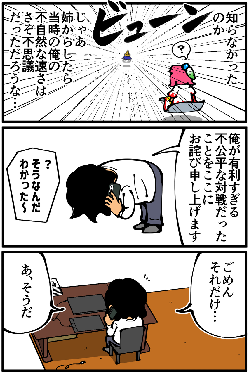 第1310話「姉と私と対戦ゲーム⑥」 2023年02月03日 安アパートでカツカツな生活を送る男の漫画ブログです。金が底を尽きてくたばるようなことがなければ毎日更新します。前回の記事 の続きです。次回(最終回)に続きます。日常絵日記は本日夜更新します!続き↓ 1話から読む↓最近ハマったレトロゲーム↓ 2も超名作でした↓ ●Twitterやってます。●Instagramでブログの過去記事など更新してます↓●登録していただくと更新通知がLINEで届きます↓●こちらのページから過去記事一覧が見られます↓●LINEスタンプ販売中です。 「絵日記」カテゴリの最新記事 「姉と私と対戦ゲーム」カテゴリの最新記事 < 前の記事次の記事 > コメント コメント一覧 (27) 1. なめこ 2023年02月03日 17:13 急に弟から連絡があって、かなりヒヤッとしたでしょうな。 結果チョコボレーシングの話だったけど(笑) 0 taikutsu_ken がしました 11. 退屈健 2023年02月05日 15:49 >>1 物凄く昔のチョコボレーシングの話という謎の連絡でした!笑 0 taikutsu_ken がしました 2. ユーリ 2023年02月03日 17:45 まさかのハンデに気づかず❗️ あんた何かズルイことしてない❓とかはなかったんですかね❓ 0 taikutsu_ken がしました 12. 退屈健 2023年02月05日 15:54 >>2 違和感はあったと思うんですが優しさで見逃していてくれてたんだと思います…!笑 0 taikutsu_ken がしました 3. 竹の子 2023年02月03日 19:21 先生はお姉さんのこと何て呼んでたんですか? 「お姉ちゃん」? 「ねぇちゃん」? 「アネキ」? 0 taikutsu_ken がしました 13. 退屈健 2023年02月05日 15:55 >>3 お姉ちゃんですかね!昔は〇〇(名前)ちゃんだったりもしました! 0 taikutsu_ken がしました 4. シュフ 2023年02月03日 19:58 謝らなくても良さそうなのに謝る先生にほんわかし、「? そうなんだ わかった〜」て適当にあしらわれてるの微笑ましすぎてにやけました。 ほんわか姉弟なんですねぇ♪ 私は中学で部活中に同じ部で生意気な態度だった年子の妹とつかみ合いになって周りに止められたりしてました。こわ 0 taikutsu_ken がしました 14. 退屈健 2023年02月05日 15:58 >>4 おおお、つかみ合い!それは激しい!笑 でもそれによって周りも競争心が刺激されて結果的に部活全体に良い影響を与えたと思います!笑 0 taikutsu_ken がしました 5. み 2023年02月03日 20:27 仲良いと昔のことでも覚えてますよね! ほっこりしました笑 0 taikutsu_ken がしました 15. 退屈健 2023年02月05日 15:59 >>5 どれだけ昔でも印象的なエピソードってありますよね~! ありがとうございます! 0 taikutsu_ken がしました 6. ゆきちお 2023年02月03日 22:38 ハンデ機能知らなかったんですね⁉️ 弟マジ強いって思ってたんでしょうね。 0 taikutsu_ken がしました 16. 退屈健 2023年02月05日 15:59 >>6 不自然に速いなあと思っていたと思います!笑 0 taikutsu_ken がしました 7. 2−10(ニート) ※安全なブログです 2023年02月03日 23:10 とても微笑ましい姉弟ですね! 0 taikutsu_ken がしました 17. 退屈健 2023年02月05日 16:00 >>7 激しい喧嘩とはあまり縁の無い感じの姉弟でしたね!笑 0 taikutsu_ken がしました 8. dd 2023年02月03日 23:15 先生のお姉さんにまつわるお話すき🥺💓 0 taikutsu_ken がしました 18. 退屈健 2023年02月05日 16:00 >>8 ありがとうございます! 0 taikutsu_ken がしました 9. ああああ 2023年02月03日 23:19 ワクワク! 0 taikutsu_ken がしました 19. 退屈健 2023年02月05日 16:00 >>9 ありがとうございます! 0 taikutsu_ken がしました 10. 時間の翼アドバァァァアイス 2023年02月04日 02:29 ハンデ知らずとも ちゃんと楽しめるお姉さま素敵。ちゃんと謝る先生も素敵 0 taikutsu_ken がしました 20. 退屈健 2023年02月05日 16:00 >>10 とんでもないです、ありがとうございます!謝罪が遅れすぎてしまいました…笑 0 taikutsu_ken がしました 21. たこす 2023年02月05日 21:30 はじめまして。 ウチは兄二人で先生のお友達みたいな環境でしたが、昔を思い出して泣けてきました。ギャグ漫画?(失礼)でシンミリ泣いたのは初めてです。明日楽しみにしています。 0 taikutsu_ken がしました 22. 退屈健 2023年02月05日 22:37 >>21 初めまして、コメントありがとうございます! 読んでいただけて嬉しい限りです😭 そしてこのシリーズの続きに関しては既に更新済みなので、当記事の「続き↓」の下にあるリンクから飛んでいただけると幸いです!(わかりづらくてすみません…!) 0 taikutsu_ken がしました 24. たこす 2023年02月06日 18:11 >>22 ご丁寧にありがとうございます! 私はお姉さんの優しさだったと信じています。とぼけているんでしょう笑 Twitterのタイムラインで作品を拝見して、日記1から毎日30話ずつくらい読んでいます。 とても楽しいです。ありがとうございます。 0 taikutsu_ken がしました 23. ゆきみだいふく 2023年02月06日 08:39 急に礼儀正しくなるやん... 0 taikutsu_ken がしました 26. 退屈健 2023年02月09日 21:24 >>23 正式に謝罪せねばと思いまして!笑 0 taikutsu_ken がしました 25. 舞茸 2023年02月06日 21:05 いつでも冷静沈着で優しい お姉さんに憧れます。 いいですね〜ホンワカ姉弟。(◍´꒳`◍) 0 taikutsu_ken がしました 27. 退屈健 2023年02月09日 21:24 >>2