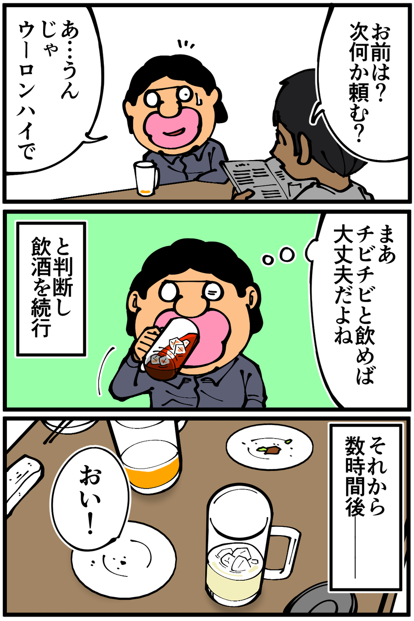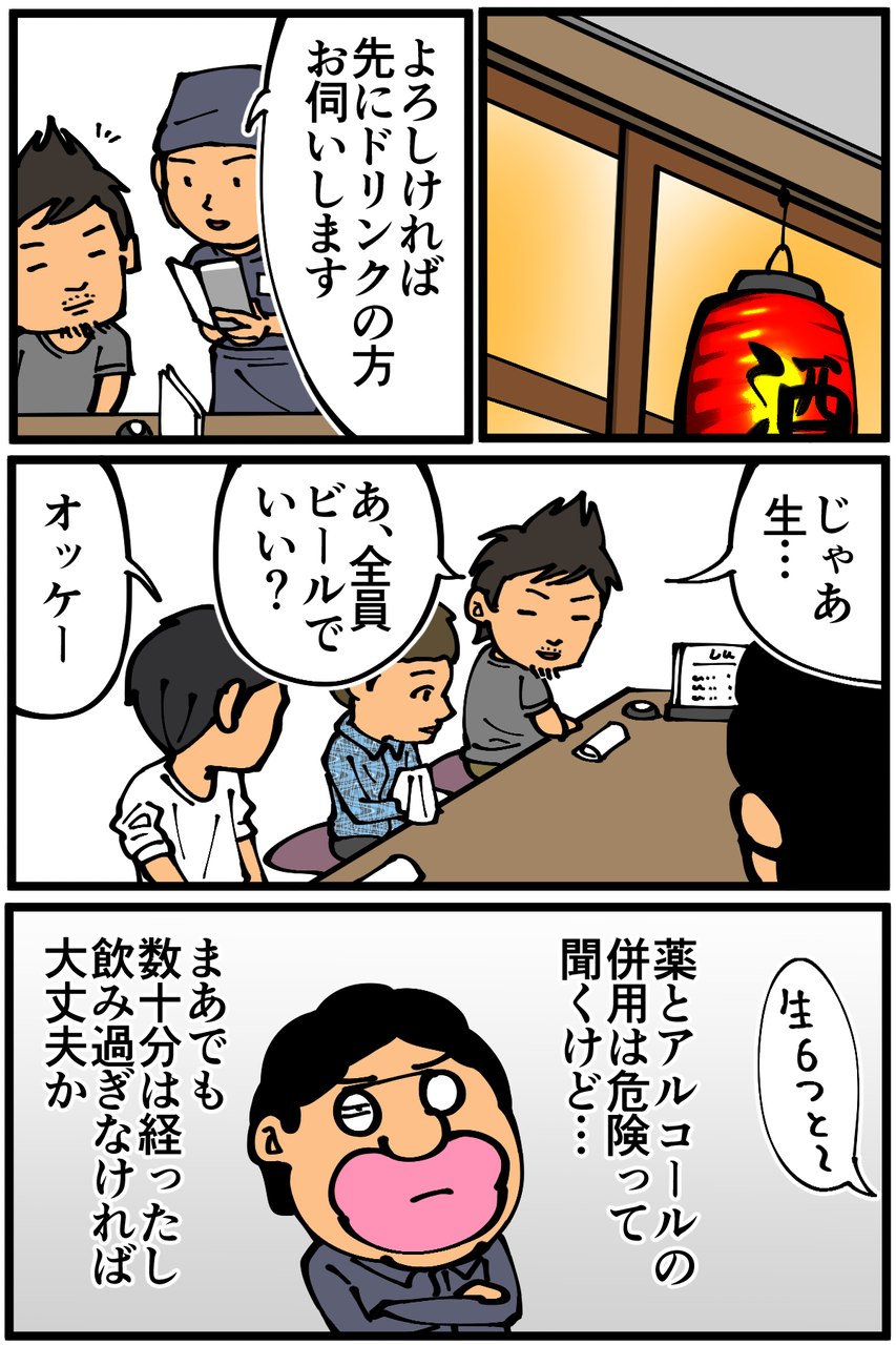 第1318話「身を以て感じた危険な組み合わせ②」 2023年02月10日 安アパートでカツカツな生活を送る男の漫画ブログです。金が底を尽きてくたばるようなことがなければ毎日更新します。過去の思い出話、前回の記事の続きです。次回に続きます。続き↓ 泥酔した人と遭遇した時の話↓ ●Twitterやってます。●Instagramでブログの過去記事など更新してます↓●登録していただくと更新通知がLINEで届きます↓●こちらのページから過去記事一覧が見られます↓●LINEスタンプ販売中です。 「絵日記」カテゴリの最新記事 「身を以て感じた危険な組み合わせ」カテゴリの最新記事 < 前の記事次の記事 > コメント コメント一覧 (26) 1. ウソデス 2023年02月10日 20:52 ?「おいおいおいおい」 ?「死んだわアイツ」 0 taikutsu_ken がしました 15. 退屈健 2023年02月15日 22:00 >>1 ?「ほう…咳止め薬とアルコールですか」 0 taikutsu_ken がしました 2. ガイモン 2023年02月10日 20:52 どうなる⁉️ 0 taikutsu_ken がしました 16. 退屈健 2023年02月15日 22:00 >>2 最悪の事態に…!笑 0 taikutsu_ken がしました 3. くろいろ 2023年02月10日 21:04 薬とアルコールはヤバいですね。私の場合は眠剤ですが、それだけでも多めに服用したら幻覚症状が出ました、小さいおじさん二人が殴り合いの喧嘩してました。 0 taikutsu_ken がしました 17. 退屈健 2023年02月15日 22:01 >>3 おおお、幻覚症状が!それは危険ですね…!😭 でも小さいおじさんのファイトはなんだか可愛らしいですね!笑 0 taikutsu_ken がしました 4. 時間の翼 2023年02月10日 21:28 てか先生でも風邪ひくんすね←超失礼w 0 taikutsu_ken がしました 18. 退屈健 2023年02月15日 22:02 >>4 ここ数年引きこもっていて忘れていたんですが実は以前は割と引きがちでした!笑 0 taikutsu_ken がしました 5. 山田 2023年02月10日 21:30 これが迷走神経反射失神編に繋がるわけですねわかります 0 taikutsu_ken がしました 19. 退屈健 2023年02月15日 22:03 >>5 繋がっていてもおかしくなかったですね!笑 0 taikutsu_ken がしました 6. 梨のトム 2023年02月10日 21:31 私もレクサプロ飲んでますがお酒入りのチョコですら食べないようにしてますー 0 taikutsu_ken がしました 20. 退屈健 2023年02月15日 22:03 >>6 そのくらい徹底して気を付けるのが正解でしたね~😭 0 taikutsu_ken がしました 7. ユーリ 2023年02月10日 21:57 ビールの後は、お酒にしなかったらまだよかった❓私は胃薬を炭酸水で飲んだら、お腹が破裂しほうになりました‼️笑 0 taikutsu_ken がしました 9. さやか 2023年02月10日 23:02 >>7 ? 0 taikutsu_ken がしました 21. 退屈健 2023年02月15日 22:04 >>7 せめてビールだけにとどめておくべきでしたね~😭 お腹が破裂しそうに!それは恐ろしい…! 0 taikutsu_ken がしました 8. なめこ 2023年02月10日 22:05 先生はこれからどうなる……って前に何か見たような(^_^;) 生きててよかった。 0 taikutsu_ken がしました 22. 退屈健 2023年02月15日 22:04 >>8 ありがとうございます、なんとか生きてました!笑 0 taikutsu_ken がしました 10. ゆきちお 2023年02月11日 00:12 こ、怖いな。 私もビールで薬飲むのやめよ。 0 taikutsu_ken がしました 23. 退屈健 2023年02月15日 22:04 >>10 併用はしない方が安全と思われます! 0 taikutsu_ken がしました 11. 美味いもん発見した 2023年02月11日 15:40 1・CMでよく見る「これうま!つゆ」と水を1/1で混ぜる(量はお好み) 2・それを沸かす 3・人参を一口サイズに切って沸かしたやつにぶち込む 4・人参が柔らかくなるまで待つ 5・完成!人参のこれうま!ゆで 0 taikutsu_ken がしました 12. 上手いもん発見した 2023年02月11日 15:42 >>11 俺空気読め無さすぎたw 0 taikutsu_ken がしました 24. 退屈健 2023年02月15日 22:05 >>11 おお、それは美味しそう!!ありがとうございます、試してみます! 0 taikutsu_ken がしました 13. 2−10(ニート) ※安全なブログです 2023年02月11日 21:58 ヤバいヤバいヤバいヤバい 0 taikutsu_ken がしました 25. 退屈健 2023年02月15日 22:05 >>13 ヤバさ満点でした…! 0 taikutsu_ken がしました 14. ゆきみだいふく 2023年02月13日 08:40 酒...先生...心配でしかないw 0 taikutsu_ken がしました 26. 退屈健 2023年02月15日 22:05 >>14 ご心配いただきありがとうございます😭 ヤバすぎました…!笑 0 taikutsu_ken がしました コメントフォーム 名前 コメント 記事の評価 リセット リセット 顔 星 情報を記憶 コメントを投稿する