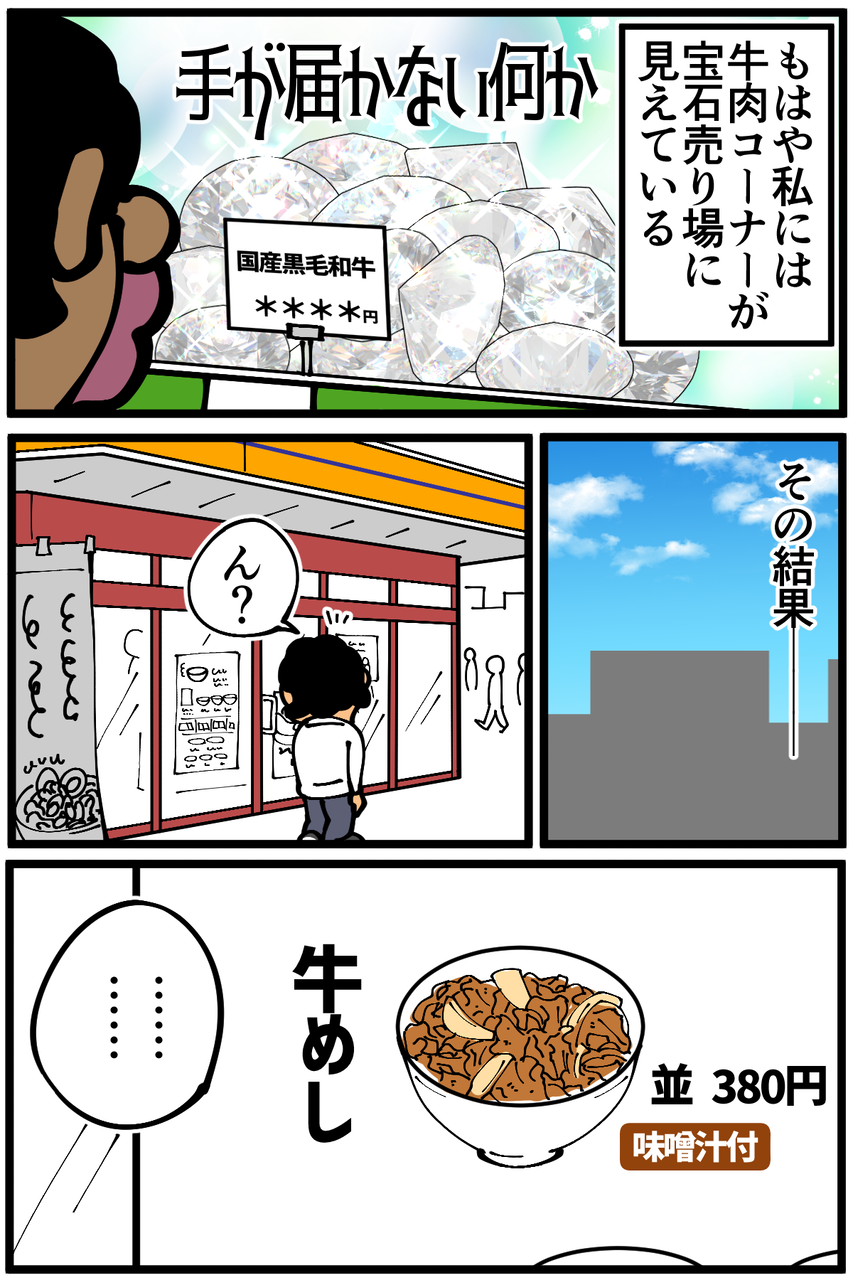 「牛肉」というのが自分の中で高貴な存在になり過ぎて牛丼屋もジュエリーショップに脳内変換されてます。ここ数年食べてなくて忘れてたんですが牛丼ってあんなに安かったんですね。