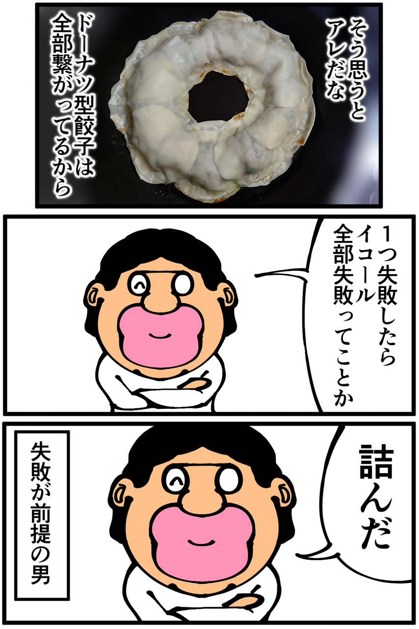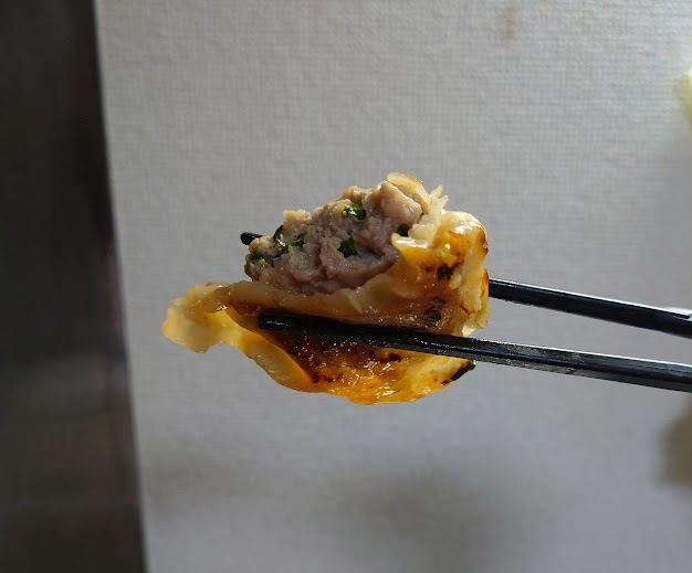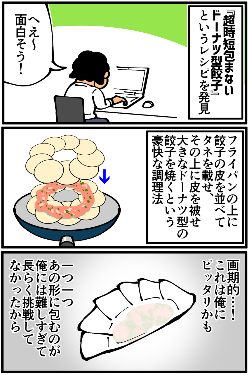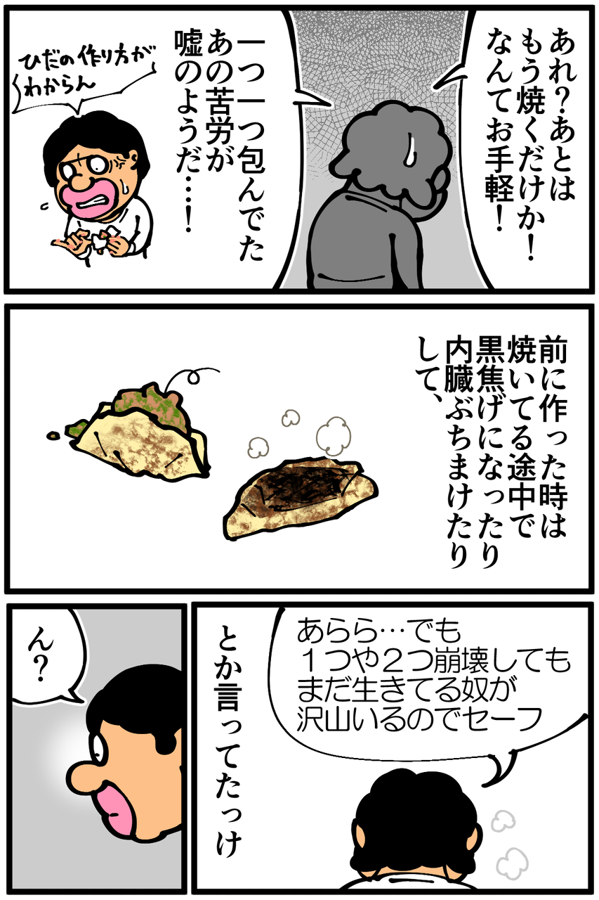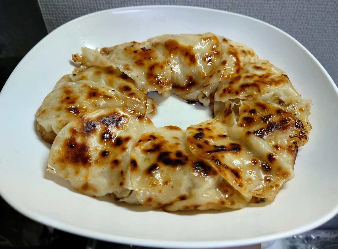 ちなみに漫画内で省いてしまった細かい工程は「タネに皮を被せた後に水40ccを加えてフタして中火で4分蒸し焼き→ごま油投入して焼き目付ける→ひっくり返して裏面も焼く」といった感じでした。