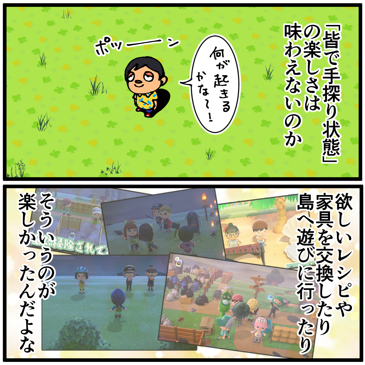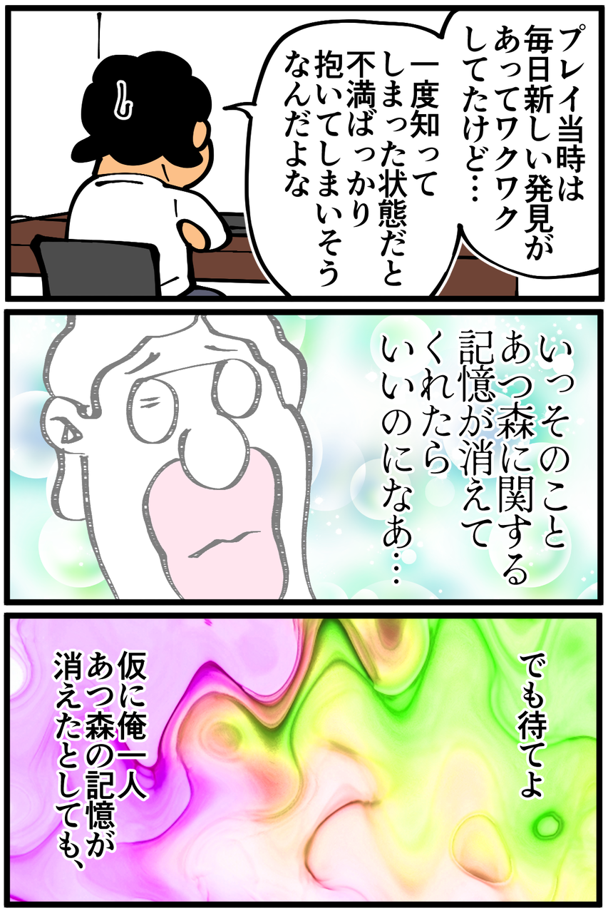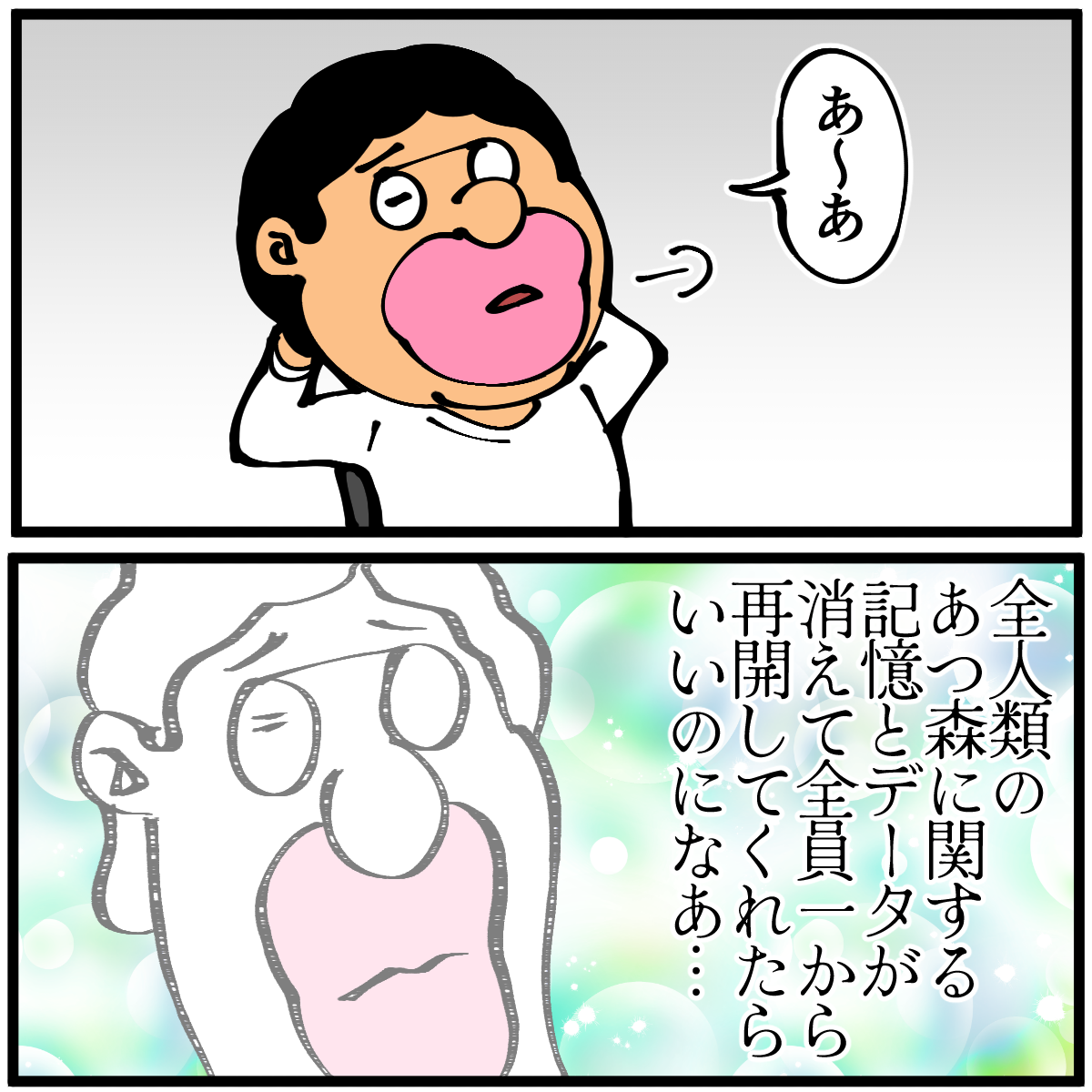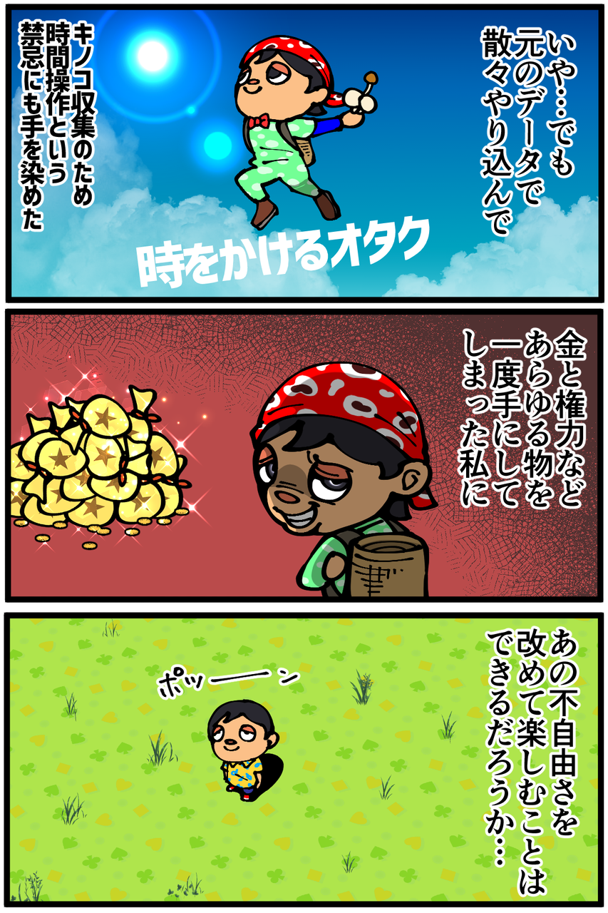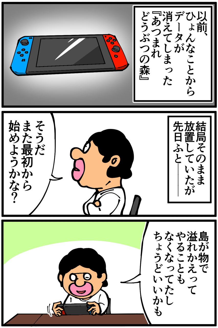 第1344話「願わくば」 2023年03月09日 安アパートでカツカツな生活を送る男の漫画ブログです。金が底を尽きてくたばるようなことがなければ毎日更新します。叶いそうにない。多分いつか再開するので今度は綺麗な島を作ろうと思います。ゲーム関連の記事一覧↓次の記事↓ データが消えた経緯↓ そもそも何も覚えていなくて新鮮な気持ちでプレイできる気もする↓ ●Twitterやってます。●Instagramでブログの過去記事など更新してます↓●登録していただくと更新通知がLINEで届きます↓●こちらのページから過去記事一覧が見られます↓●LINEスタンプ販売中です。 「絵日記」カテゴリの最新記事 < 前の記事次の記事 > コメント コメント一覧 (40) 1. なめこ 2023年03月09日 16:20 何気に怖いコト言ってますわね(笑) 0 taikutsu_ken がしました 15. 退屈健 2023年03月11日 03:42 >>1 恐ろしい願望です!笑 0 taikutsu_ken がしました 2. メイック 2023年03月09日 16:24 多分その時は次の「どうぶつの森」ですね。 0 taikutsu_ken がしました 16. 退屈健 2023年03月11日 03:42 >>2 次回作も今から既に楽しみです!!笑 0 taikutsu_ken がしました 3. 初投稿です 2023年03月09日 16:29 ポケ森放置してたの思い出しました!ありがとう先生! 0 taikutsu_ken がしました 17. 退屈健 2023年03月11日 03:43 >>3 ポケ森もいいですよね~!僕も再開しようかな…! 0 taikutsu_ken がしました 4. ゆきちお 2023年03月09日 16:37 そんなパラレルワールドに移動⁉️しないで下さいね 0 taikutsu_ken がしました 18. 退屈健 2023年03月11日 03:43 >>4 もしかしたら異世界に…!笑 0 taikutsu_ken がしました 5. 時間の翼アドバァァァアイス 2023年03月09日 16:41 もう次回作まで待つでごんすw 0 taikutsu_ken がしました 19. 退屈健 2023年03月11日 03:44 >>5 素直に待つのが正解かもですね!笑 0 taikutsu_ken がしました 6. 金欠マン 2023年03月09日 16:45 なんでデータが消えたのか教えて欲しいです!! 0 taikutsu_ken がしました 20. 退屈健 2023年03月11日 03:45 >>6 僕がSwitchを床に放置していたのが全ての原因なんですがその結果友人のお子さんにより…!笑 記事内に貼った過去記事に詳しく描いているのでもしよろしければ是非ご覧ください~!悲しみのストーリーです!笑 0 taikutsu_ken がしました 7. さんちゃん 2023年03月09日 17:00 わがや、Switchが四つあるので4つの島を作り直してるんですけど、めっちゃ楽しいのでご心配なく、楽しめます。 縛りを作るとより楽しい(1000万ベル溜まるまで部屋は増やさない、島の地形を変えない、住人厳選をしない とか) 0 taikutsu_ken がしました 21. 退屈健 2023年03月11日 03:47 >>7 おおお、なるほど!縛りプレイ楽しそうですね~!! 地形いじらないプレイでやってみようかな…! 0 taikutsu_ken がしました 8. スズメ 2023年03月09日 19:35 そういう空気を味わいたくて新作を楽しみに待っております 次は新ハードですかね🤔 0 taikutsu_ken がしました 22. 退屈健 2023年03月11日 03:47 >>8 新作楽しみですよね! 次世代ハード、最近噂されてますよね…! 0 taikutsu_ken がしました 9. ユーリ 2023年03月09日 19:42 私でしたら、あつ森の頭の記憶消えてますよ‼️ 0 taikutsu_ken がしました 23. 退屈健 2023年03月11日 03:47 >>9 消えてしまいましたか!笑 0 taikutsu_ken がしました 11. 通りすがりの名無し 2023年03月10日 18:43 ???「島での思い出はいったん忘れるんだなも。悪いんだけれど、君の記憶は消させてもらうも。」 先生、時間操作の次はプレイヤーの記憶操作に手をかけるのですね…! 0 taikutsu_ken がしました 12. 通りすがりの名無し(お詫び) 2023年03月10日 18:44 >>11 2回送ってしまいました…。ふざけたコメントでお恥ずかしい限りですが、10は誤字があるので削除してくださると幸いです。 0 taikutsu_ken がしました 25. 退屈健 2023年03月11日 03:48 >>12 承知しました!重複コメント削除いたしました~! 0 taikutsu_ken がしました 28. 通りすがりの名無し 2023年03月11日 17:15 >>25 お手数をおかけしてしまいました…。対応してくださりありがとうございました! 0 taikutsu_ken がしました 24. 退屈健 2023年03月11日 03:48 >>11 記憶の操作、あまりにも恐怖ですね!笑 0 taikutsu_ken がしました 13. ゆきみだいふく 2023年03月10日 22:00 なにを望んでるんだアンタは…w 0 taikutsu_ken がしました 26. 退屈健 2023年03月11日 03:49 >>13 恐ろしい願望が…!笑 0 taikutsu_ken がしました 14. 舞茸 2023年03月10日 23:19 わかりみが深いw 私はとび森でチートを尽くし お金が腐る程あったので、 そこで完結『燃え尽きた』してしまいました。 それを一からまたサメ釣れんかな〜コツコツ やるなんて無理っぽいです。w(๑˃̵ᴗ˂̵) 0 taikutsu_ken がしました 27. 退屈健 2023年03月11日 03:49 >>14 一度全てを手にしてしまうと元には戻れなくなっちゃいますよね!笑 0 taikutsu_ken がしました 29. 金欠マン 2023年03月12日 09:59 お金(ベル)を増やしたいなら案内所を建てて、景気アップ条例にした後、商店の高額買取品におさつの山と出た時に一個でも作って売れば6万ベル弱の儲けがでるので、そこまで進めてためしてみて下さい。(やればの話だけど) 0 taikutsu_ken がしました 30. 退屈健 2023年03月12日 18:13 >>