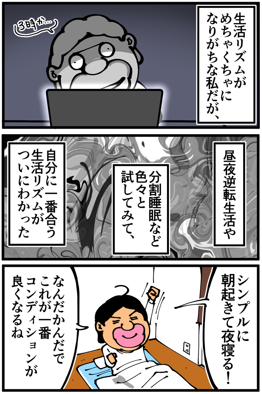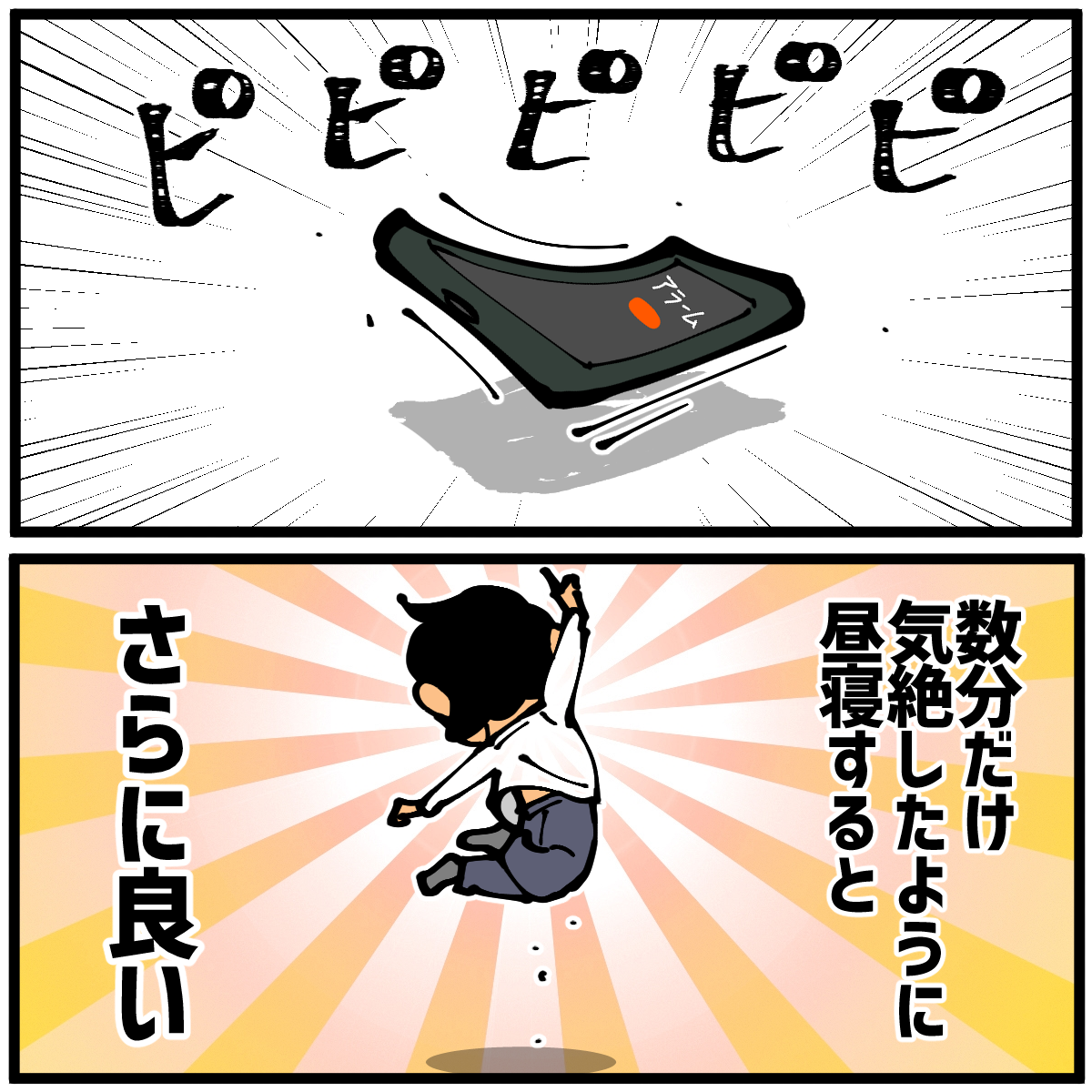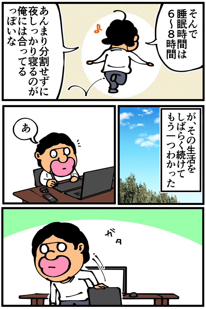 調べてみたら「20分の昼寝が最も効果的」という情報があったんですが、私の場合20分寝ると身体が本格的に寝ようとしてしまう感じがして起きた時ちょっとキツかったのでほんの数分寝るのが合ってました。漫画内にも描いてますが睡眠と言うより気絶に近い。実際は身体に良くない気もする。
