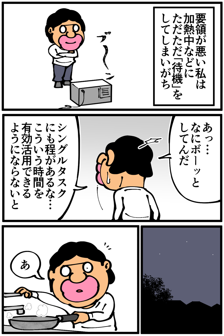 第1384話「待機時間の有効活用」 2023年04月23日 安アパートでカツカツな生活を送る男の漫画ブログです。金が底を尽きてくたばるようなことがなければ毎日更新します。どうしても気になってしまう!マルチタスク型の人間になりたい。次の記事↓ 大事にお手入れしたい↓ シングルタスク型に加えてさらに問題がある↓ ●Twitterやってます。●Instagramでブログの過去記事など更新してます↓●登録していただくと更新通知がLINEで届きます↓●こちらのページから過去記事一覧が見られます↓●LINEスタンプ販売中です。 「絵日記」カテゴリの最新記事 < 前の記事次の記事 > コメント コメント一覧 (43) 1. ウソデス 2023年04月23日 22:20 待機時間中にラジオ体操とかすればマルチタスクですよ 0 taikutsu_ken がしました 23. 退屈健 2023年05月01日 11:42 >>1 なるほど!確かに運動不足を解消すべき時間かもしれないですね! 0 taikutsu_ken がしました 2. 時間の翼アドバァァァアイス 2023年04月23日 22:22 私はこういう待ち時間 お気に入りのブログみてます 底辺絵描き 退屈健の 毎日カツカツ生活 ってブログです 先生にもオススメしますw 0 taikutsu_ken がしました 7. 通りすがりの名無し 2023年04月23日 23:15 >>2 あっ!私もそのブログ大好きです! よく待ち時間に読んでます! 0 taikutsu_ken がしました 24. 退屈健 2023年05月01日 11:42 >>2 ありがとうございます!!笑 読んでいただけて嬉しい限りです!!😭 0 taikutsu_ken がしました 3. けたこ 2023年04月23日 22:24 筋トレとかどうでしょう 1分で出来るメニューとか3分5分10分みたいにコース作っておいて 待機時間に合わせて一石二鳥を狙う 0 taikutsu_ken がしました 25. 退屈健 2023年05月01日 11:43 >>3 待ち時間に必ずするようにしたらサボることもなくなりそうで確かに良いですね…!! 0 taikutsu_ken がしました 4. 884 2023年04月23日 22:34 待機時間で出来る程度の拭き掃除してます。軽い気持ちでやれる感じの。 レンジ、冷蔵庫、台所、洗濯機の上とかバン、スイッチの手垢……みたいな。 0 taikutsu_ken がしました 26. 退屈健 2023年05月01日 11:44 >>4 拭き掃除いいですね! 確かにちょっとした掃除にちょうどいい時間…! 0 taikutsu_ken がしました 5. 紅茶スキー 2023年04月23日 23:04 サンバ踊りましょう。サンバ 痩せますよ 0 taikutsu_ken がしました 27. 退屈健 2023年05月01日 11:45 >>5 待ち時間にサンバ!まずはサンバを踊れるようにならないと…!笑 0 taikutsu_ken がしました 6. 通りすがりの名無し 2023年04月23日 23:13 俎板や包丁を洗う…かなぁと漠然と考えたのですが、そっか、ラジオ体操だったりサンバだったり踊ればカロリー消費にもなって一石二鳥ですね! よく職場で弁当をレンチンするんですが、私も無意味にレンジを眺めてることがよくあります。 テレビ観ながら会話とか、掃除しながら電話とかどうもあまり上手くできないタイプです。 0 taikutsu_ken がしました 28. 退屈健 2023年05月01日 11:46 >>6 わかります! 何かを観ながらの会話、僕も出来ないタイプです…😭笑 0 taikutsu_ken がしました 8. やゆ 2023年04月23日 23:15 私も「電子レンジを見つめている暇があったらフライパン洗うとかお箸を出すとかできることしなさい!」っていつも怒られます。 で、そっちをやり始めると今度はレンジのことを忘れるんですよね…。 鳴っても「今手が塞がってるから後で取ろう…」でそのまま。 料理の手際がいい人に憧れます。 0 taikutsu_ken がしました 29. 退屈健 2023年05月01日 11:46 >>8 あるあるですね~!洗い物し始めたらそのままレンジのことを忘れてしまったり…!笑 0 taikutsu_ken がしました 9. ぐりぐら 2023年04月23日 23:28 自分はご飯食べてから洗い物するので、 アツアツな事ないです〜。 0 taikutsu_ken がしました 30. 退屈健 2023年05月01日 11:48 >>9 なるほど!ちょうど冷めそうなので食べてから洗った方がよさそうですね! 0 taikutsu_ken がしました 10. チリン 2023年04月23日 23:32 先生の待機している姿 かわいい! ハッとする所も笑 0 taikutsu_ken がしました 31. 退屈健 2023年05月01日 11:48 >>10 とんでもないです、ありがとうございます!笑 0 taikutsu_ken がしました 11. ゆきちお 2023年04月24日 05:27 レンチン中に別の事やると忘れちゃうから、レンジの前で体操してます。腰や腕をぐるぐる🌀してる 0 taikutsu_ken がしました 32. 退屈健 2023年05月01日 11:48 >>11 いいですね!僕も運動不足解消兼ねてやろうかな…! 0 taikutsu_ken がしました 12. 2−10(ニート) ※安全なブログです 2023年04月24日 08:24 漫画読むとかでいいんじゃないんですかね〜 あと、先生でしたら、絵を描くとか。 0 taikutsu_ken がしました 33. 退屈健 2023年05月01日 11:49 >>12 それもいいですね!あたしンちを横に常備しておきます!笑 0 taikutsu_ken がしました 13. ななし 2023年04月24日 10:05 スマホいじっとくのが一番手軽では? 0 taikutsu_ken がしました 34. 退屈健 2023年05月01日 11:49 >>13 それが正解かもですね!笑 0 taikutsu_ken がしました 14. まあ 2023年04月24日 11:40 動画見たり音楽聴くのはどうですか? わたしはあたしンち再生してますw 0 taikutsu_ken がしました 35. 退屈健 2023年05月01日 11:50 >>14