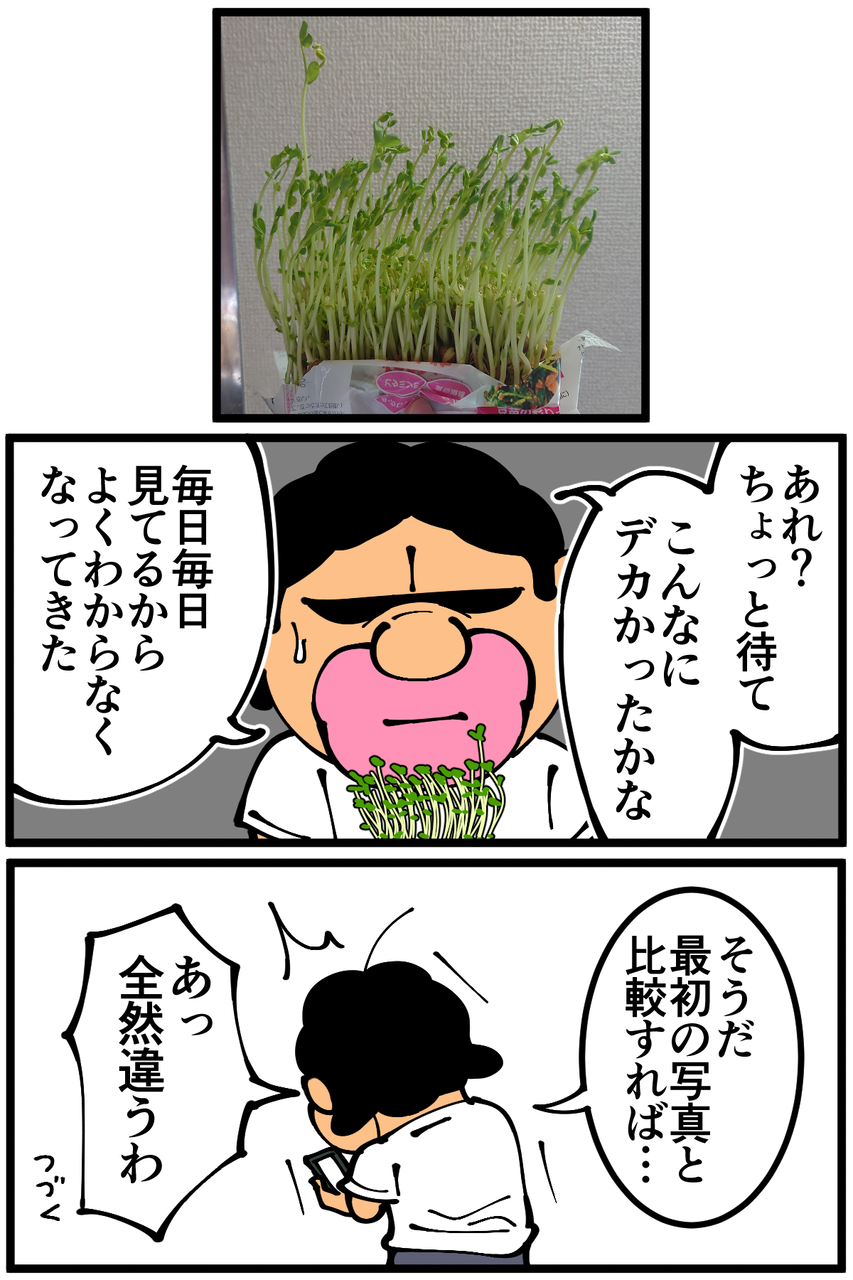 第1422話「豆苗の再生栽培に挑戦・前編」 2023年05月31日 安アパートでカツカツな生活を送る男の漫画ブログです。金が底を尽きてくたばるようなことがなければ毎日更新します。分けるような話でもないんですが後編に続きます。次の記事↓ かいわれ大根の再生栽培で起きた悲劇↓ 前は豆食べたりしていた↓ ●Twitterやってます。●Instagramでブログの過去記事など更新してます↓●登録していただくと更新通知がLINEで届きます↓●こちらのページから過去記事一覧が見られます↓●LINEスタンプ販売中です。 「絵日記」カテゴリの最新記事 < 前の記事次の記事 > コメント コメント一覧 (30) 1. 豆子 2023年05月31日 22:10 日光に当てるとぐんぐん大きくなりますよ~(*^^*) 万能ねぎやミツバもオススメ✨ 0 taikutsu_ken がしました 13. 退屈健 2023年06月01日 18:10 >>1 おお、万能ねぎとミツバもいけますか! 色々育ててみたい…! 0 taikutsu_ken がしました 2. あんこ 2023年05月31日 22:11 太陽の方を向いて育つので向きを変えながら育てるといいですよ(⊙ө⊙) 0 taikutsu_ken がしました 14. 退屈健 2023年06月01日 18:13 >>2 なるほど!確かに光の方に向かって伸びてますね! くるくる回すべきだった…!笑 0 taikutsu_ken がしました 3. ななしこ 2023年05月31日 22:30 豆苗マスター阿佐ヶ谷姉妹いわく3回はいけると言ってたような。 続きに期待。 0 taikutsu_ken がしました 15. 退屈健 2023年06月01日 18:13 >>3 阿佐ヶ谷姉妹は豆苗マスターでしたか!笑 そして3回もいけたとは…!! 0 taikutsu_ken がしました 4. 時間の翼アドバァァァアイス 2023年05月31日 22:38 豆苗いいですね。 0 taikutsu_ken がしました 16. 退屈健 2023年06月01日 18:13 >>4 コスパ最強ですね! 0 taikutsu_ken がしました 5. 水漏れ回避 2023年05月31日 22:50 綺麗に洗った肉のトレーにのせて栽培するといいですよー 0 taikutsu_ken がしました 17. 退屈健 2023年06月01日 18:13 >>5 なるほど、そんな使い道が!! 0 taikutsu_ken がしました 6. ピノコ 2023年05月31日 23:08 たまたま持ってたジップロックコンテナの300mlのやつがジャストサイズだったので、 豆苗栽培に使ってます! 100均とかでも専用容器売ってたりしますが、 買うまでもないですよねー(^○^) 豆苗はニンニクと鶏がらスープで炒めがオススメ! 他の材料無しでも充分美味しい♡ 0 taikutsu_ken がしました 18. 退屈健 2023年06月01日 18:14 >>6 おお、それはいいですね!ちょうどいいサイズの容器、なかなか難しいところですよね…! 豆苗のスープ美味しそうですね~! 0 taikutsu_ken がしました 7. ゆきちお 2023年06月01日 04:36 ウチは2回目まで頑張ったけど、根っこが盛り上がり過ぎてカビ生えてきたから諦めました。 XO醤で炒めると美味しいと聞いたけどXO醤が高くてコレも諦めました💦 センセ〜の豆苗がんばれ‼️ 0 taikutsu_ken がしました 19. 退屈健 2023年06月01日 18:17 >>7 XO醤僕も気になってます!お高いんですね…!😭 0 taikutsu_ken がしました 8. ユーリ 2023年06月01日 06:48 先生、まだですよ〜。まだ食べちゃダメですよー。 0 taikutsu_ken がしました 20. 退屈健 2023年06月01日 18:17 >>8 いきたいところですが我慢ですね!笑 0 taikutsu_ken がしました 9. けいこ 2023年06月01日 09:50 ダイソーに豆苗育てる用の容器売ってますよ 水の取り替えやすいように水切りカゴが中に入っててすごく便利です 0 taikutsu_ken がしました 21. 退屈健 2023年06月01日 18:18 >>9 ダイソーにありますか!!ありがとうございますチェックしてみます! 0 taikutsu_ken がしました 10. kuri 2023年06月01日 11:45 肉のトレーいいですよ。 0 taikutsu_ken がしました 22. 退屈健 2023年06月01日 18:19 >>10 トレーにそんな有効活用法があったとは…!! 0 taikutsu_ken がしました 11. 金欠マン 2023年06月01日 14:43 豆苗ここにきて再登場! 今度はさすがに豆は食べなさそう 0 taikutsu_ken がしました 23. 退屈健 2023年06月01日 18:19 >>11 今回は豆は食べませんでした!笑 0 taikutsu_ken がしました 12. 老猫 2023年06月01日 15:29 初コメ失礼します。私も数日前、豆苗栽培してて気づいたのだけど豆苗の数が減らされてる?! 土台が以前より明らかに小さくなってました。 値上げの影響がこんなとこにも響いてて悲しかったです😢 0 taikutsu_ken がしました 24. 退屈健 2023年06月01日 18:19 >>12 初めまして!コメントありがとうございます! おお、数が減ってましたか!!それは悲しい…😭 0 taikutsu_ken がしました 25. 金欠マン 2023年06月01日 18:56 退屈先生のスイッチにフレンドコード申請よろしいでしょうか? 0 taikutsu_ken がしました 27. 退屈健 2023年06月01日 22:45 >>25 大丈夫ですよ~! 0 taikutsu_ken がしました 26. 2−10(ニート) ※安全なブログです 2023年06月01日 20:46 おお!! めっちゃ育ってる!!! 0 taikutsu_ken がしました 28. 退屈健 2023年06月01日 22:46 >>26 めっちゃ育ちました!! 0 taikutsu_ken がしました 29. 小手毬 2023年06月01日 23:45 ホントに、分けるほどの話じゃない!(笑) 豆苗、誰でも育てられて 失敗知らずですよ♪ お得ですよね☆ 0 taikutsu_ken がしました 30. 退屈健 2023年06月11日 00:53 >>29 わざわざ分けてしまいすみません!笑 本当得した気分になりますね~! 0 taikutsu_ken がしました コメ