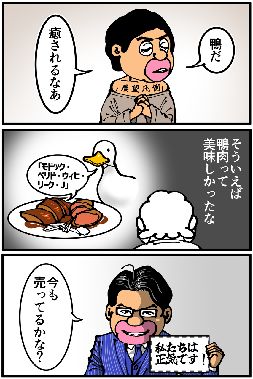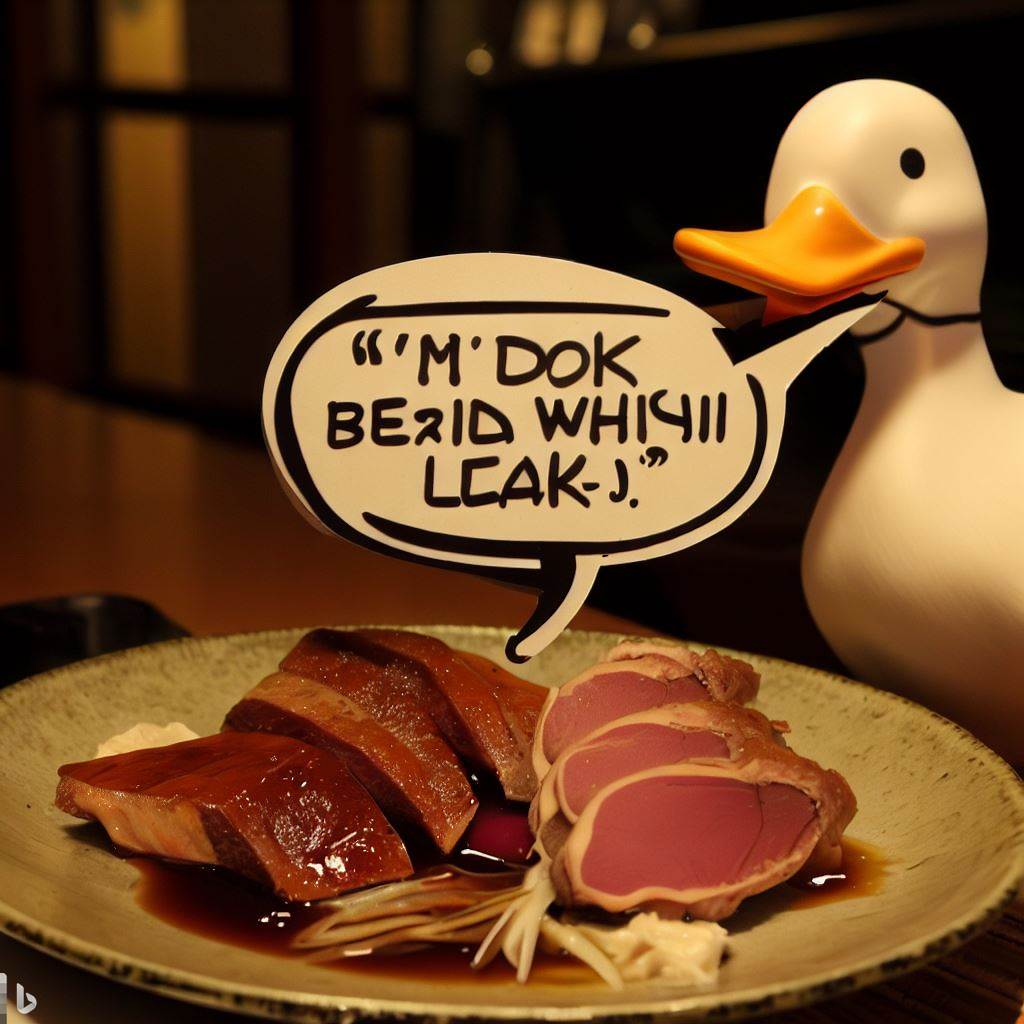 鴨の置き物と肉がハモるように何か喋ってますね。調理済みの肉に喋らせるケースは珍しい気がする。